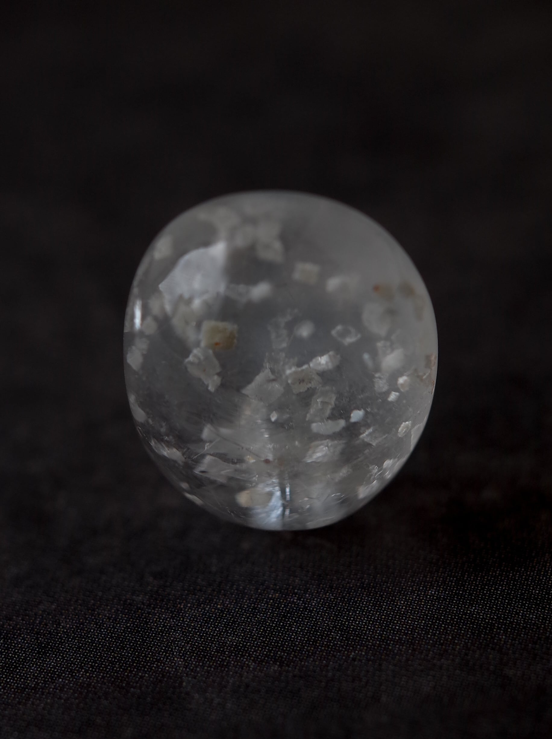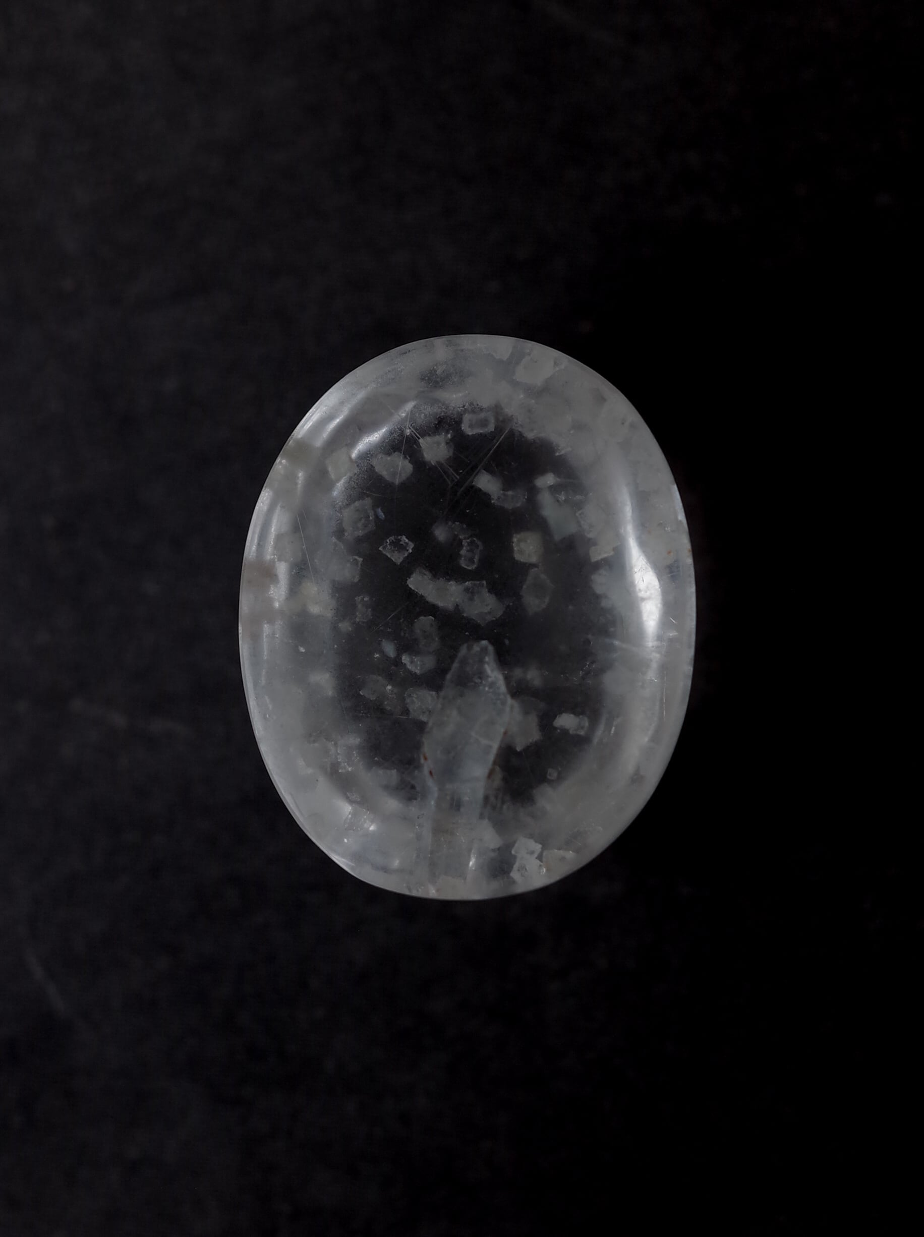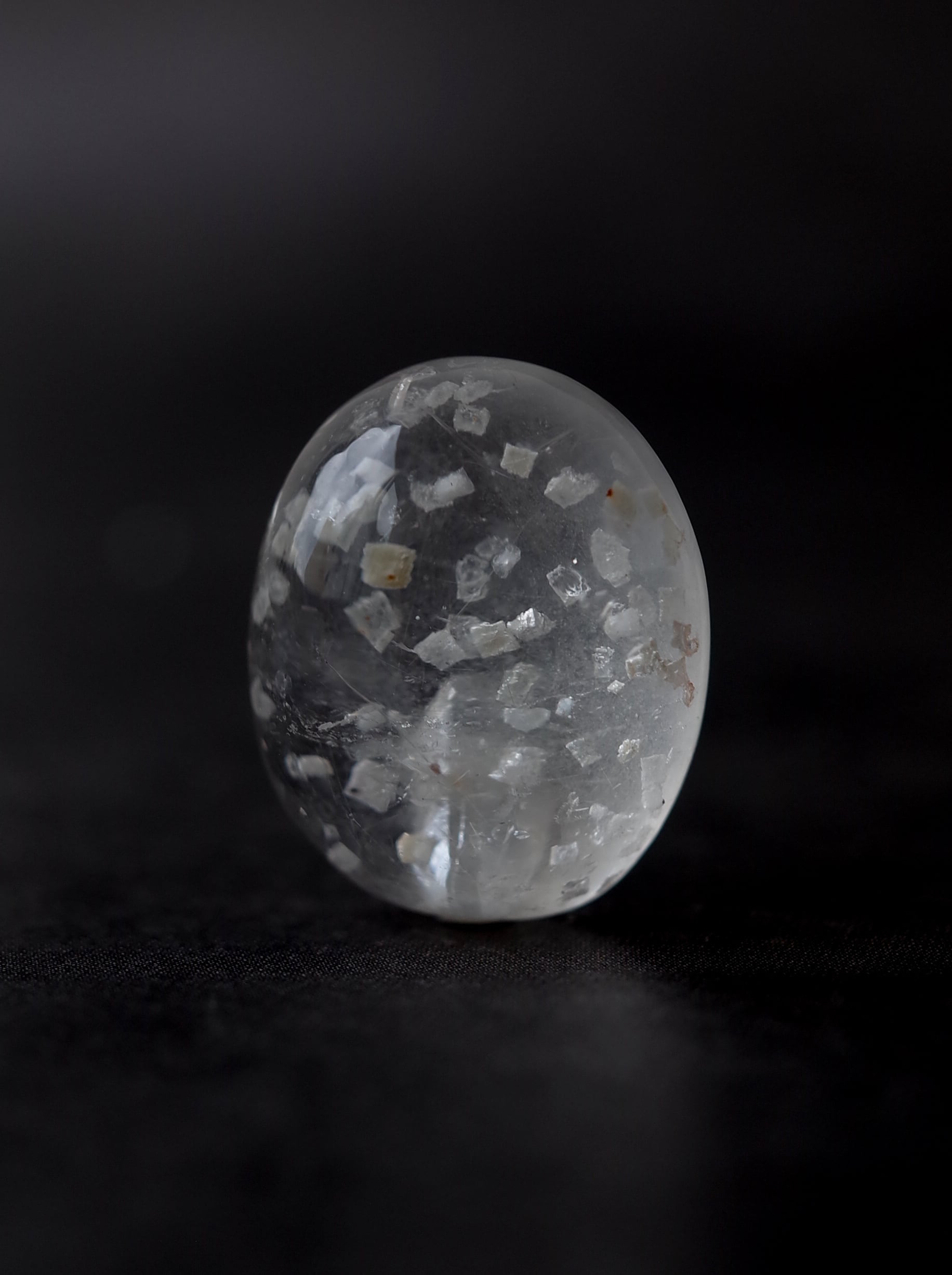 This is a Calcite-in-Quartz that feels perfect for winter, evoking the image of snow gently and endlessly falling through tiny calcite crystals. While calcite is often included as solid, three-dimensional crystals, in this piece the crystals are exceptionally thin and translucent, giving the stone a soft, delicate, and ephemeral beauty.