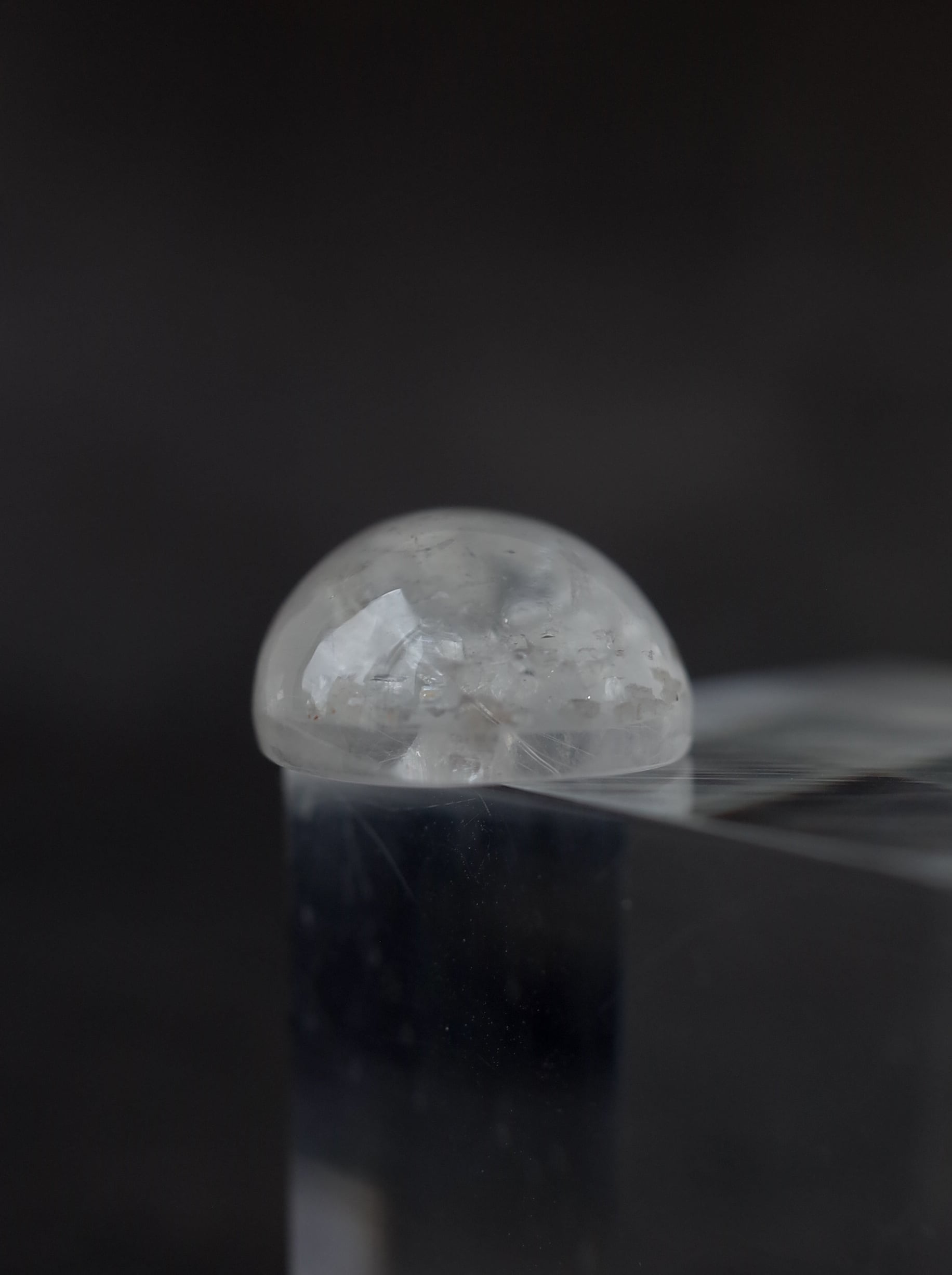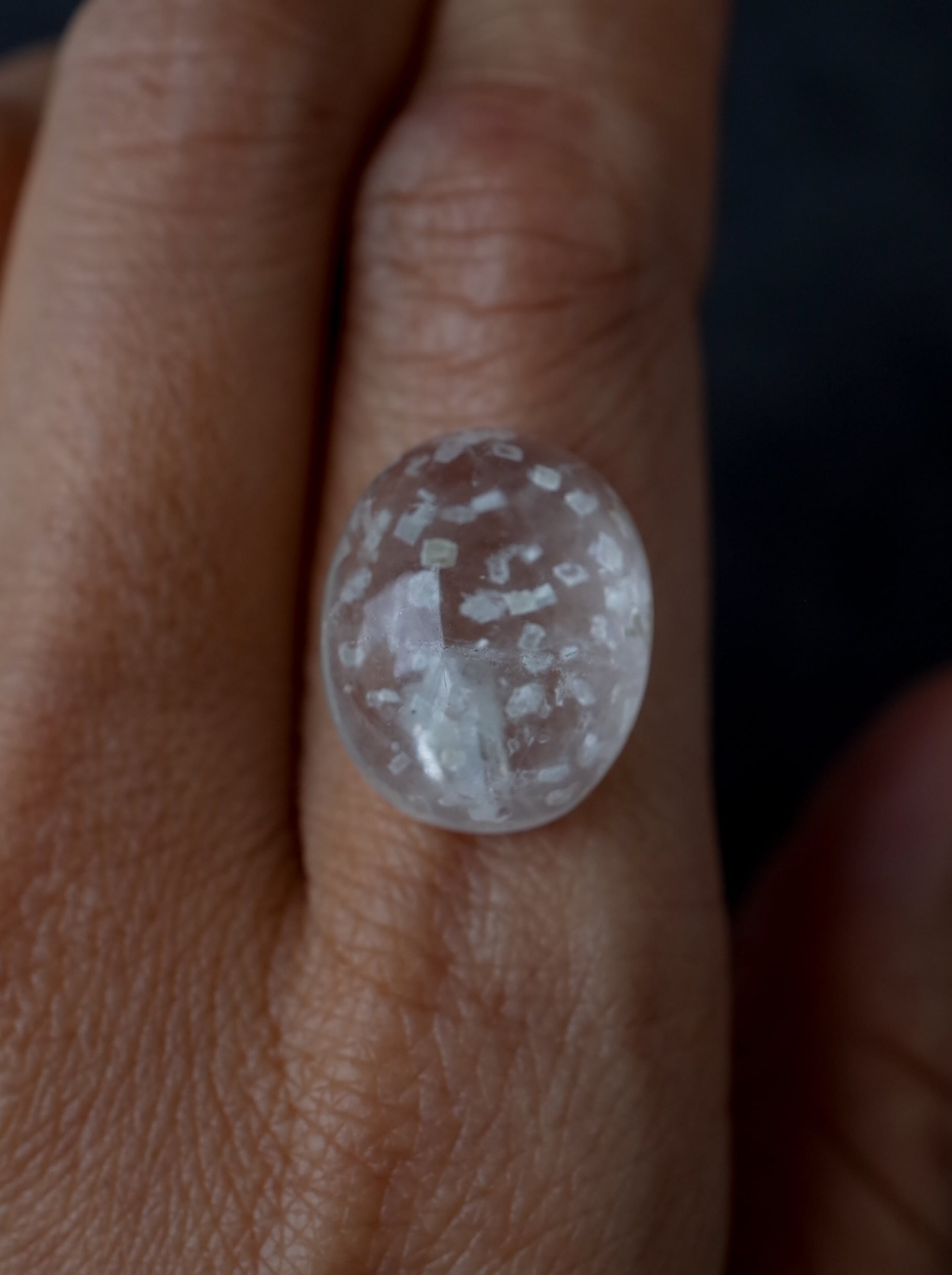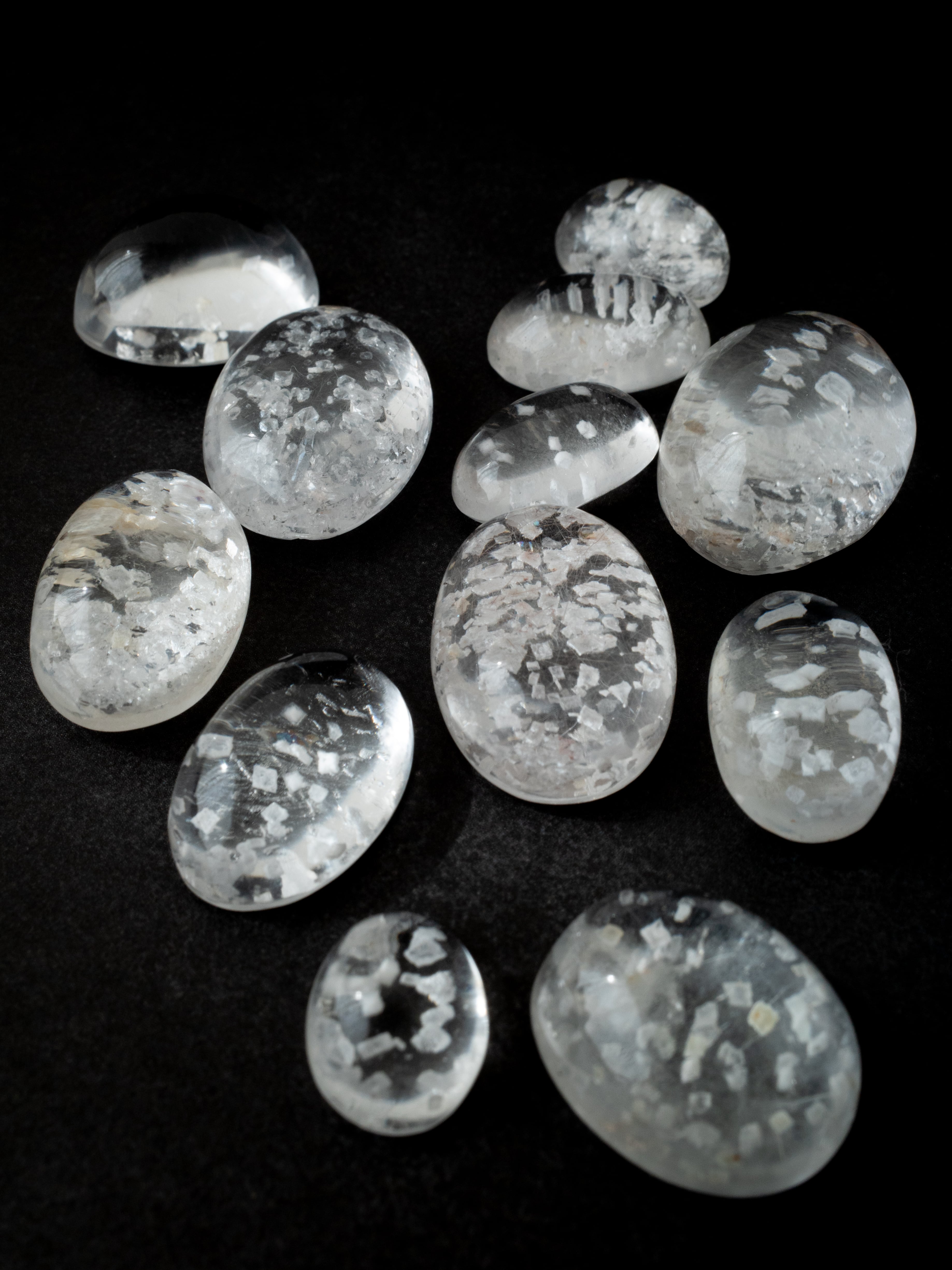 This is a Calcite-in-Quartz that feels perfect for winter, evoking the image of snow gently and endlessly falling through tiny calcite crystals. While calcite is often included as solid, three-dimensional crystals, in this piece the crystals are exceptionally thin and translucent, giving the stone a soft, delicate, and ephemeral beauty.