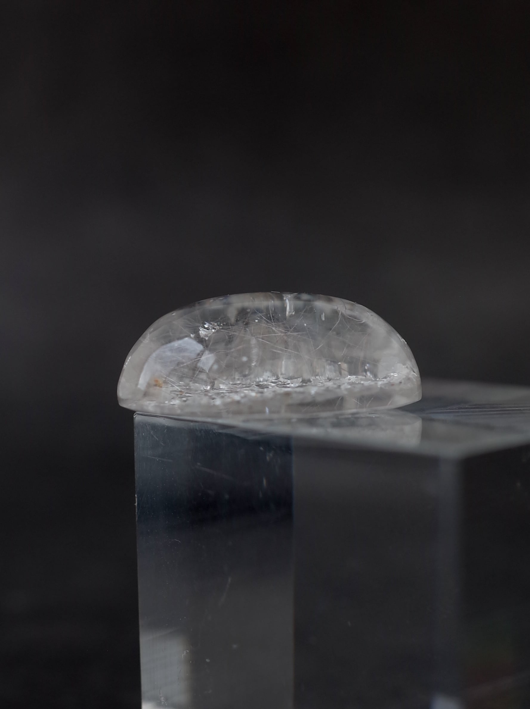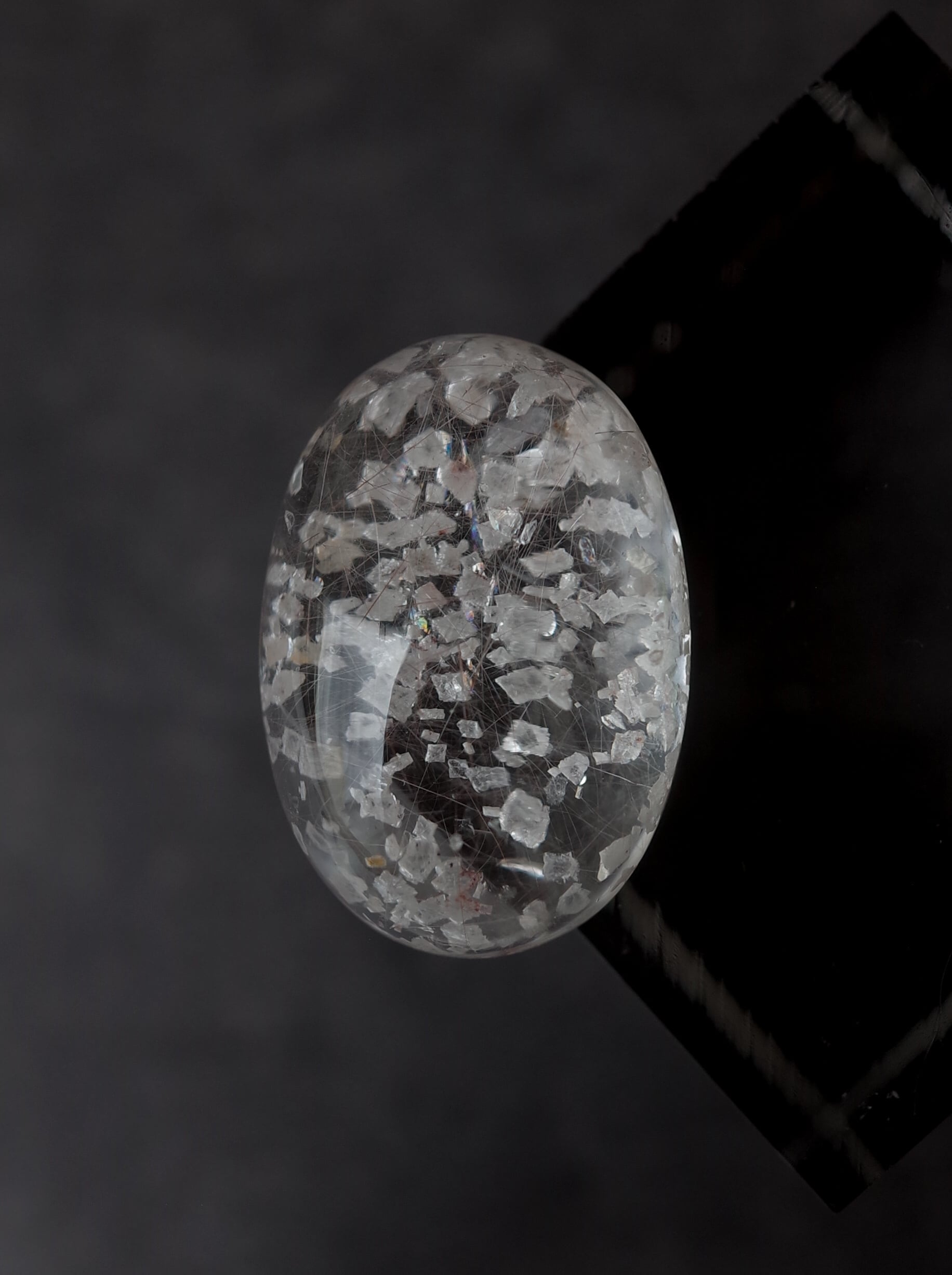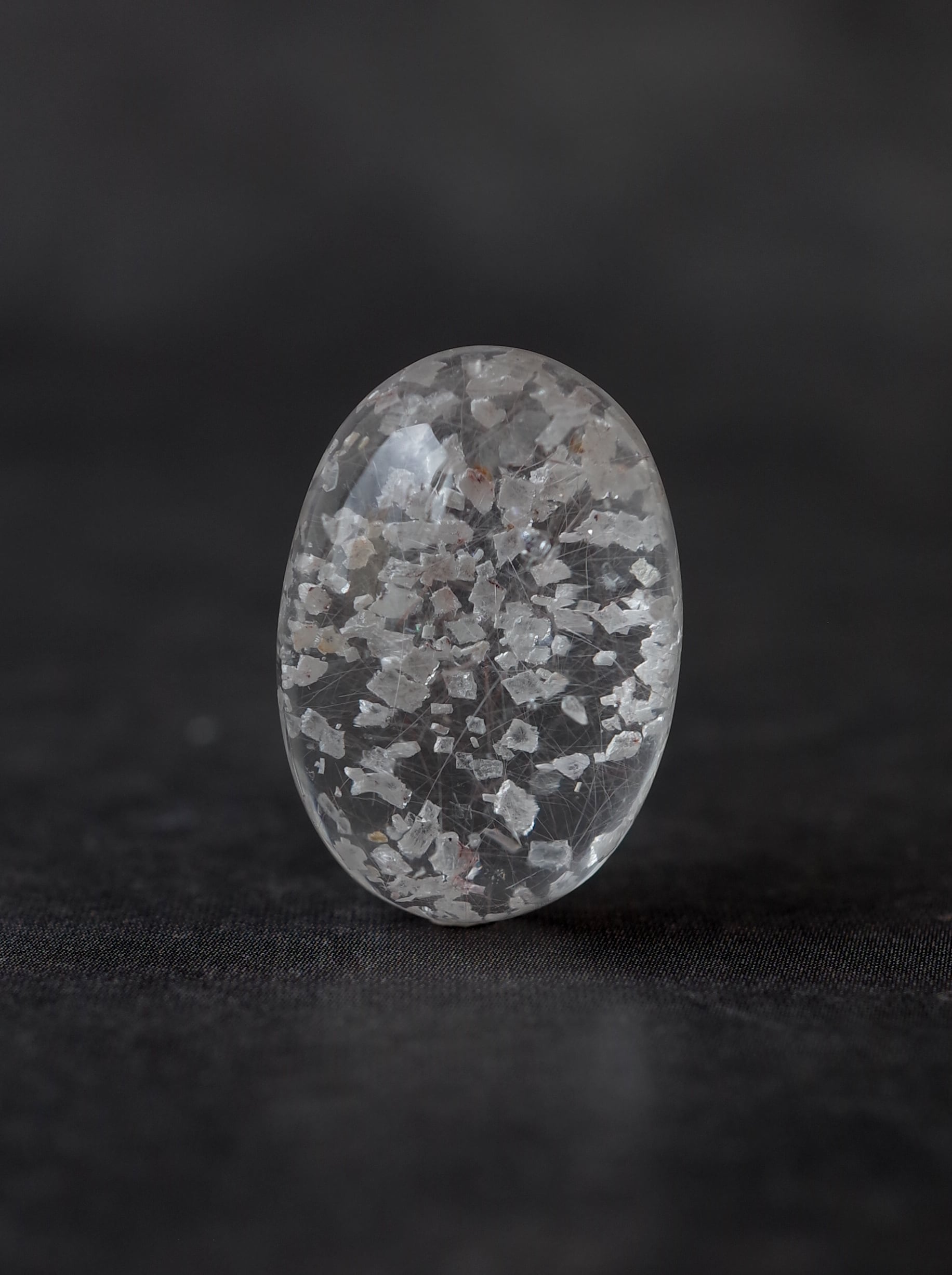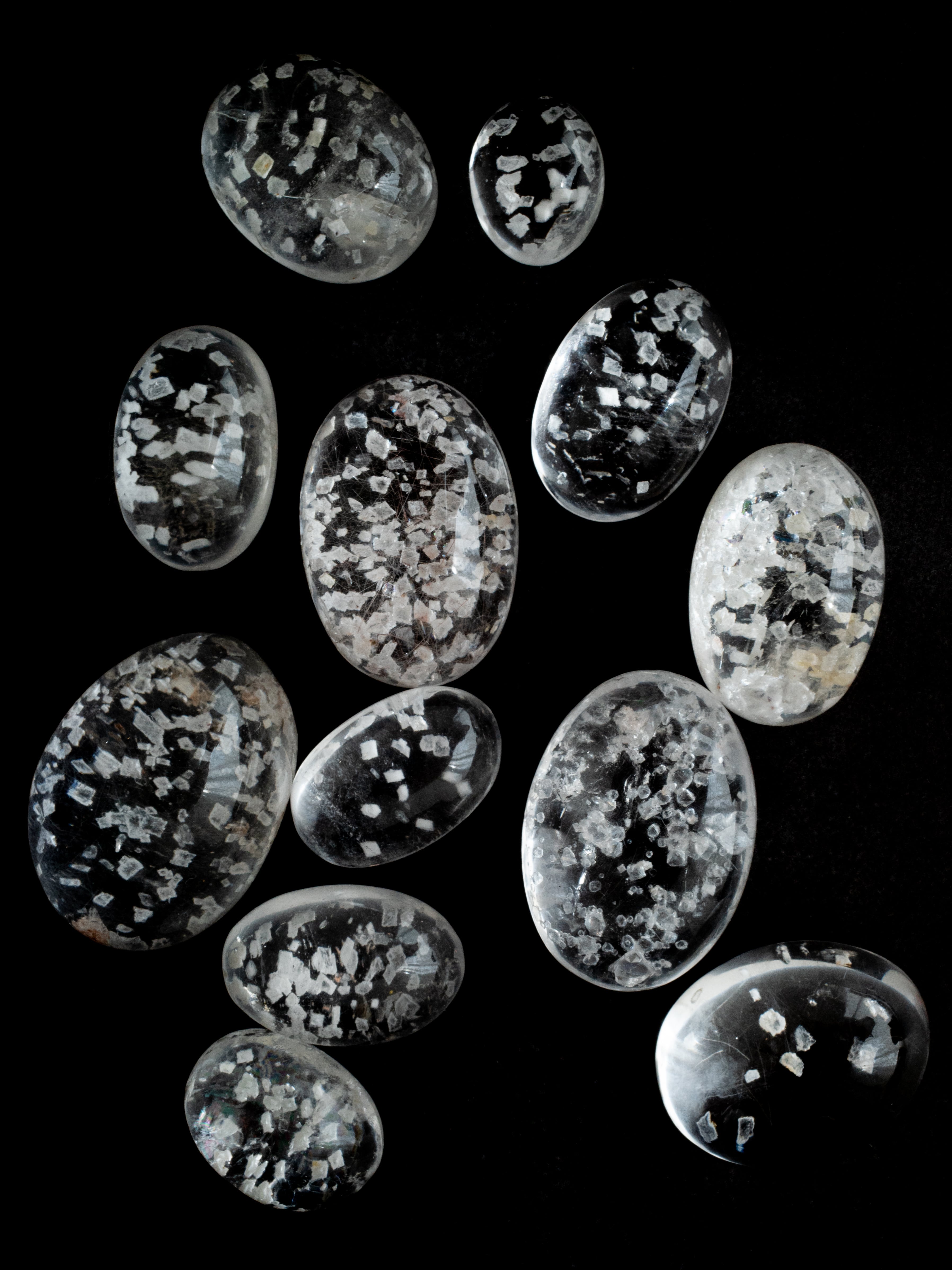 This is a Calcite-in-Quartz that feels perfect for winter, evoking the image of snow gently and endlessly falling through tiny calcite crystals. While calcite is often included as solid, three-dimensional crystals, in this piece the crystals are exceptionally thin and translucent, giving the stone a soft, delicate, and ephemeral beauty.