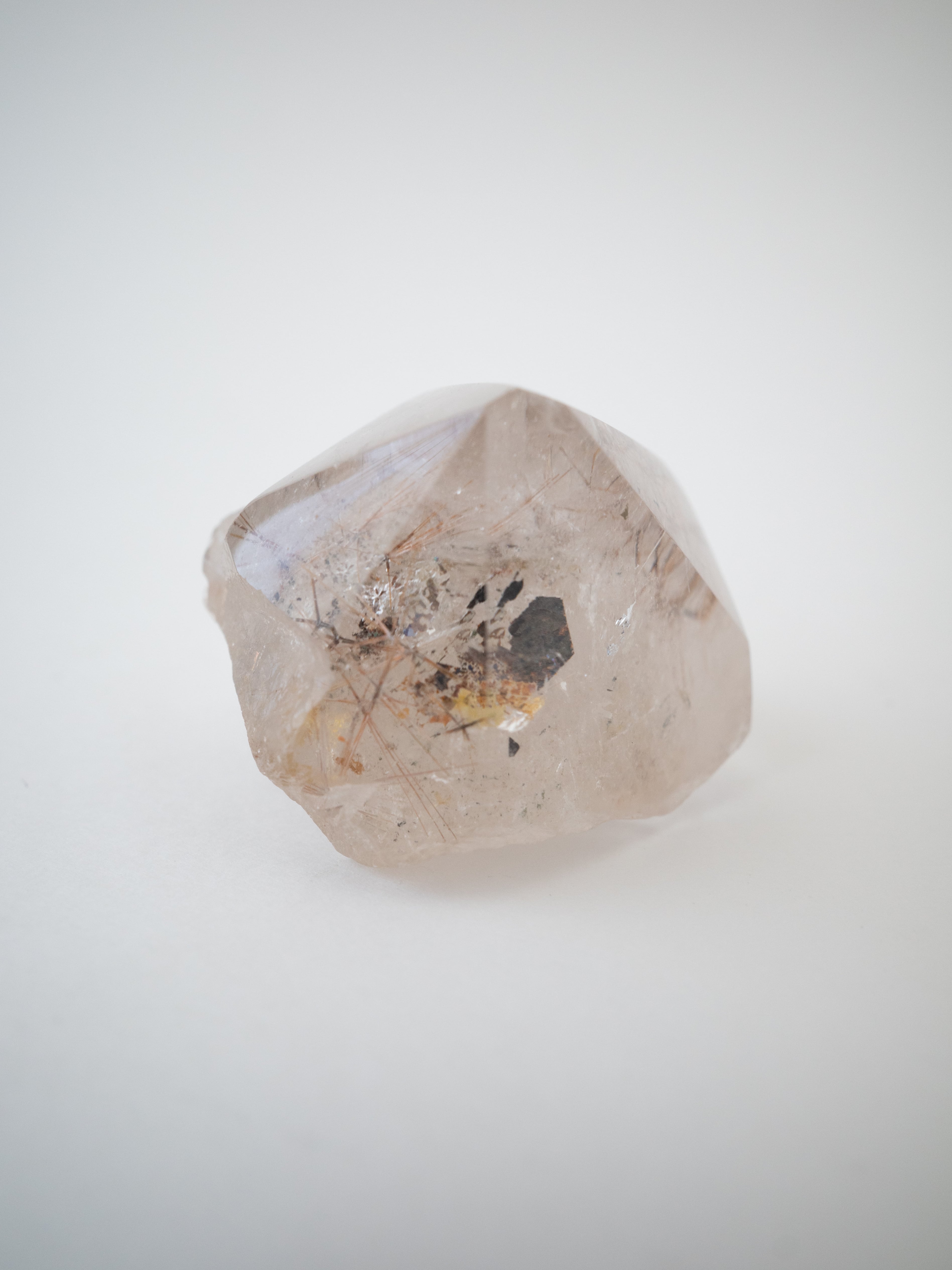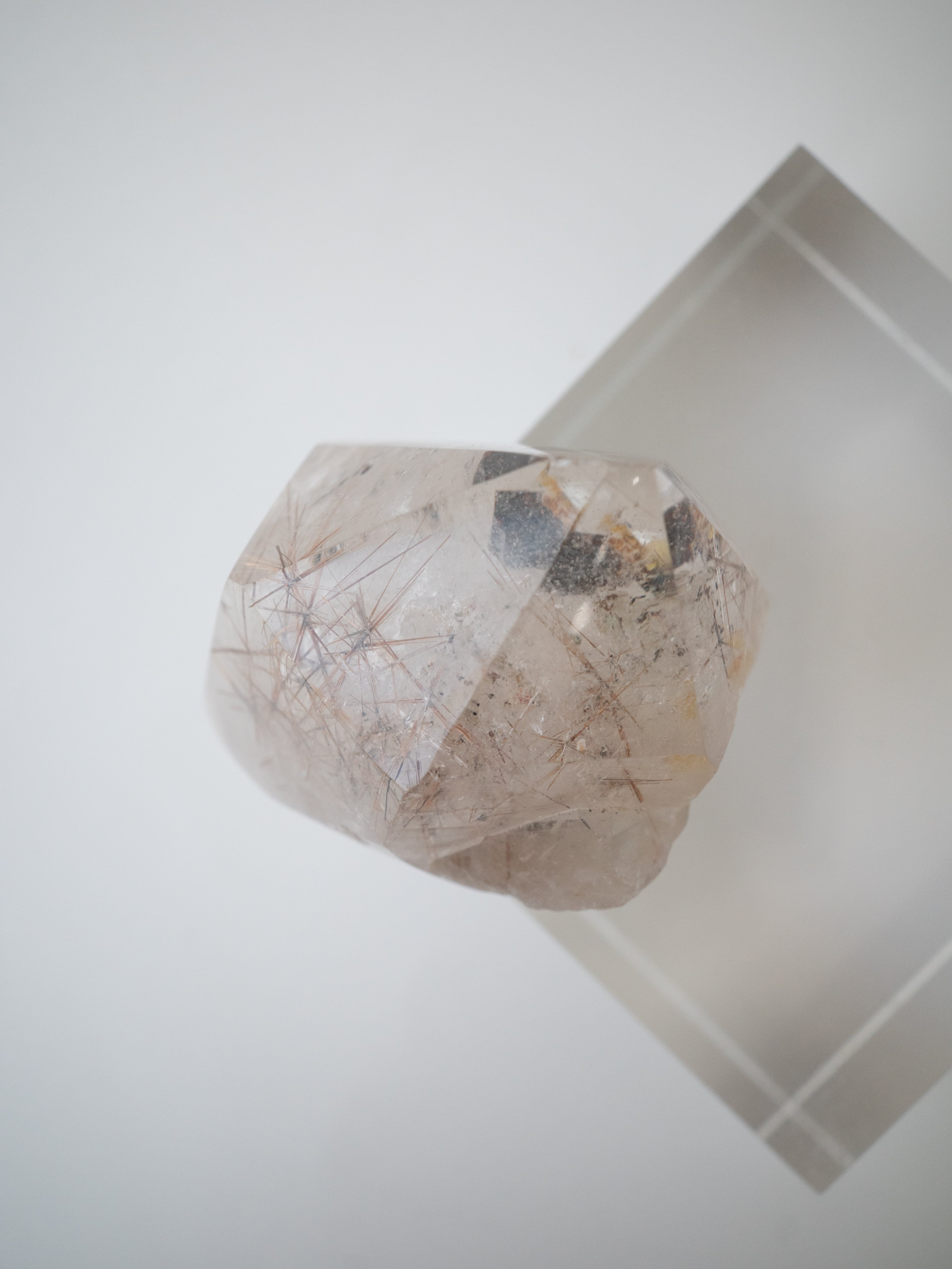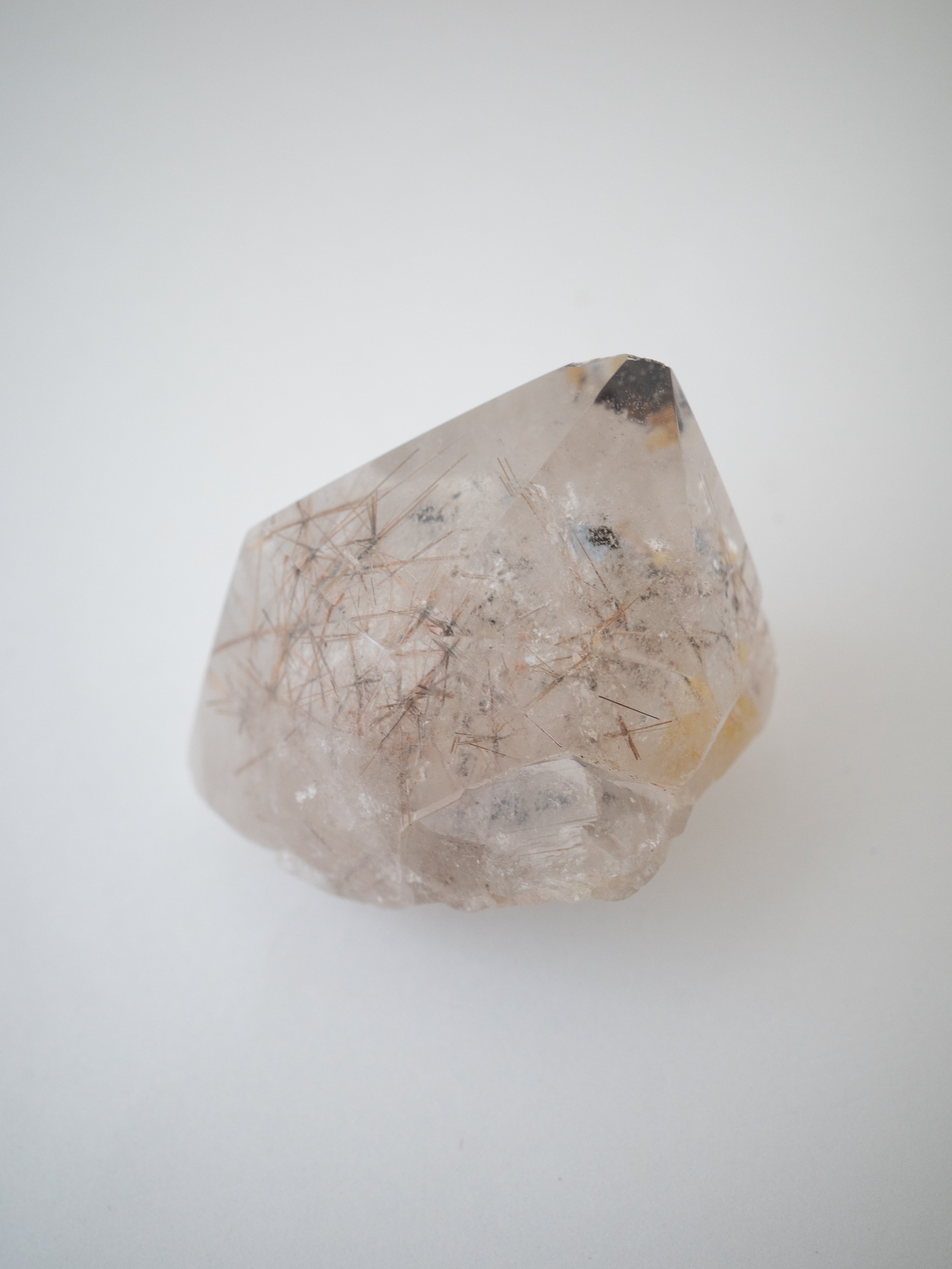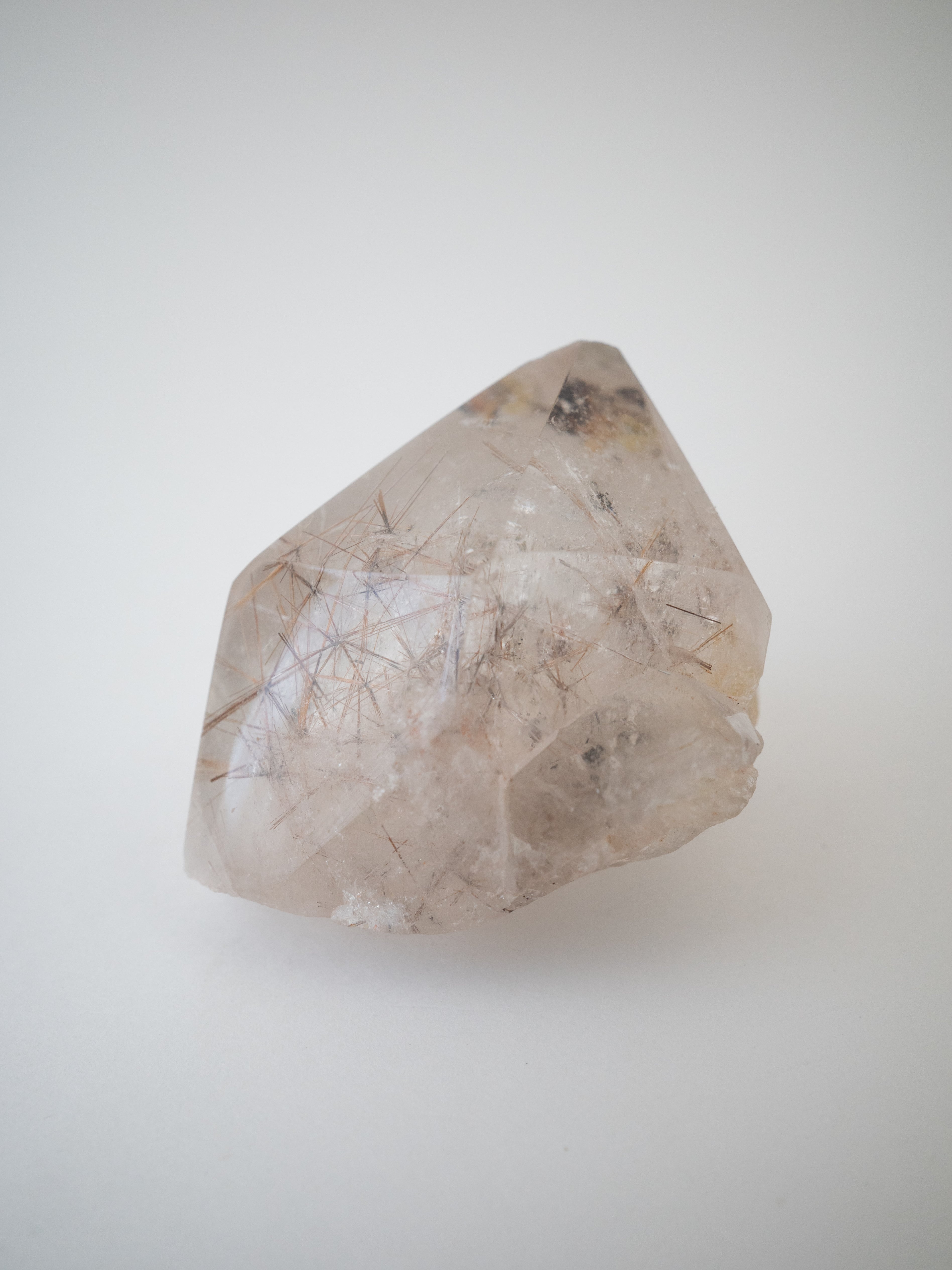 こちらは結晶原石を磨いたもので、鉱物としての面白さを存分に感じられます。内部で交差する赤い針が、より立体的に映える存在感のある一石。空間に置いてオブジェとしても楽しんでいただけます。
