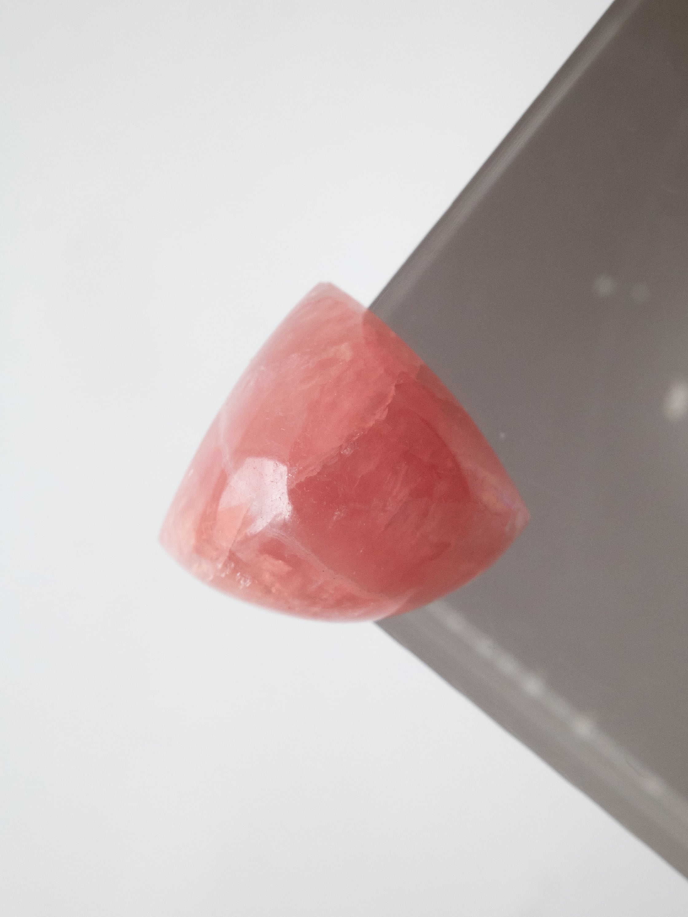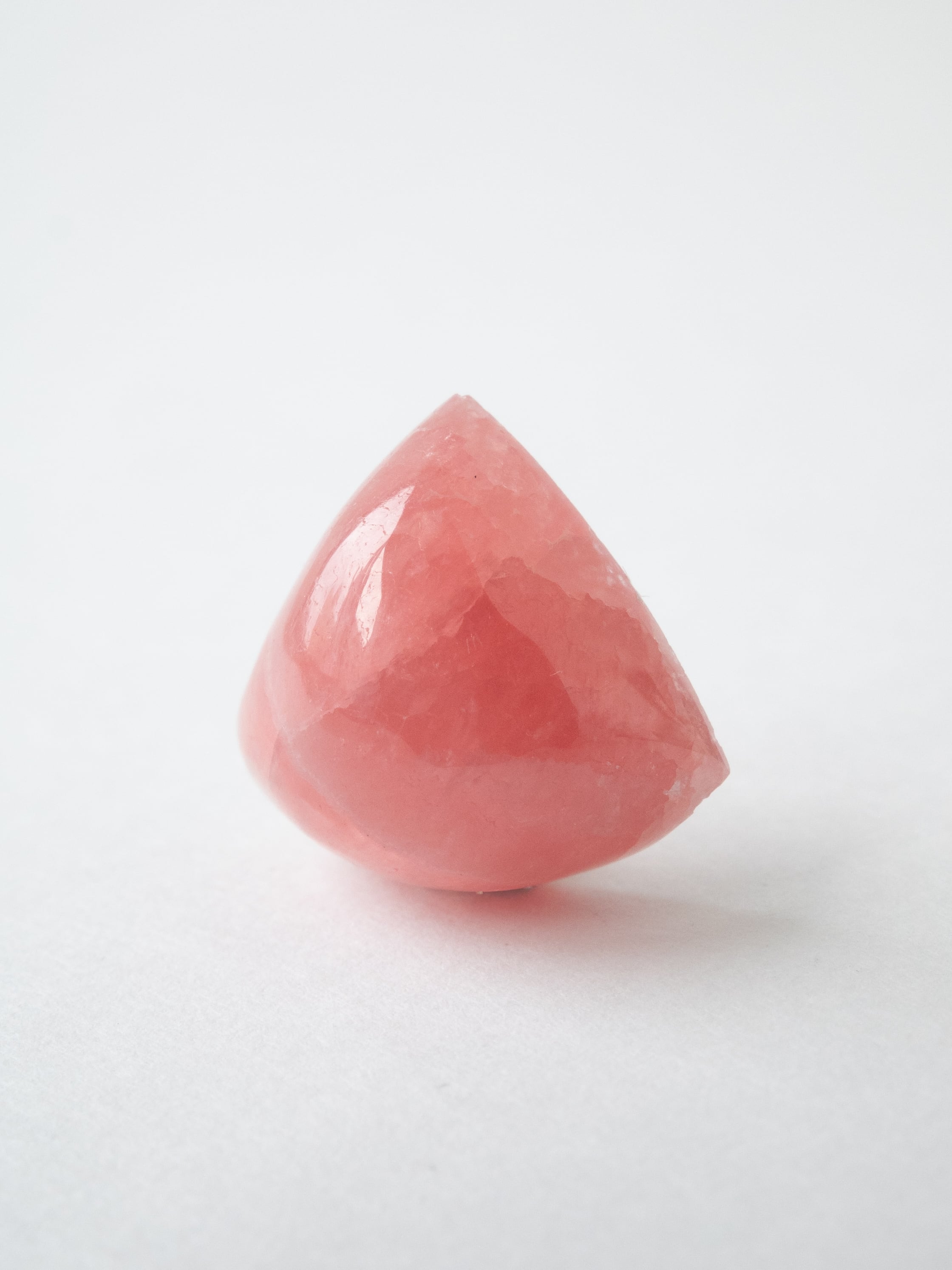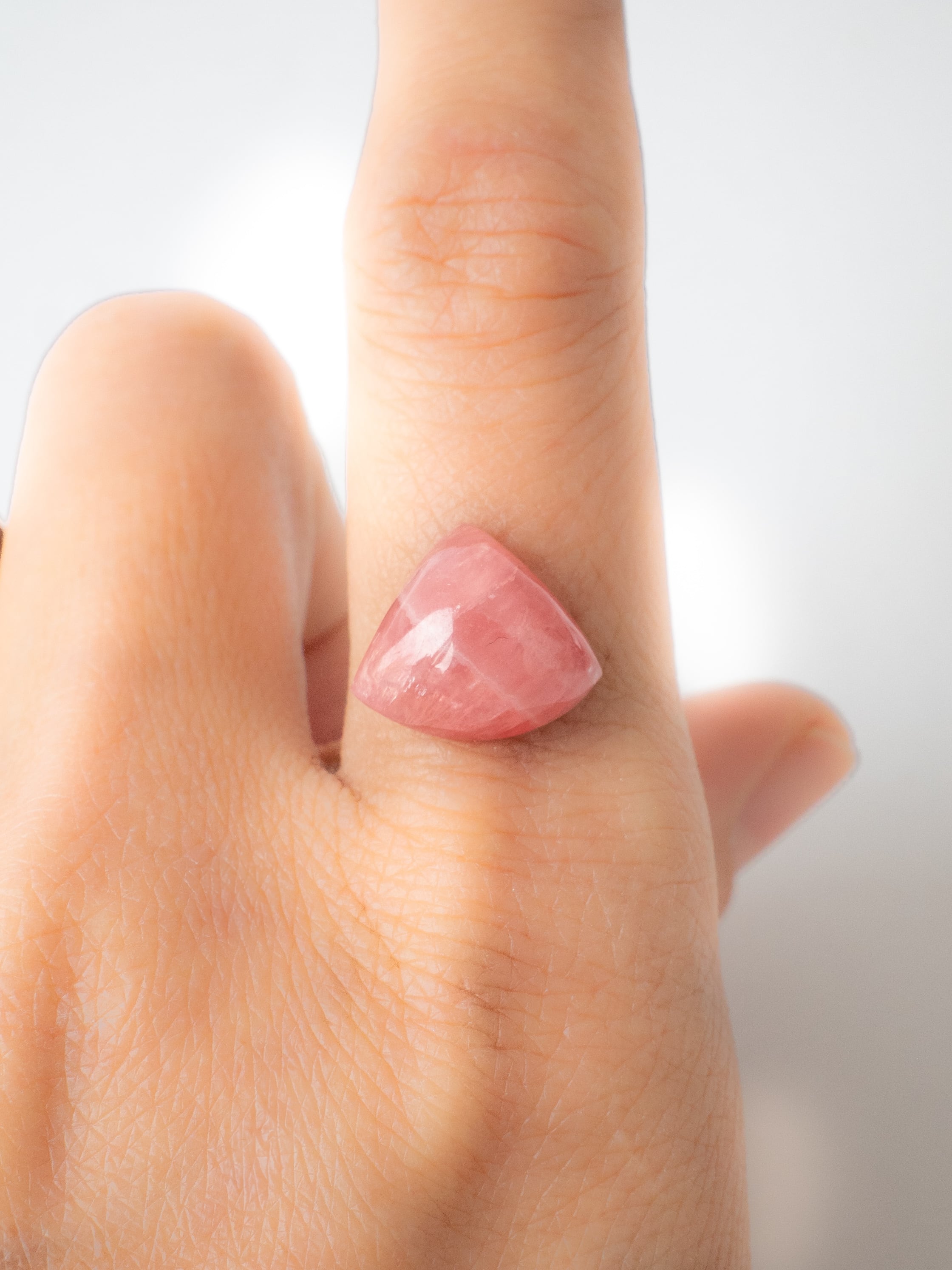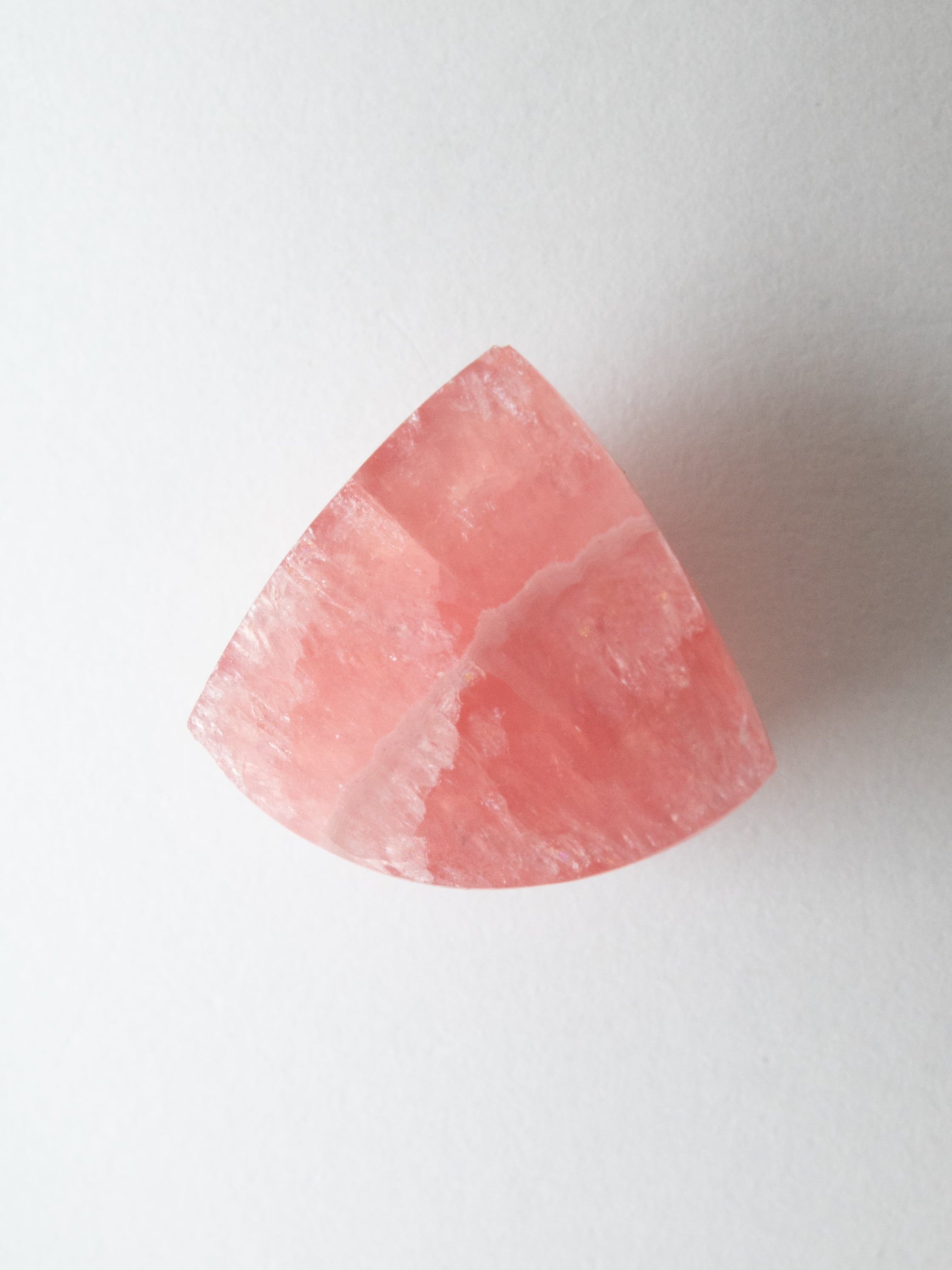 ロードクロサイトは、マンガンを主成分とする炭酸塩鉱物で、やわらかなピンクからローズカラーまでの色合いを持つ天然石です。最大の魅力は、その独特の模様。結晶の成長過程で生まれた層や流れが、まるで絵画のような表情を石の中に描き出します。また、バラ色の美しさから「インカローズ」という名でも親しまれています。