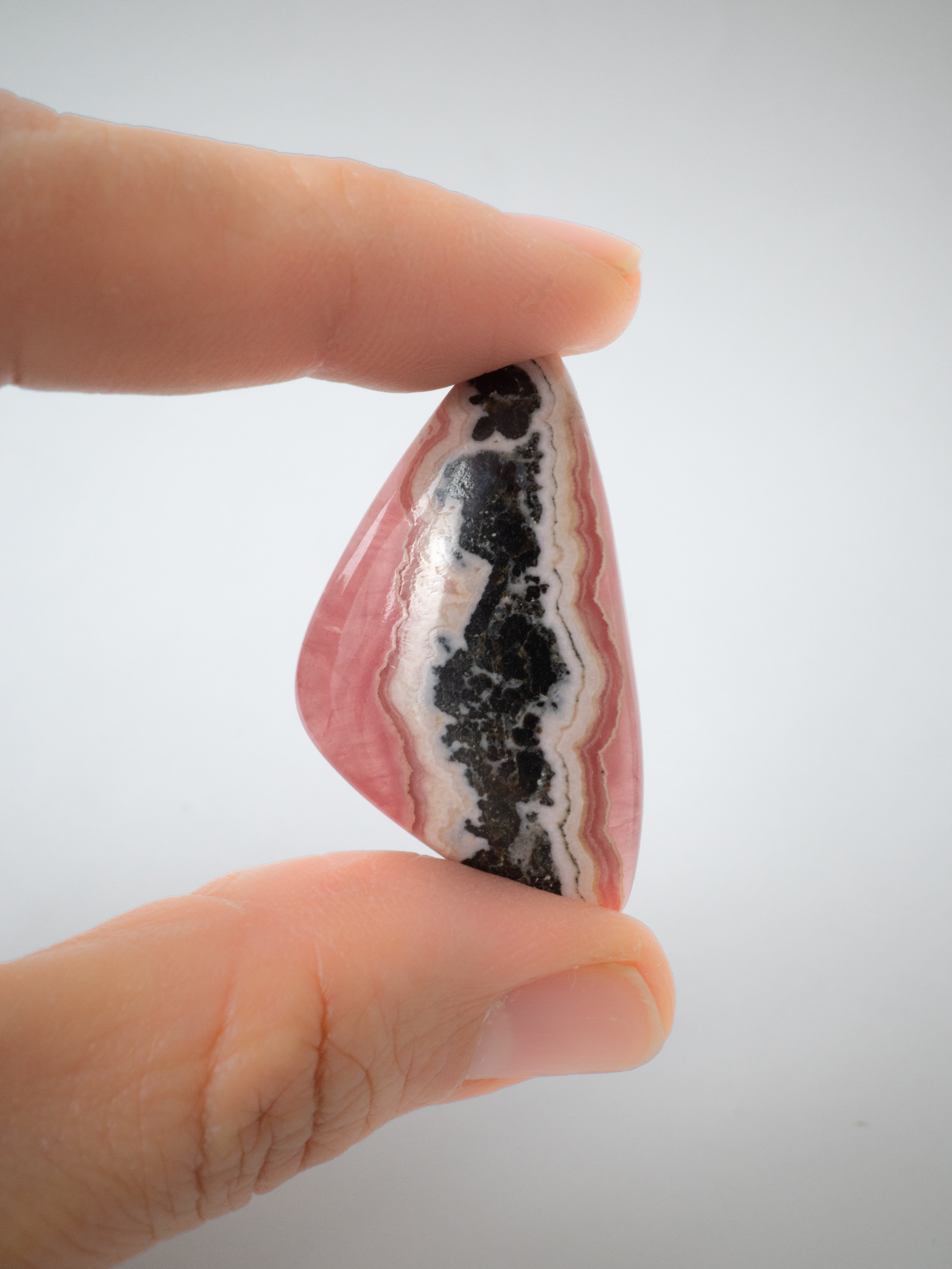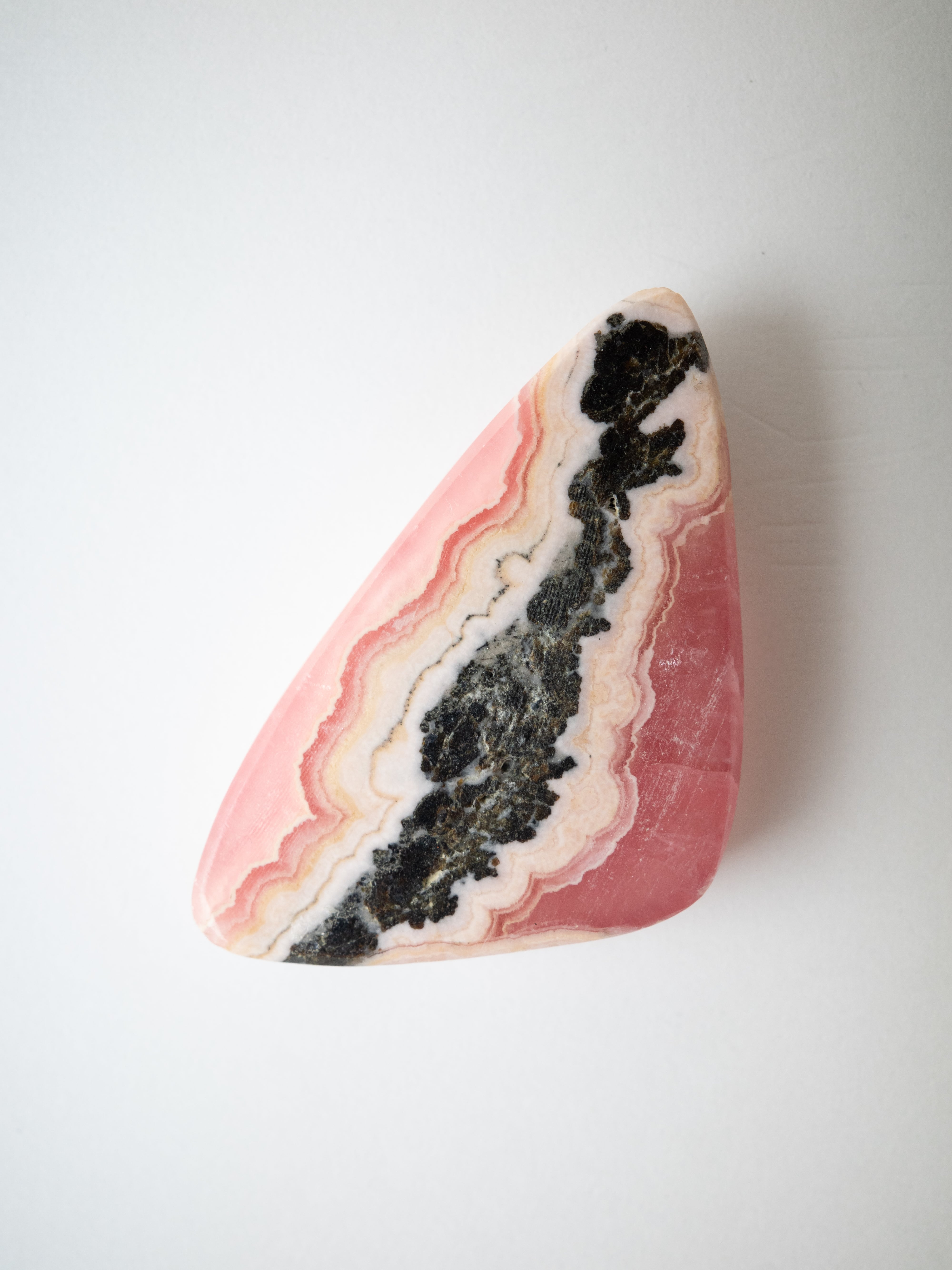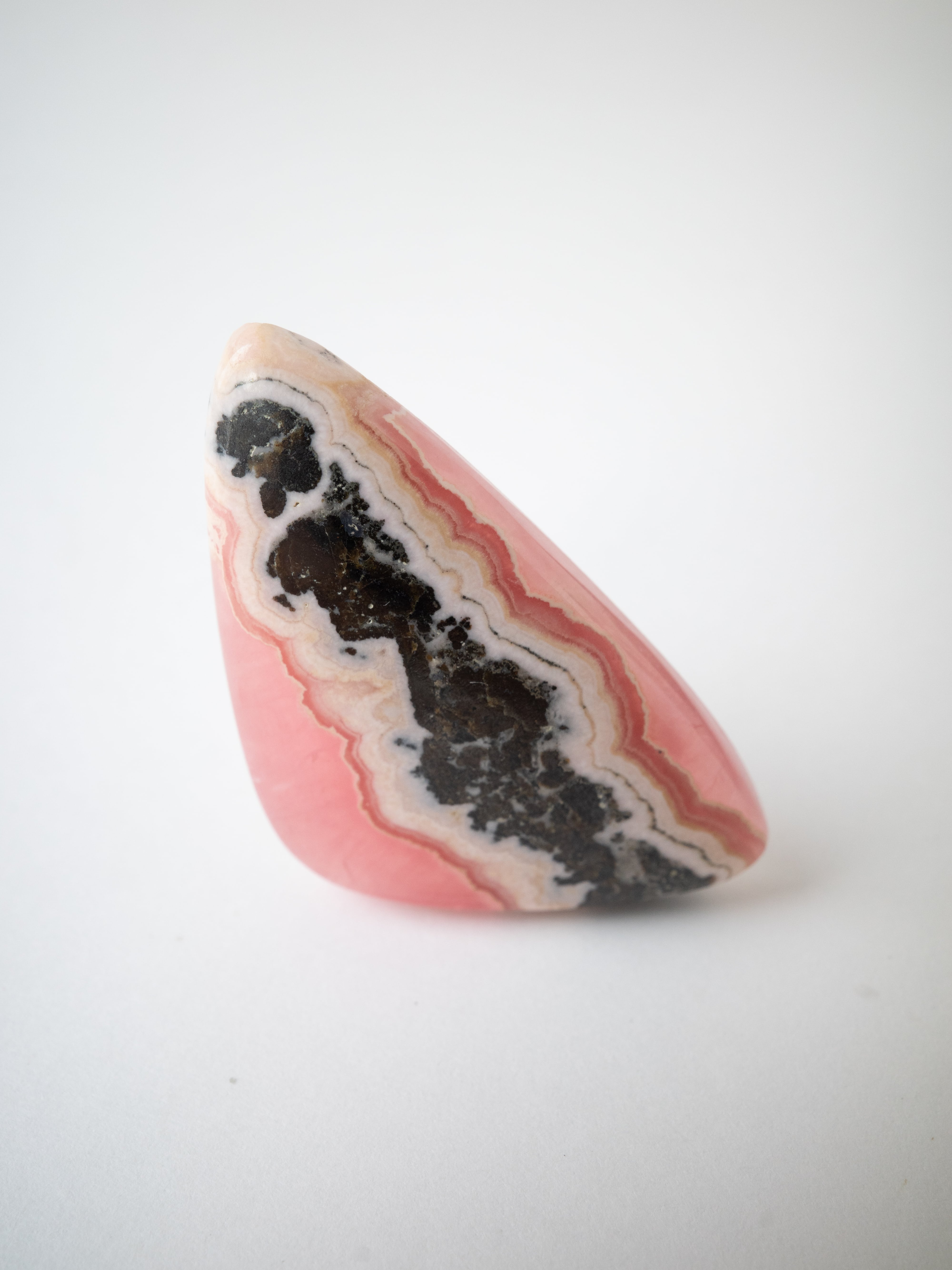 ロードクロサイトは、マンガンを主成分とする炭酸塩鉱物で、やわらかなピンクからローズカラーまでの色合いを持つ天然石です。最大の魅力は、その独特の模様。結晶の成長過程で生まれた層や流れが、まるで絵画のような表情を石の中に描き出します。また、バラ色の美しさから「インカローズ」という名でも親しまれています。