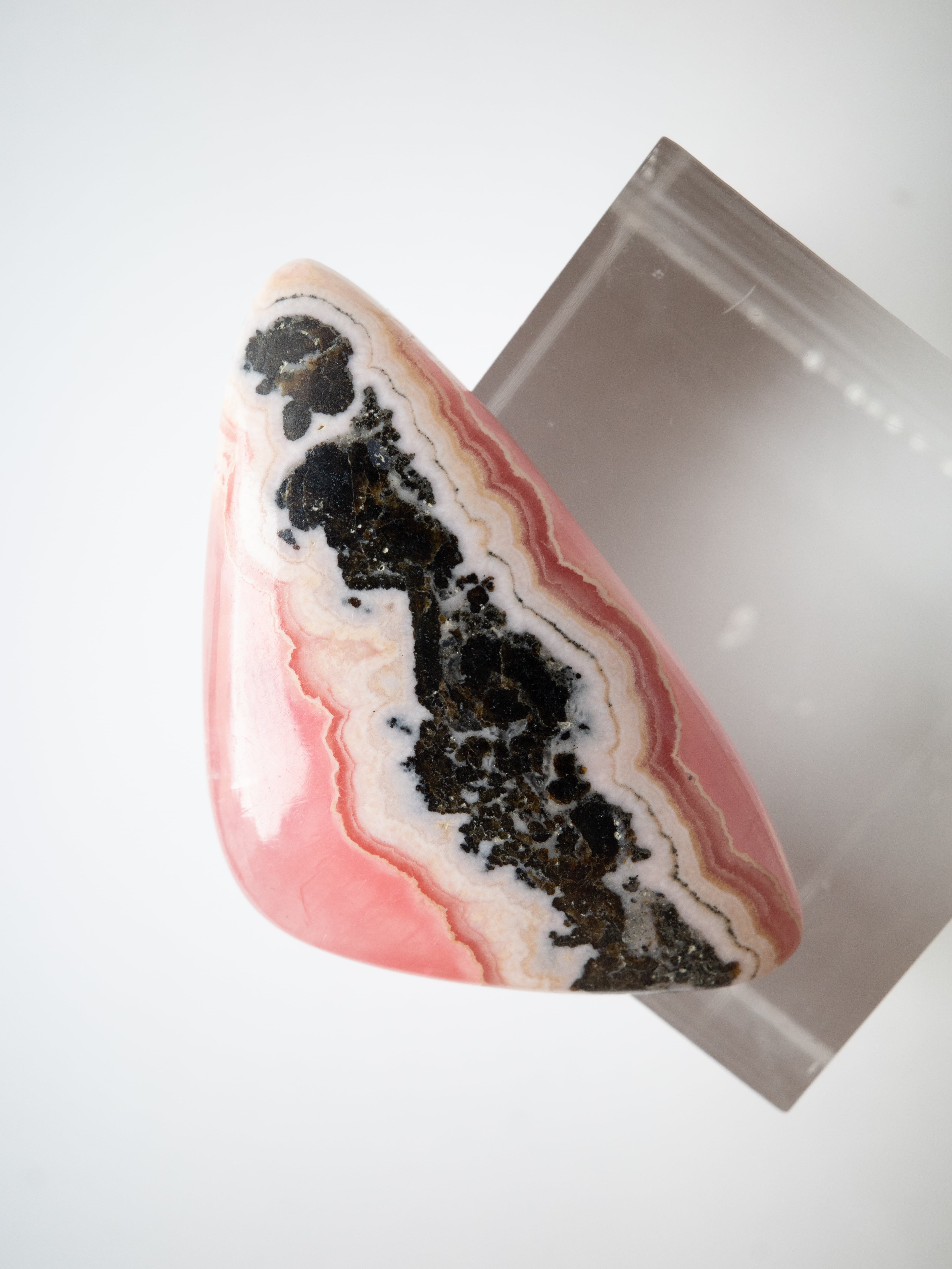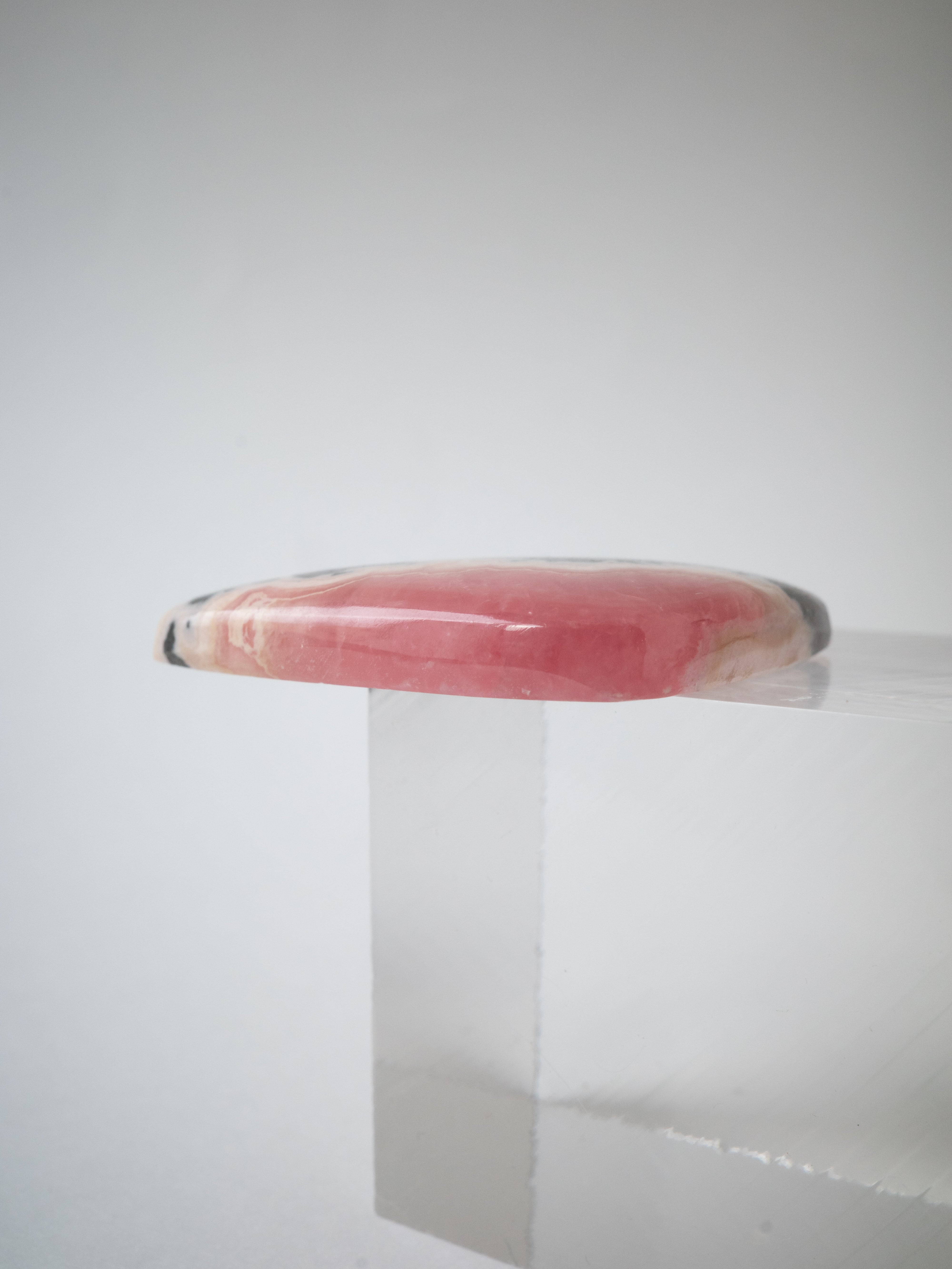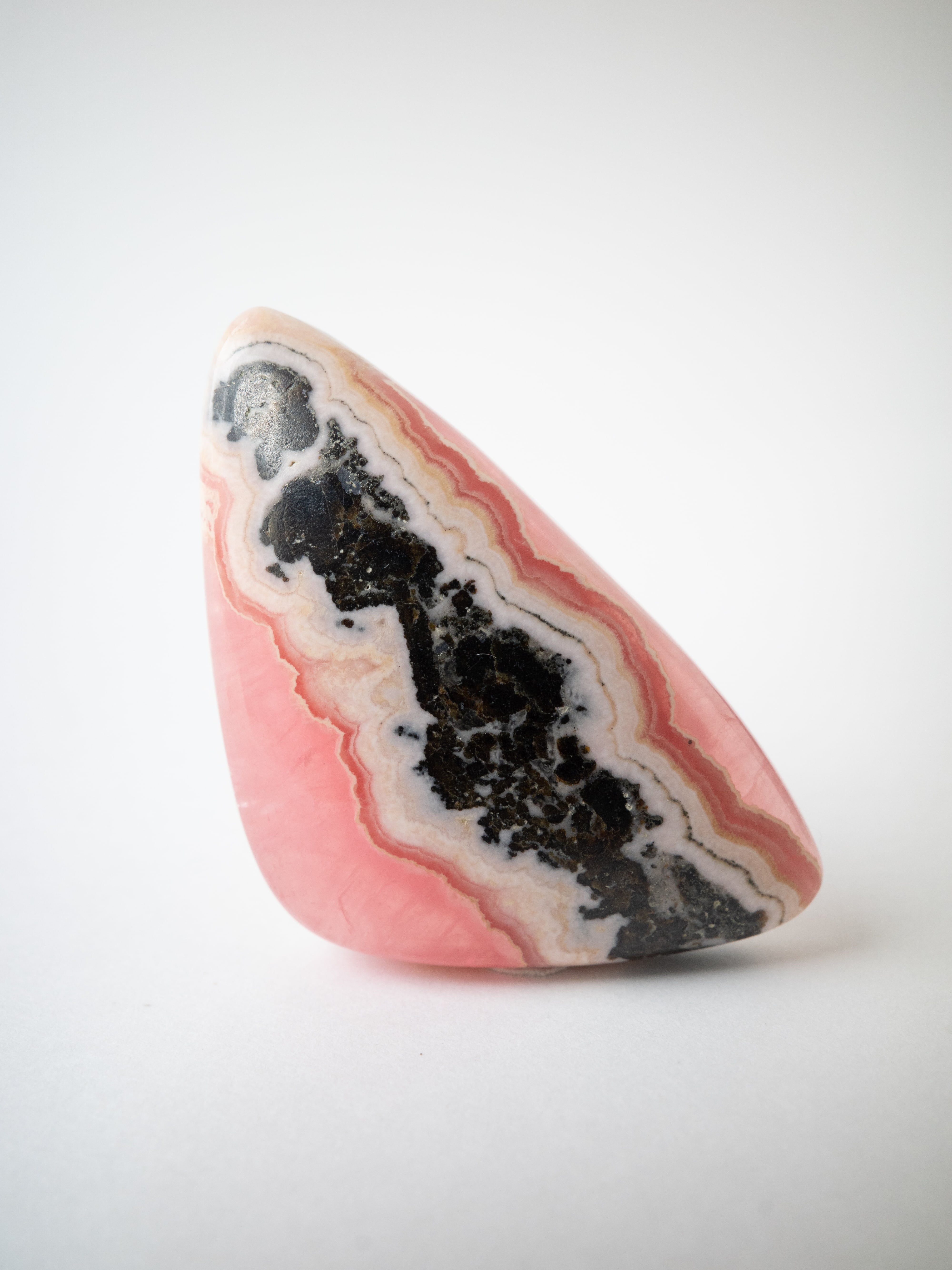 ロードクロサイトは、マンガンを主成分とする炭酸塩鉱物で、やわらかなピンクからローズカラーまでの色合いを持つ天然石です。最大の魅力は、その独特の模様。結晶の成長過程で生まれた層や流れが、まるで絵画のような表情を石の中に描き出します。また、バラ色の美しさから「インカローズ」という名でも親しまれています。
