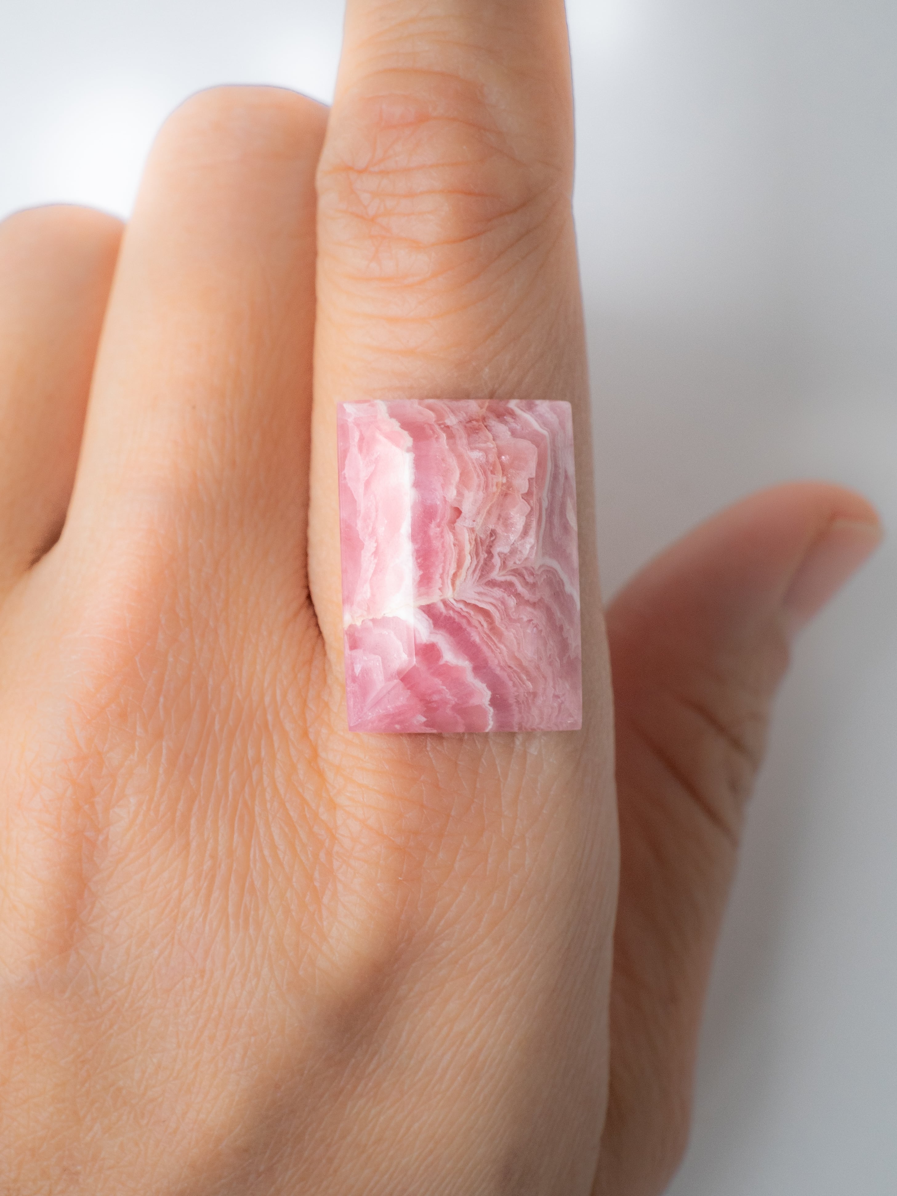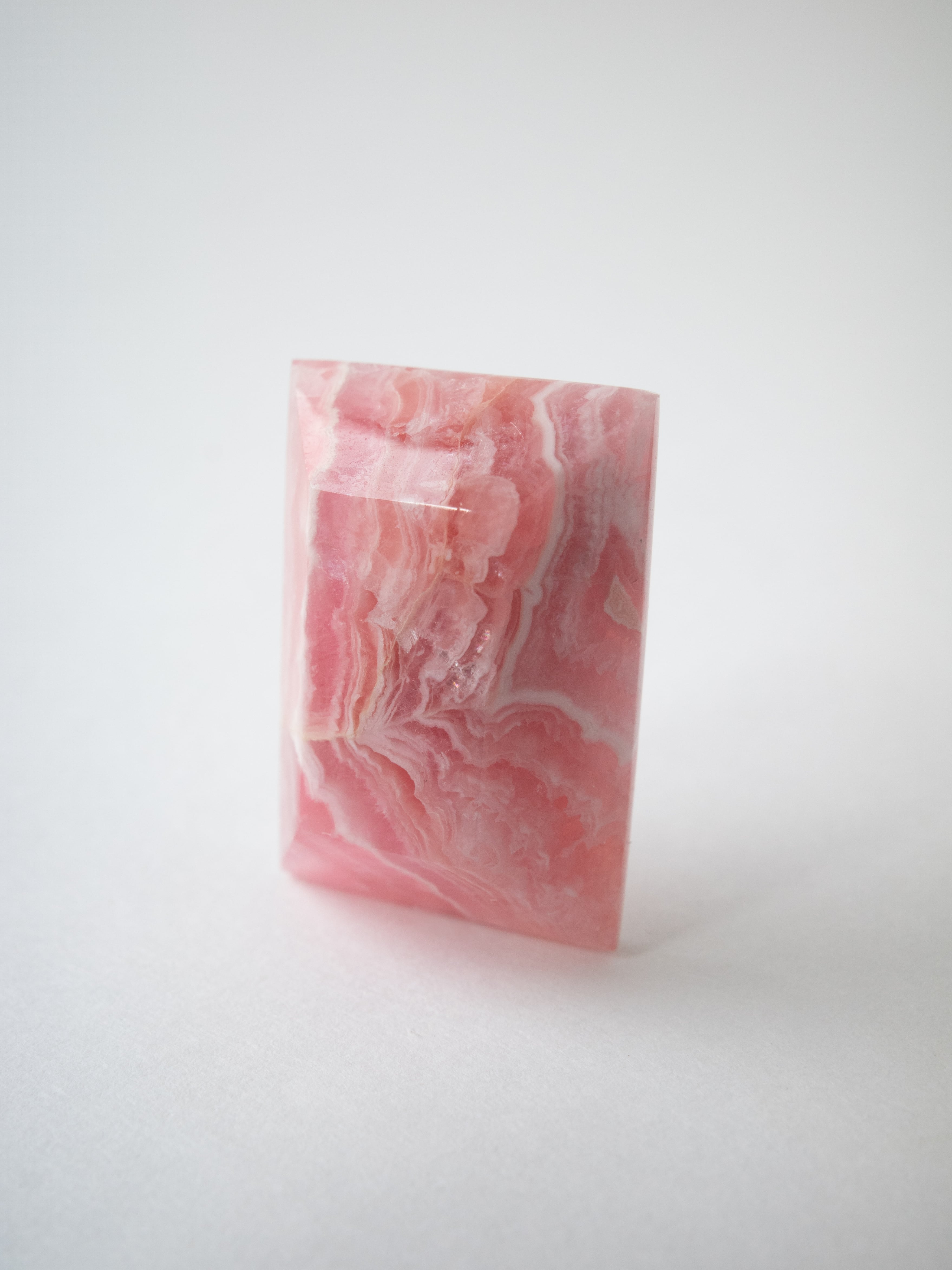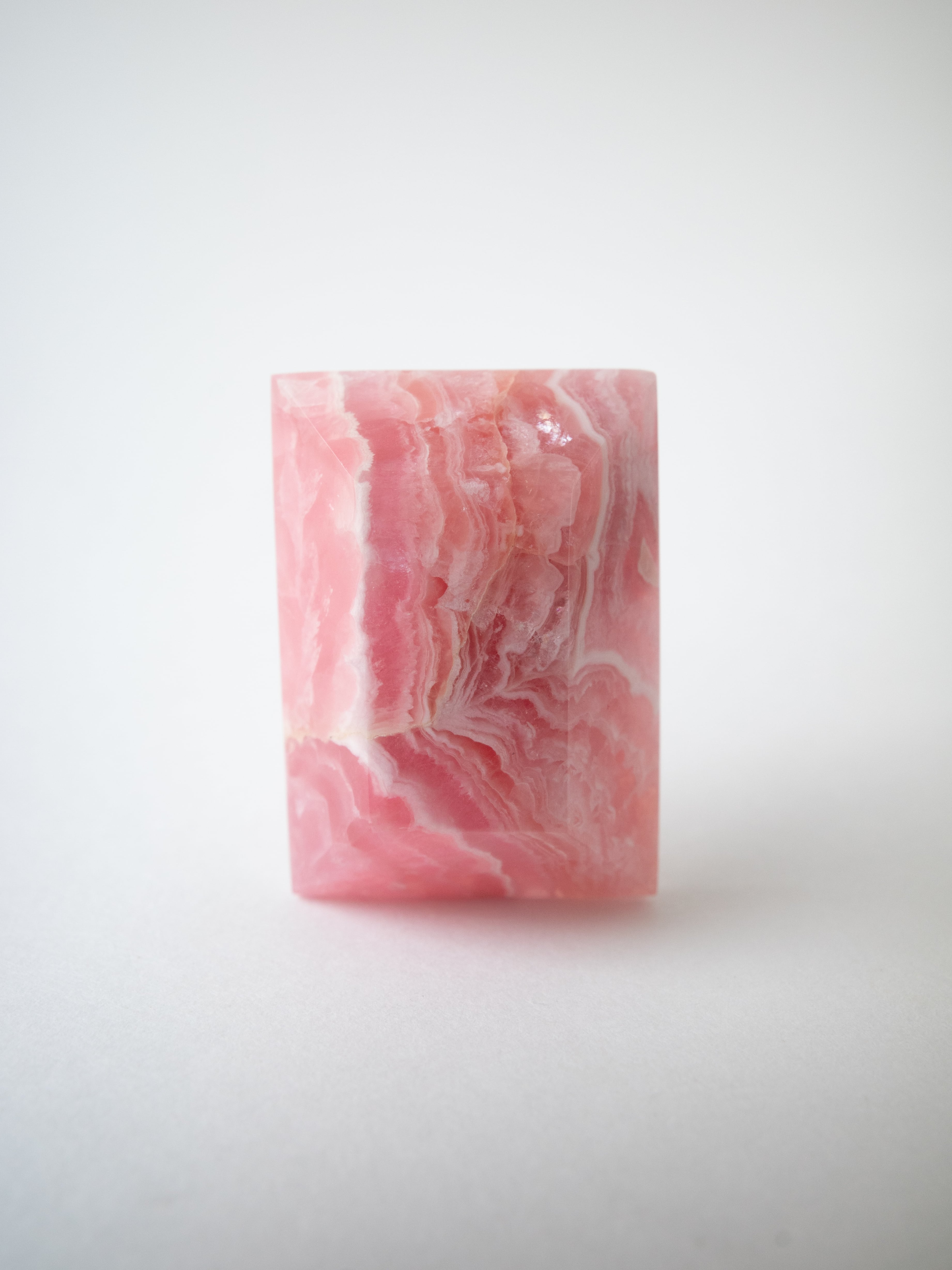 ロードクロサイトは、マンガンを主成分とする炭酸塩鉱物で、やわらかなピンクからローズカラーまでの色合いを持つ天然石です。最大の魅力は、その独特の模様。結晶の成長過程で生まれた層や流れが、まるで絵画のような表情を石の中に描き出します。また、バラ色の美しさから「インカローズ」という名でも親しまれています。