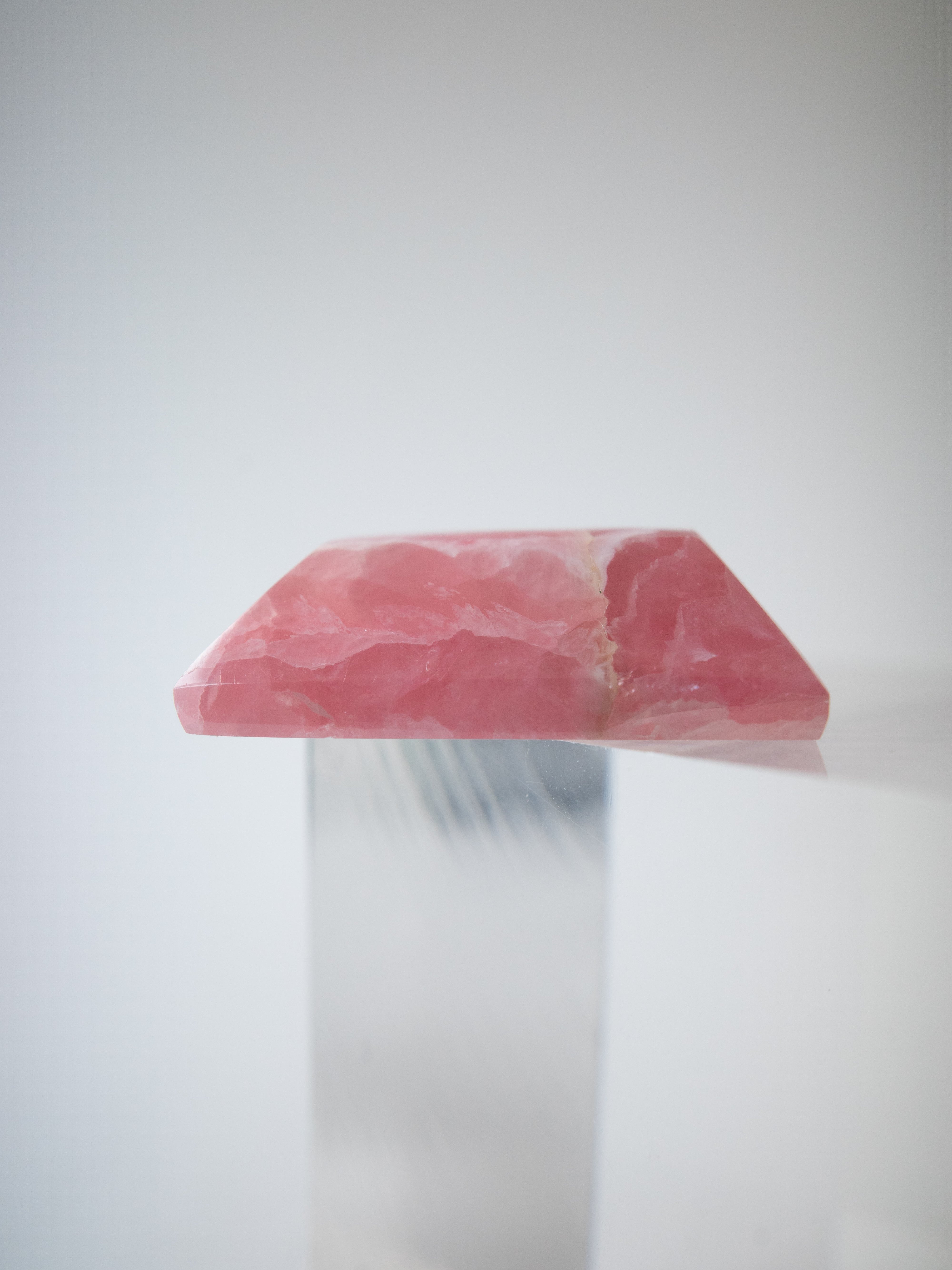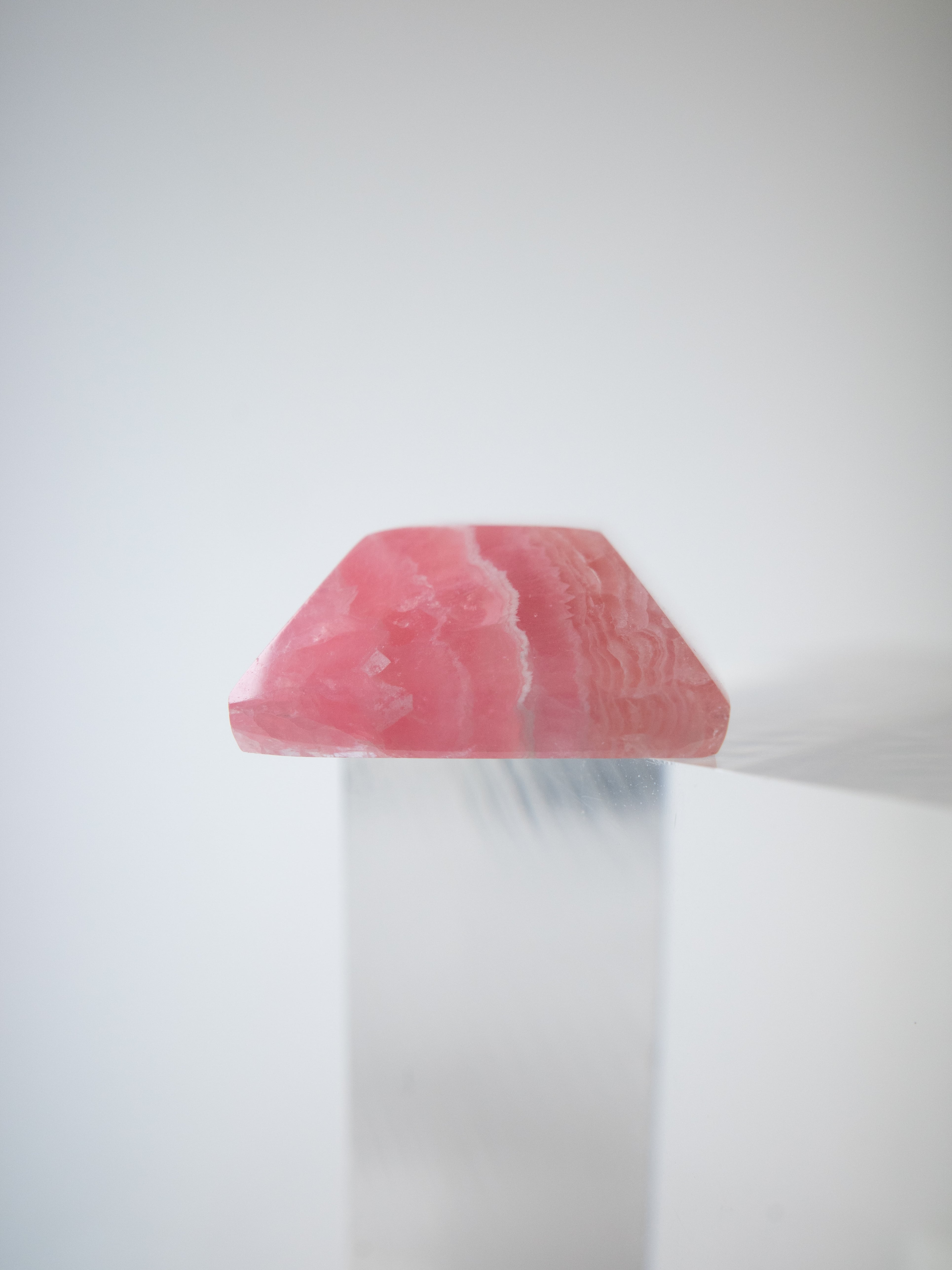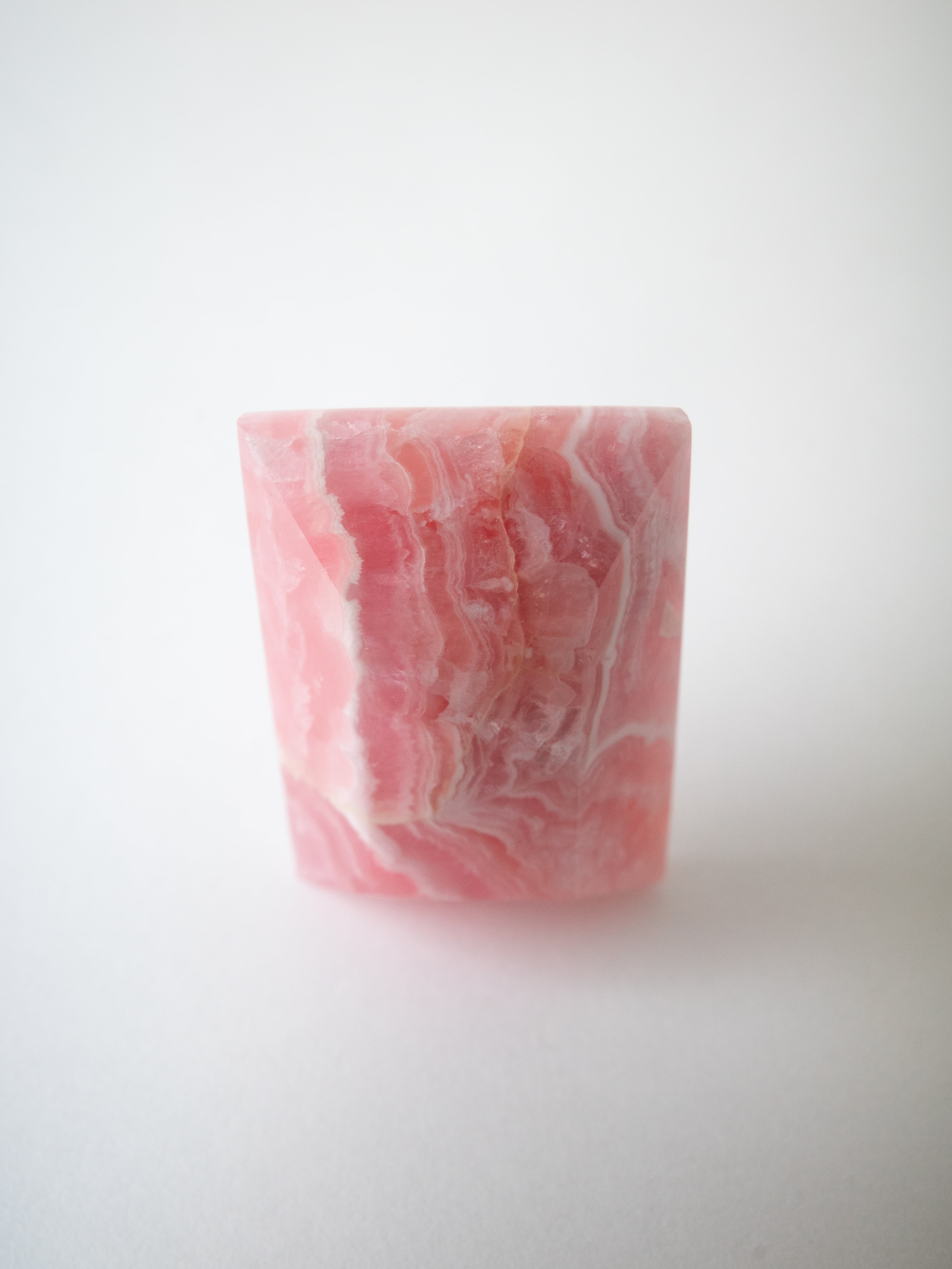 ロードクロサイトは、マンガンを主成分とする炭酸塩鉱物で、やわらかなピンクからローズカラーまでの色合いを持つ天然石です。最大の魅力は、その独特の模様。結晶の成長過程で生まれた層や流れが、まるで絵画のような表情を石の中に描き出します。また、バラ色の美しさから「インカローズ」という名でも親しまれています。