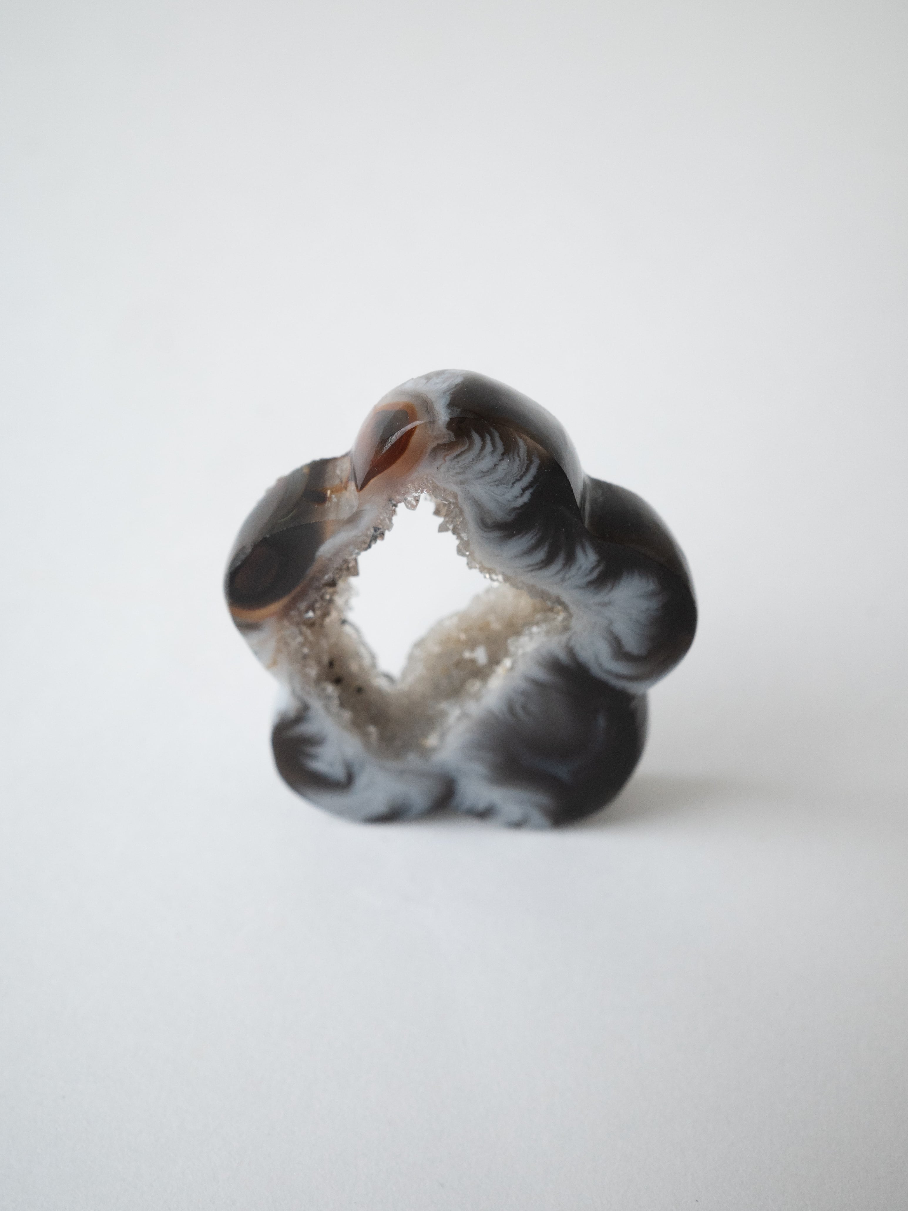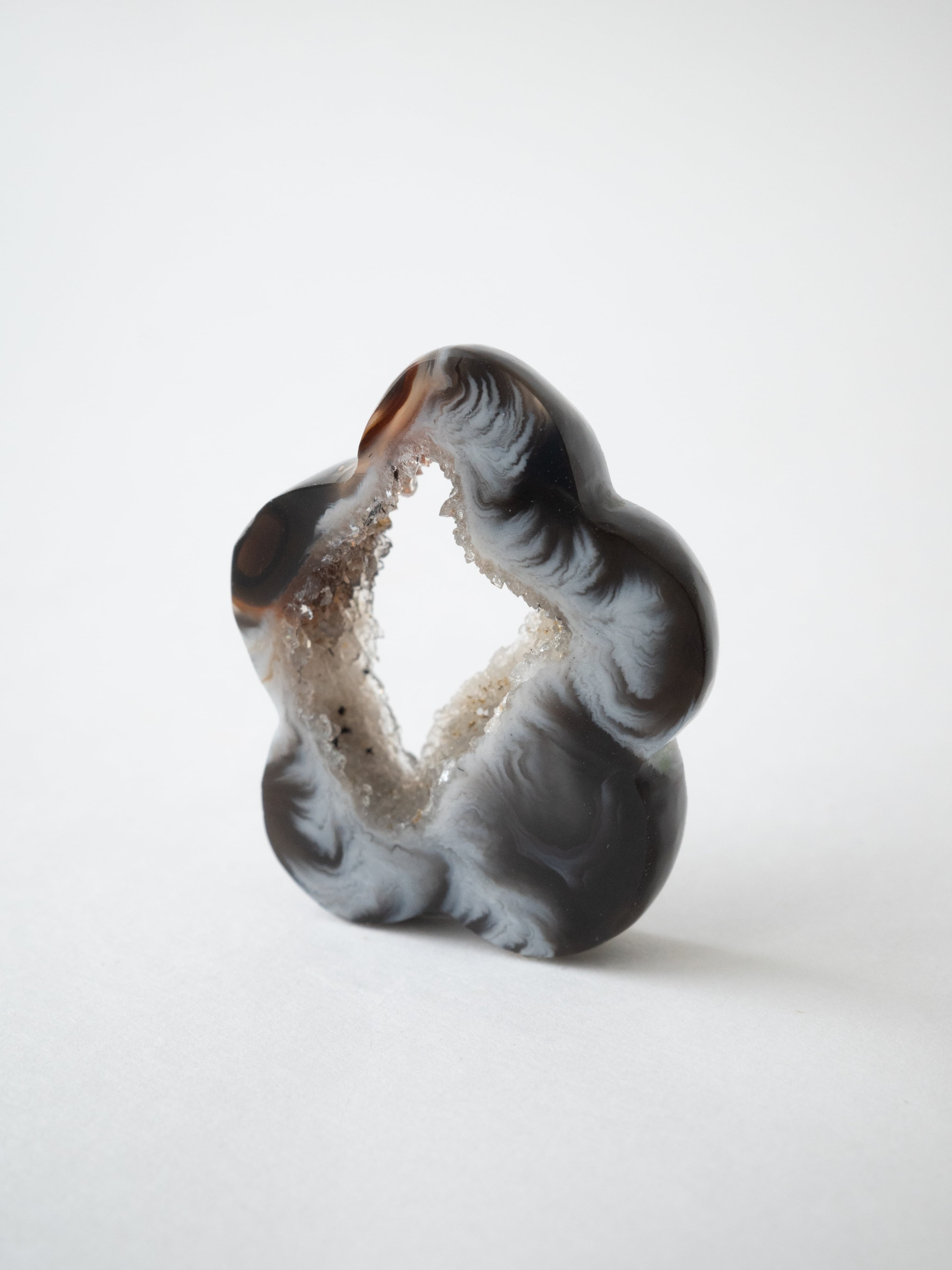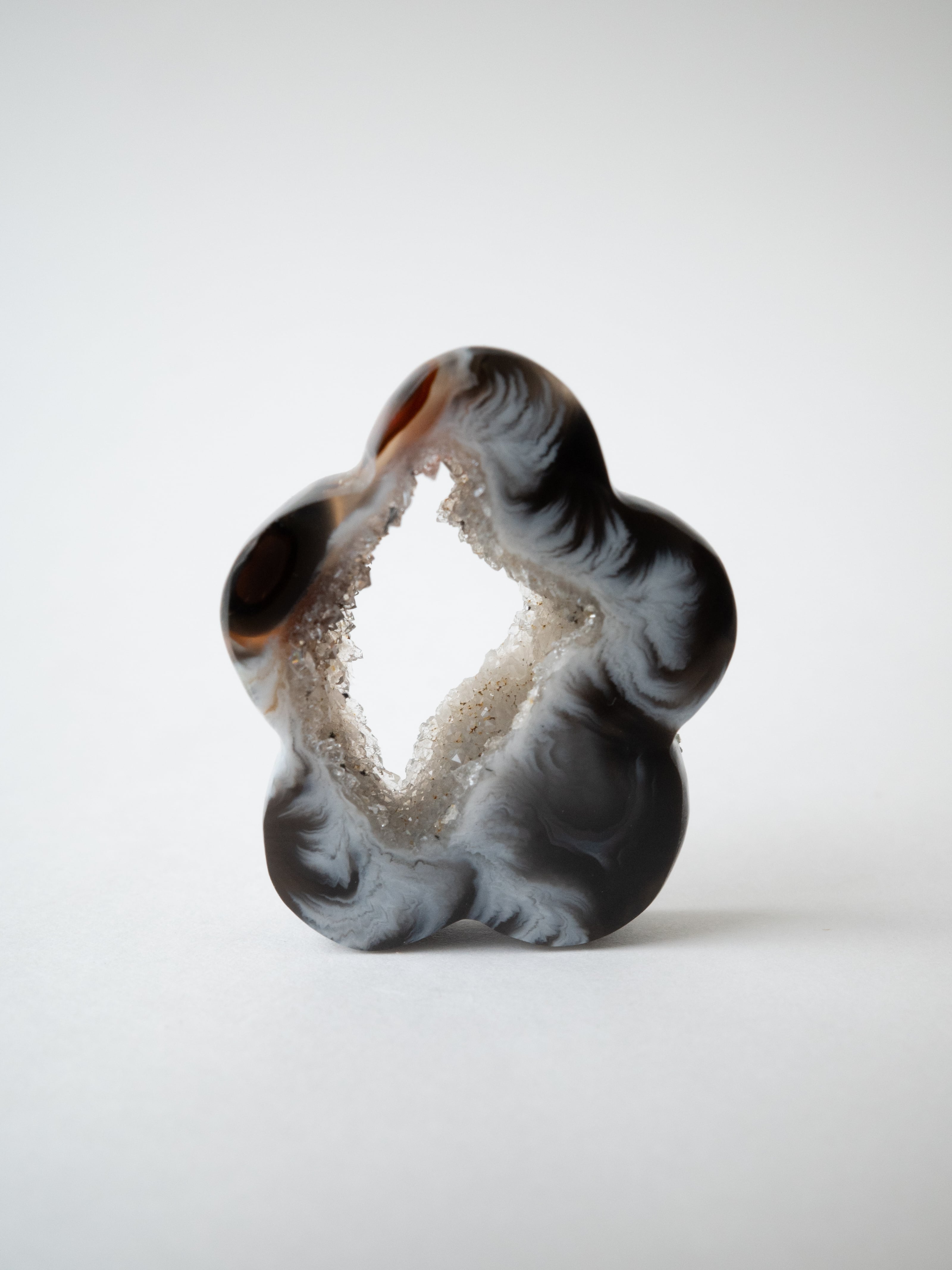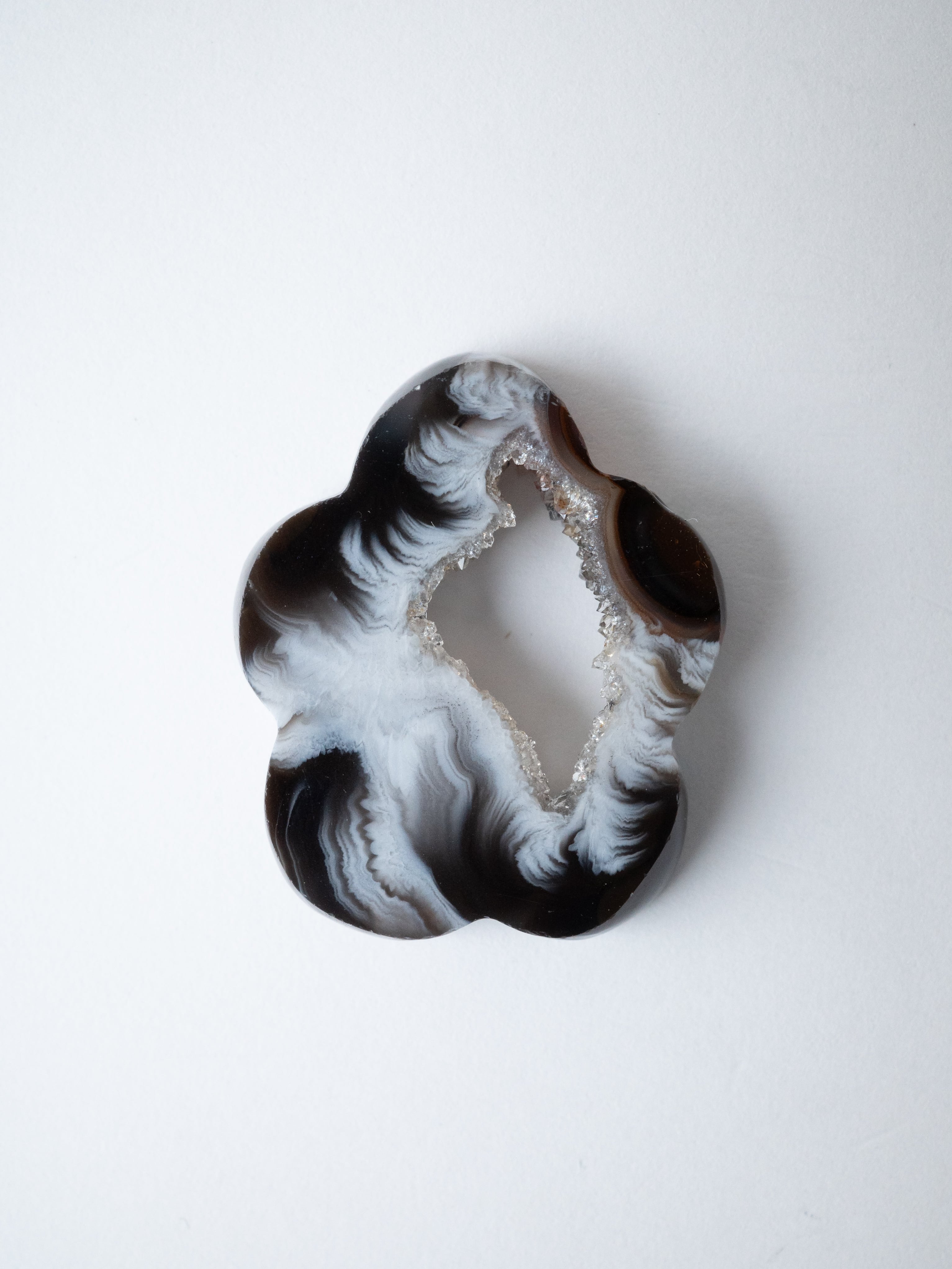 This druzy agate, known for its small sparkling crystals, has been cut into a flower-like form.