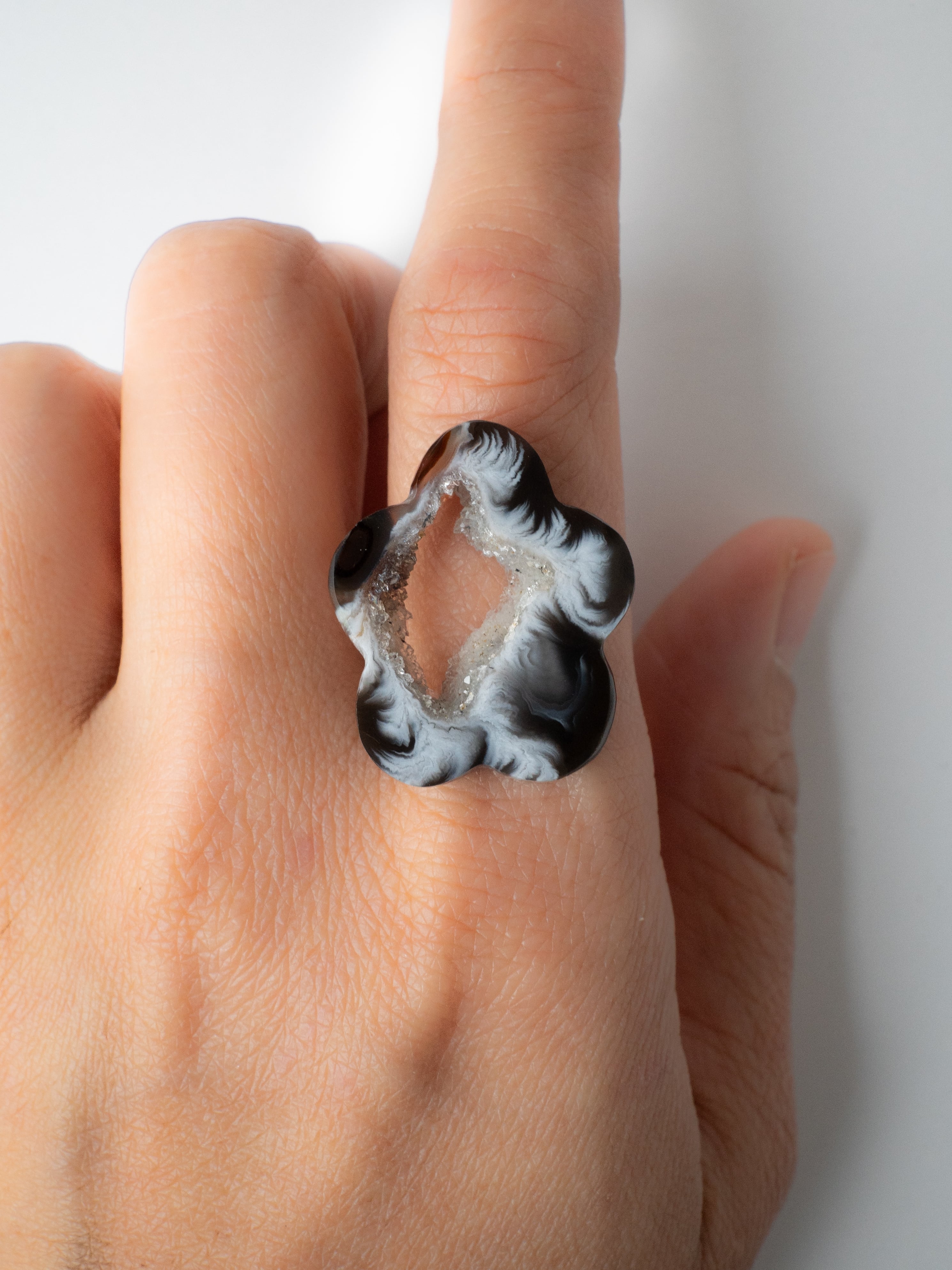 キラキラとした小さな結晶が美しいドゥルジーアゲートを、お花のようなフォルムにカットしました。雲のように見えるものもありますね。自然の形を生かしたカットなので、可愛らしさに偏りすぎないバランスの取れたデザインです。