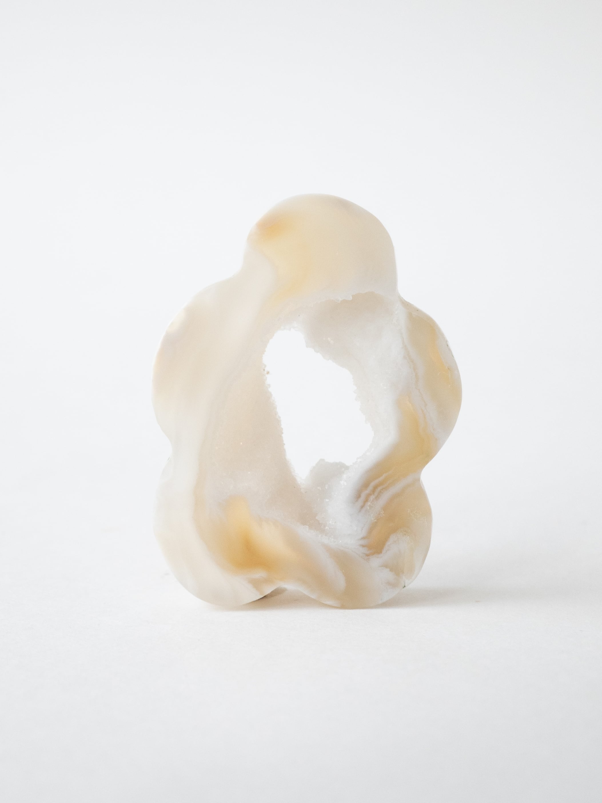 This druzy agate, known for its small sparkling crystals, has been cut into a flower-like form.
