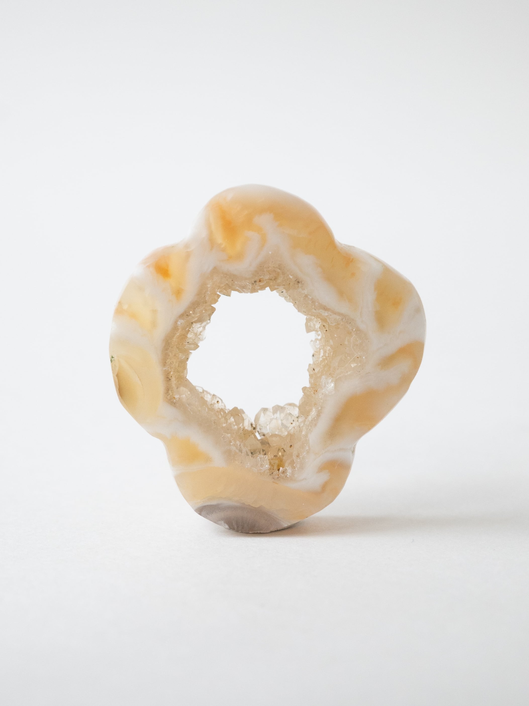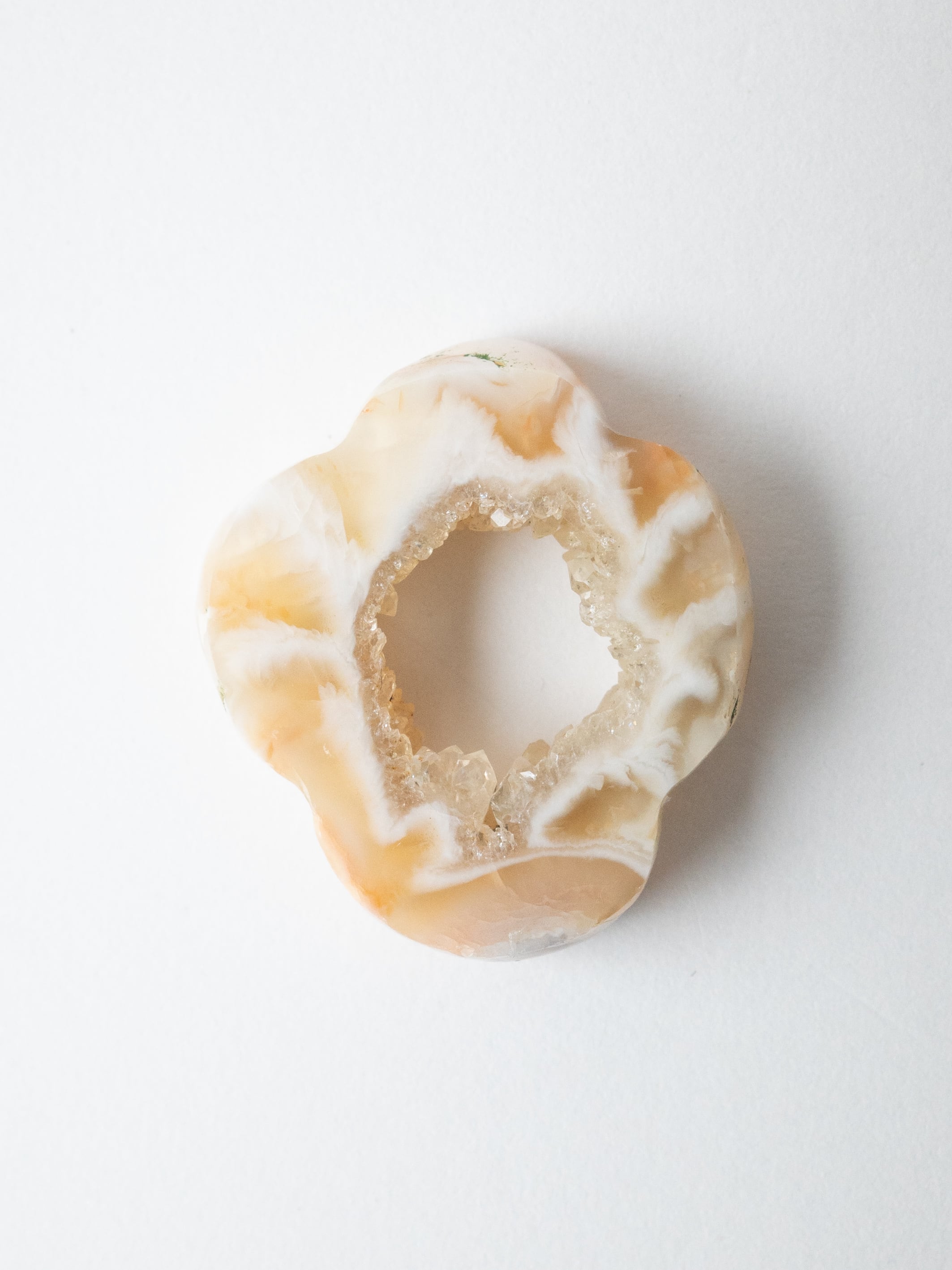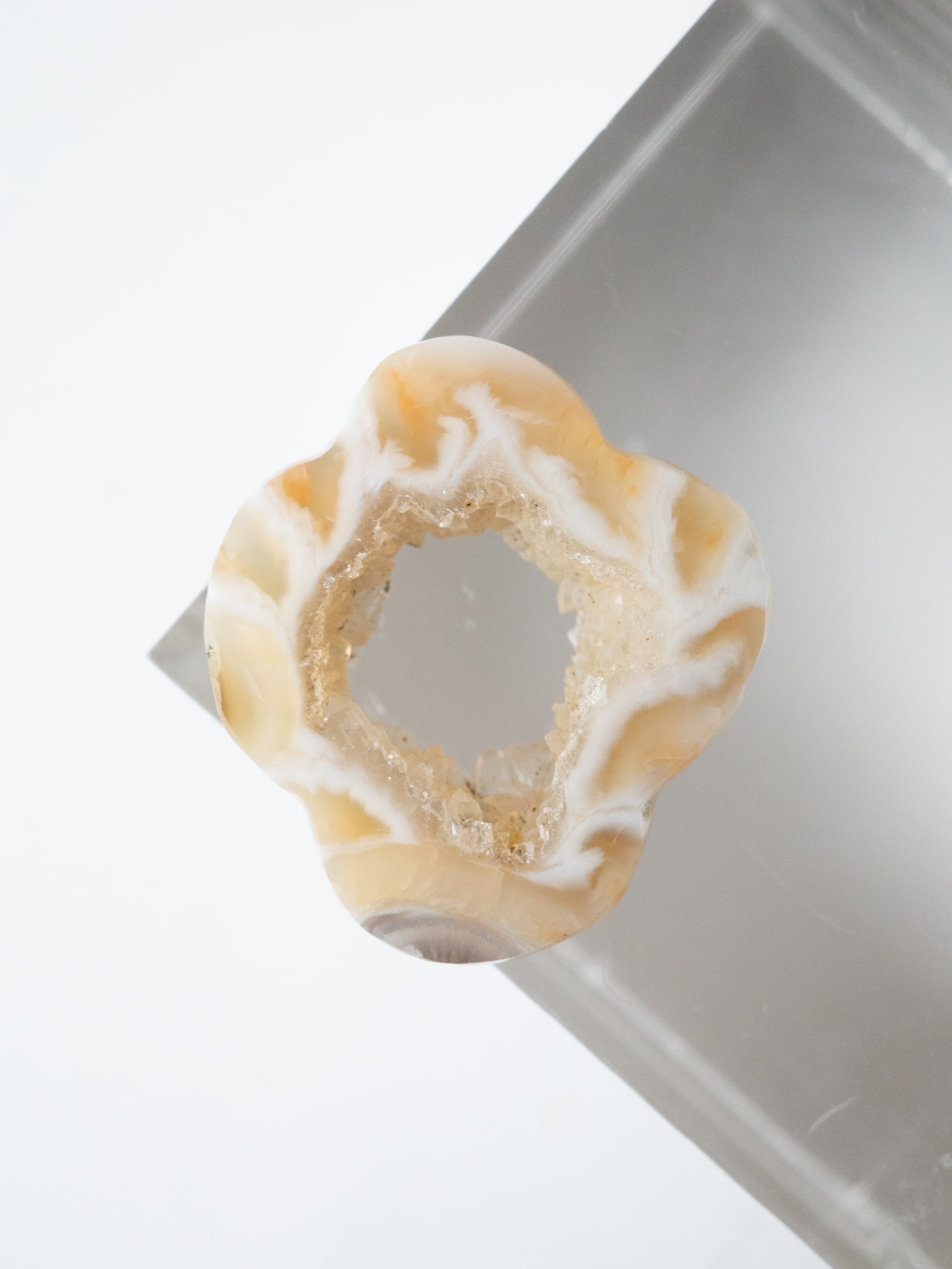 This druzy agate, known for its small sparkling crystals, has been cut into a flower-like form.