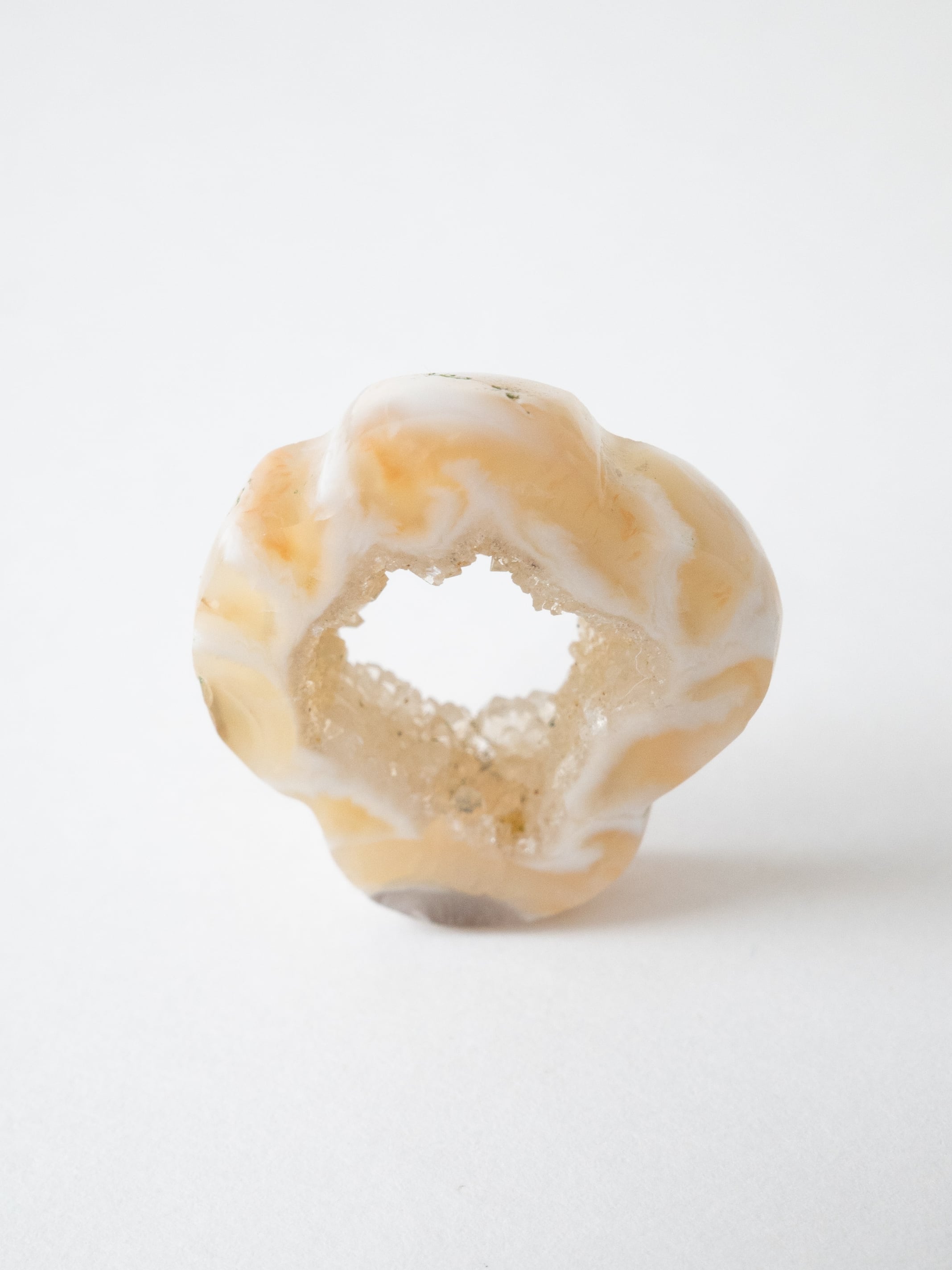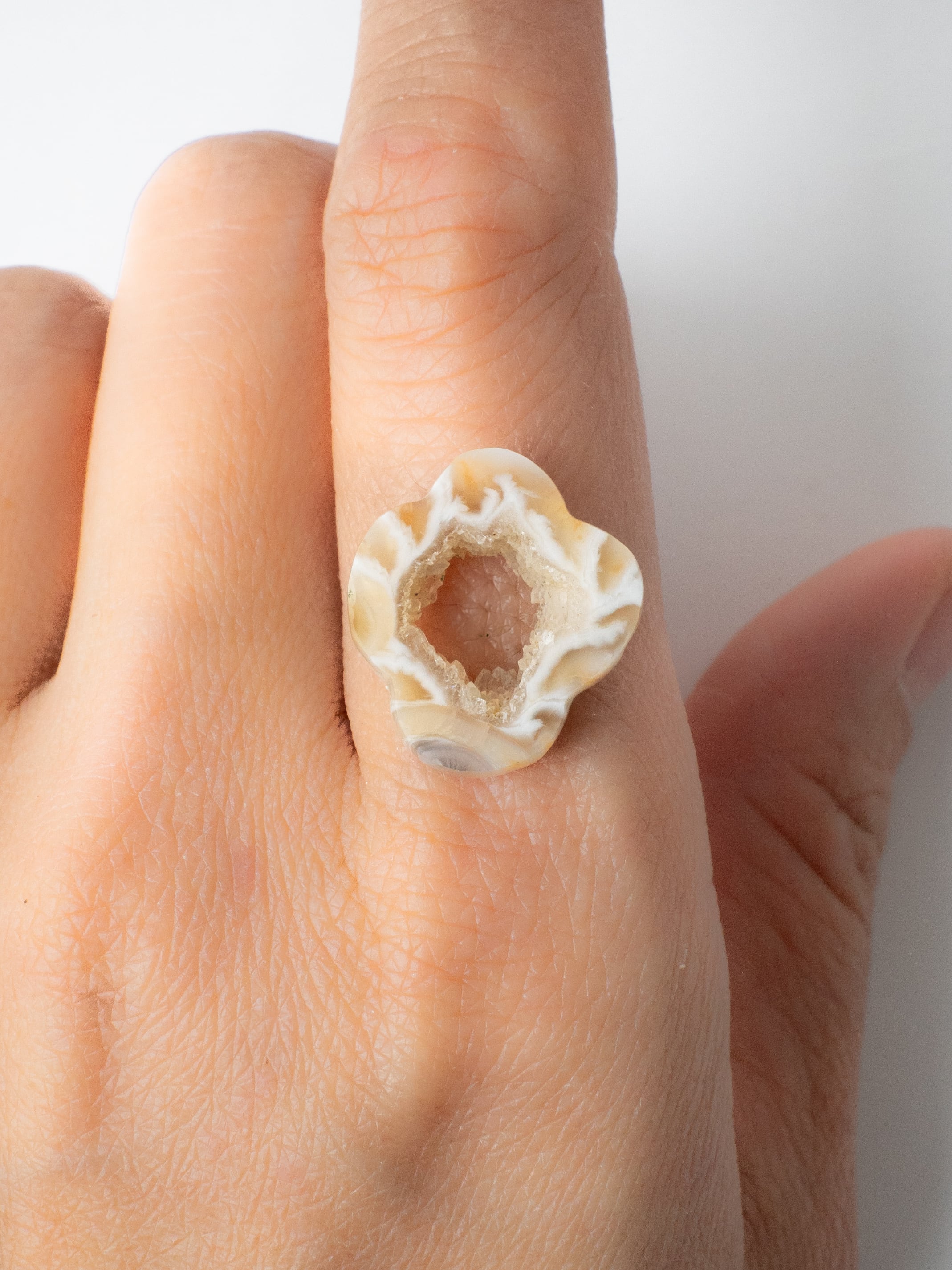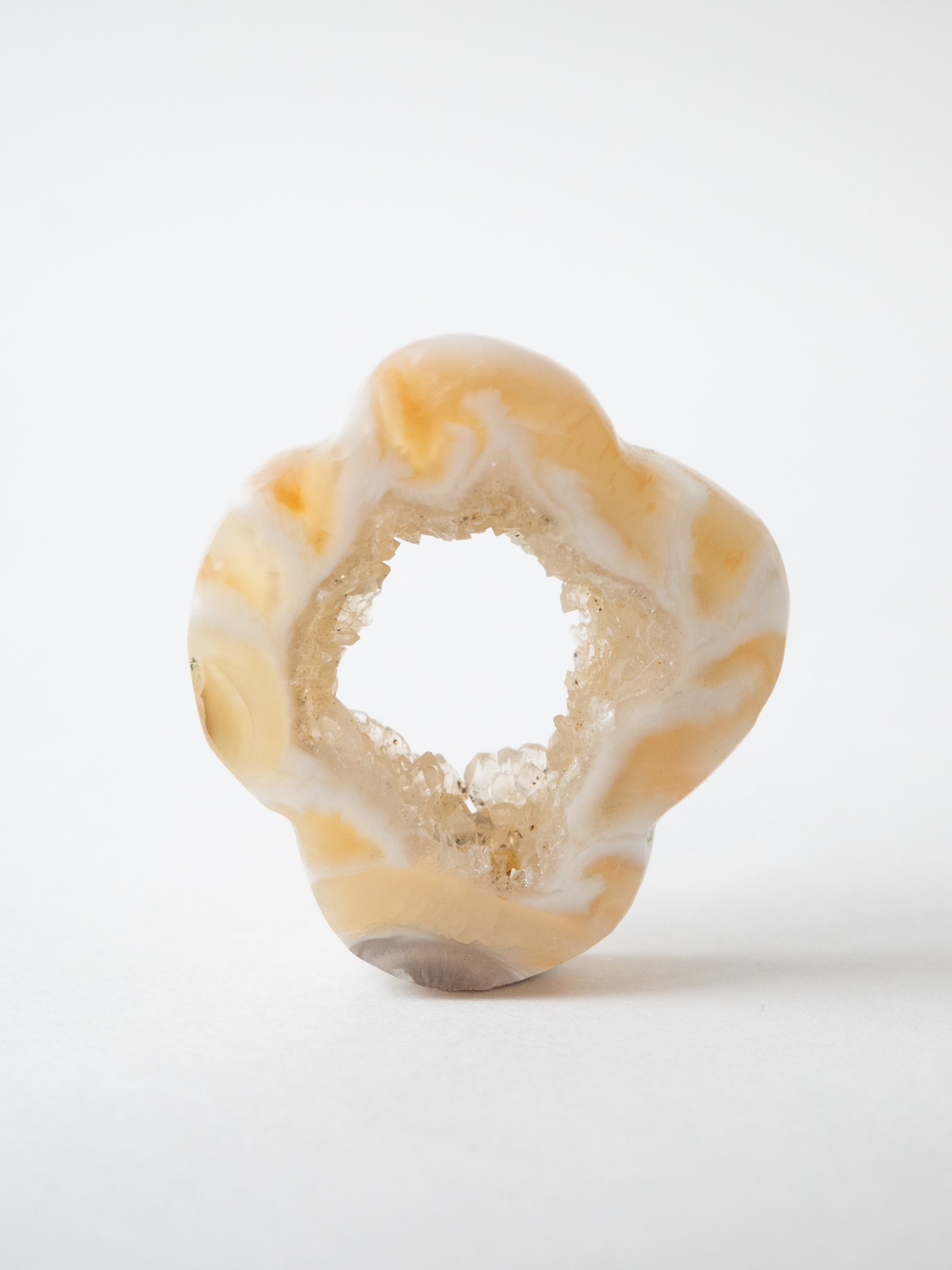 This druzy agate, known for its small sparkling crystals, has been cut into a flower-like form.