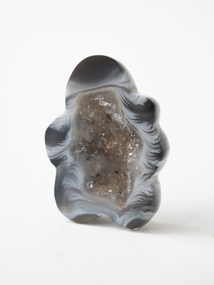 ドゥルジーアゲートは、火山活動によってできた岩石の空洞の中で、シリカ成分を含んだ地下水がゆっくりと沈殿し、長い時間をかけて形成されたアゲート(瑪瑙)。その成長の最終段階で、空洞の表面に微細な水晶結晶が無数に結晶化すると、ドゥルージー(結晶面)が生まれます。