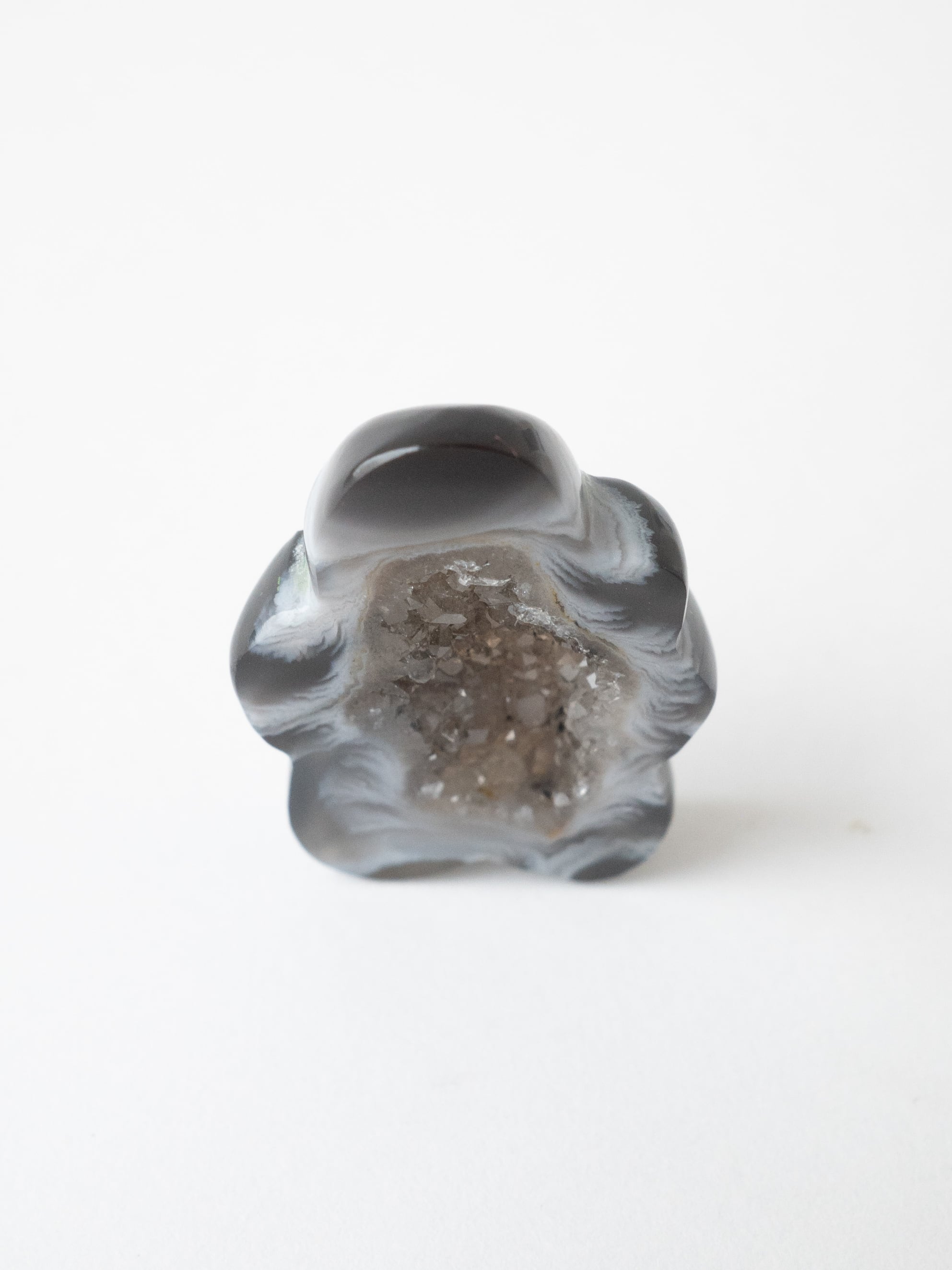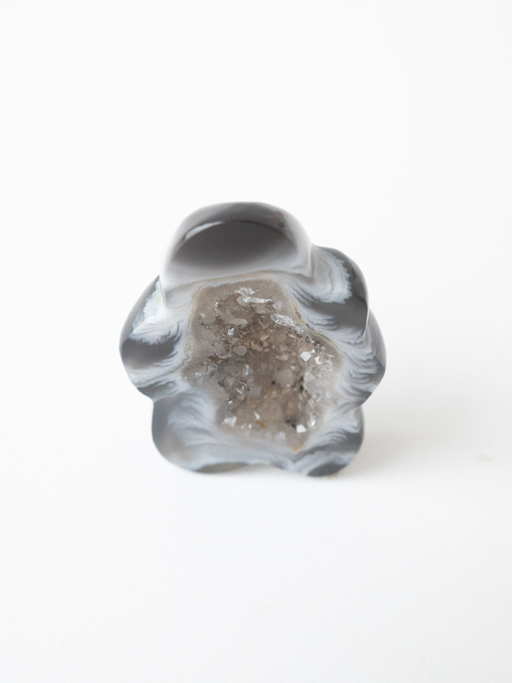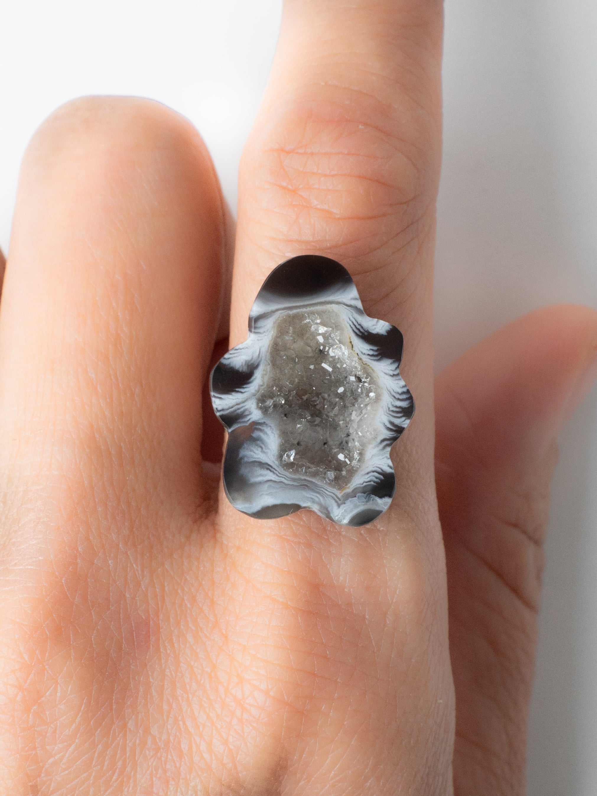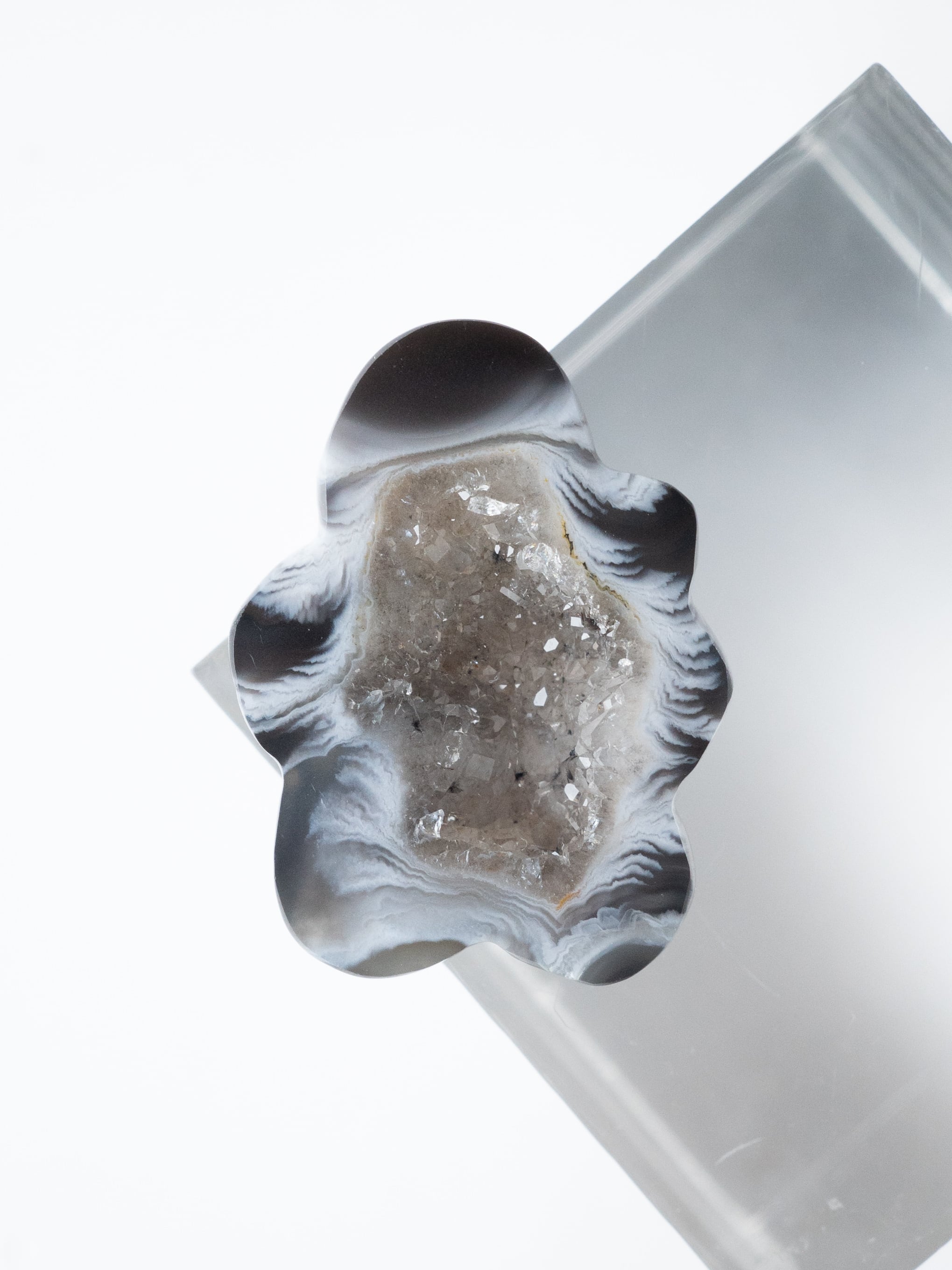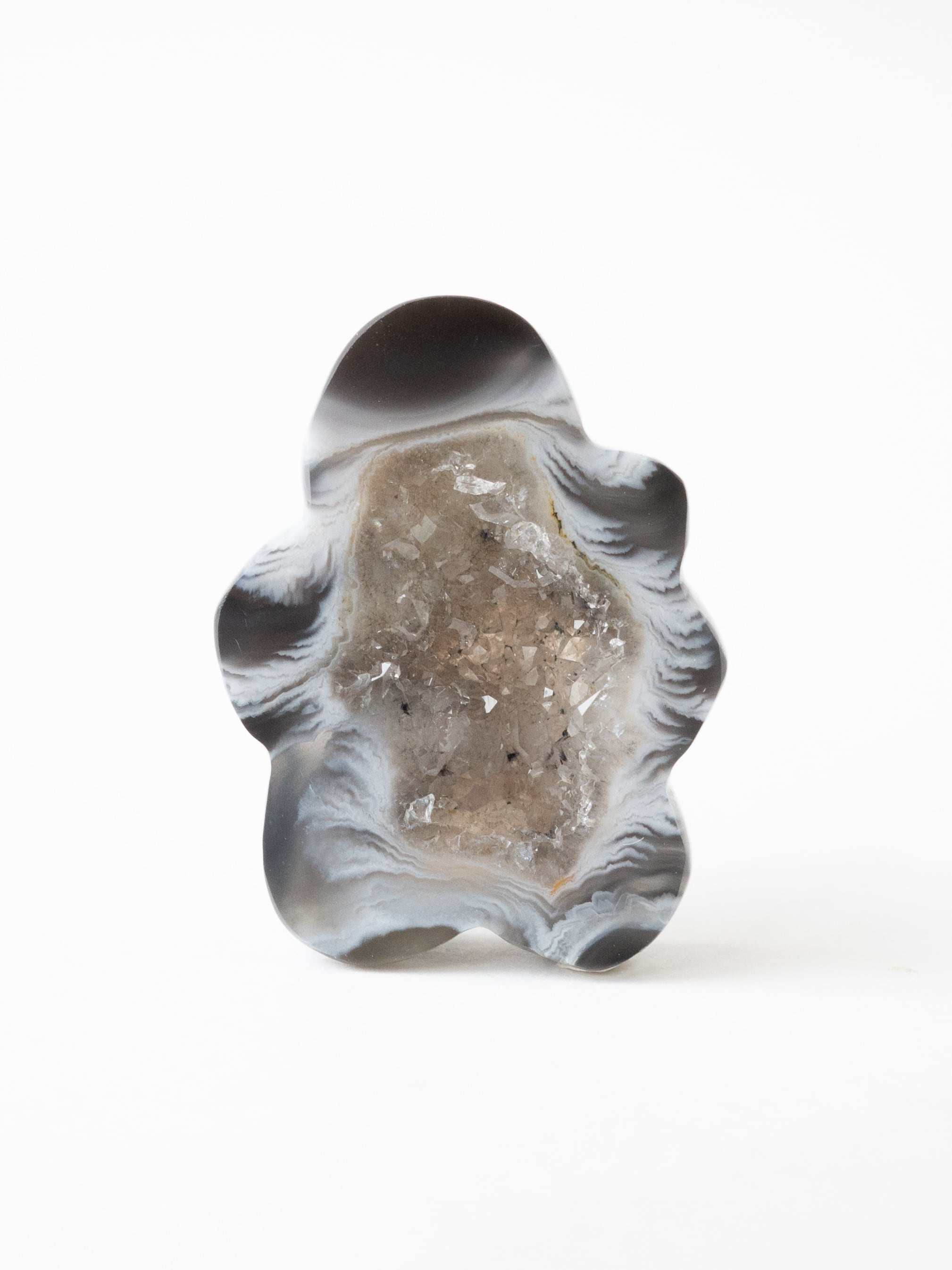This druzy agate, known for its small sparkling crystals, has been cut into a flower-like form.