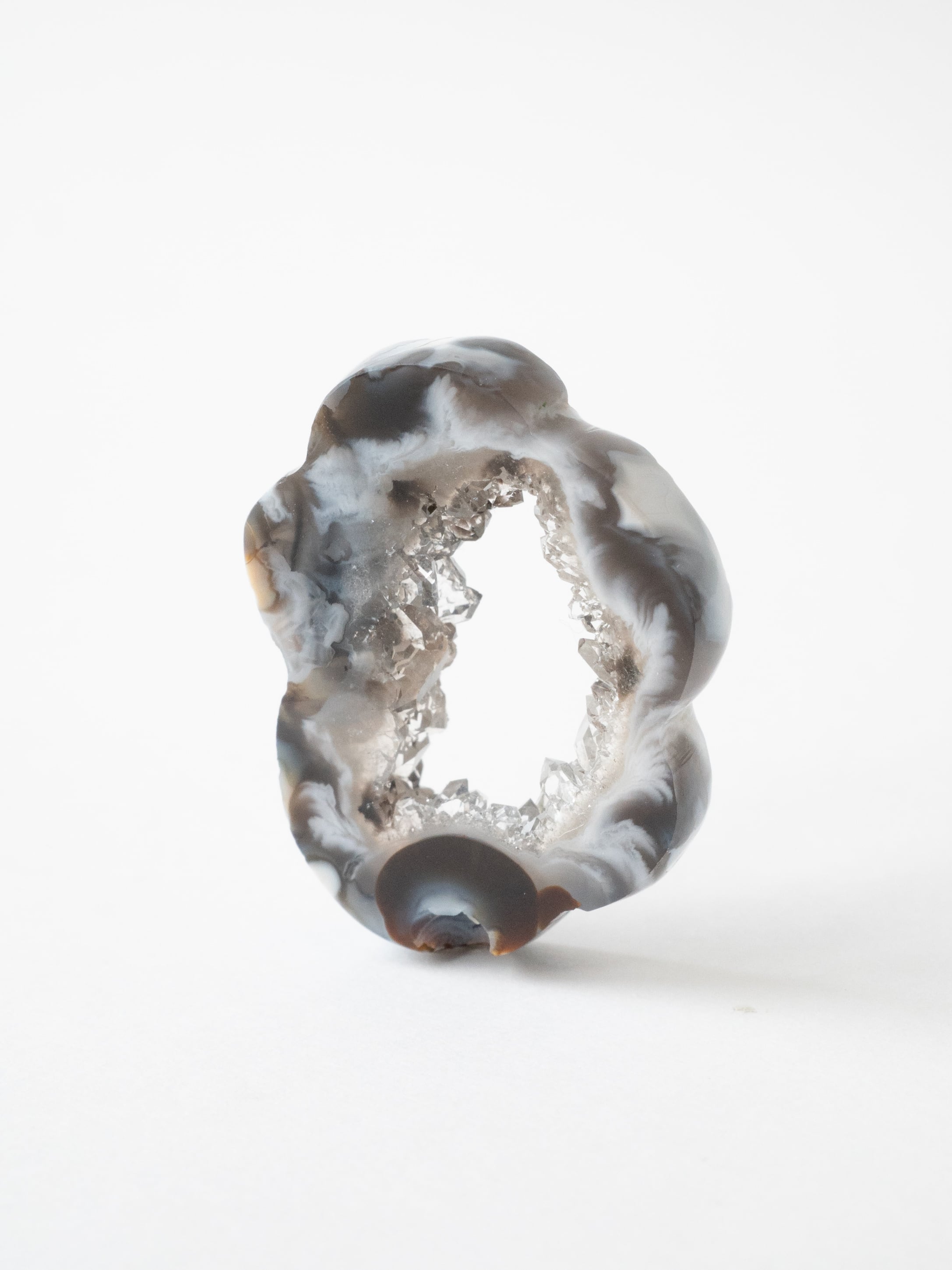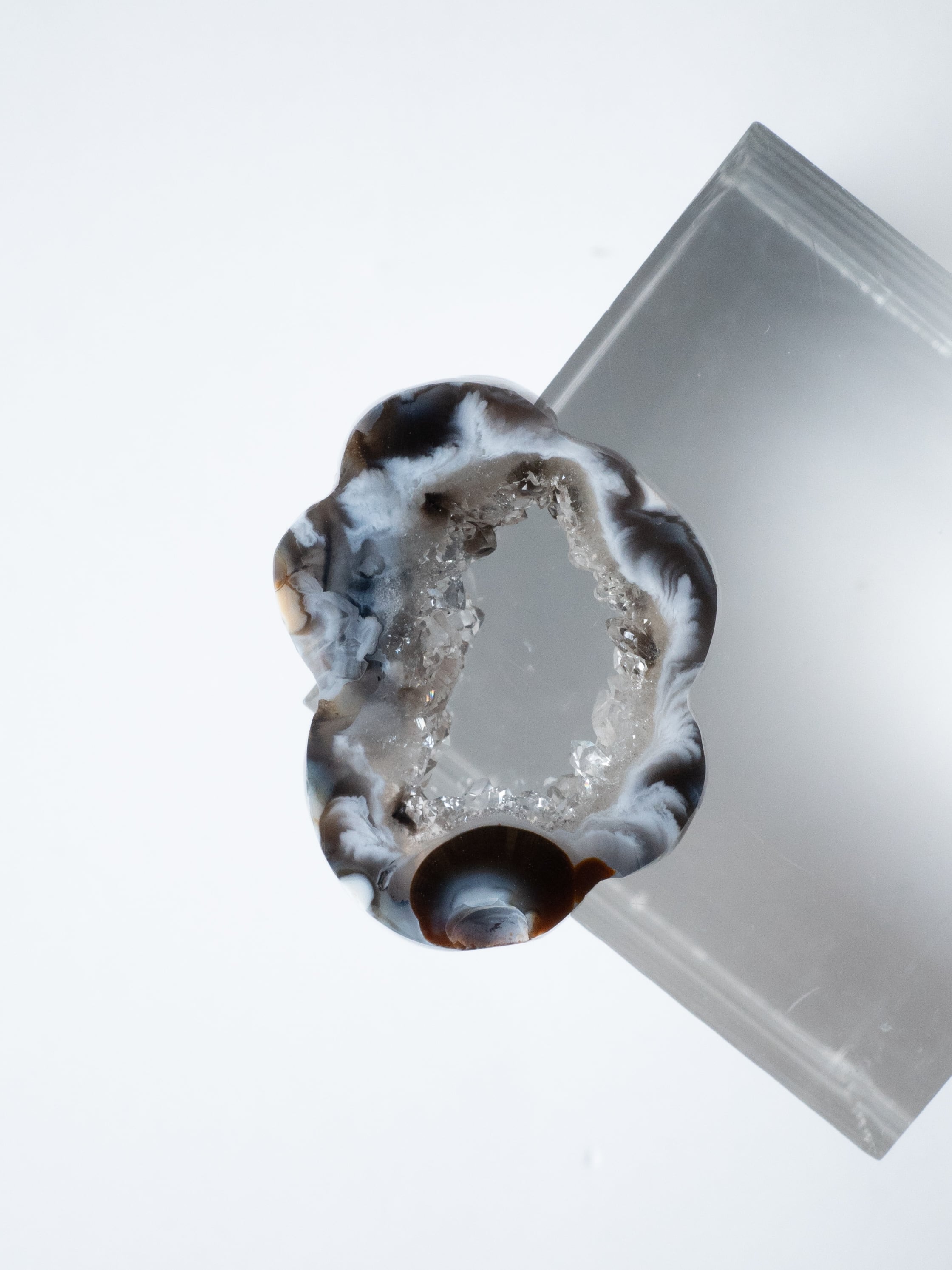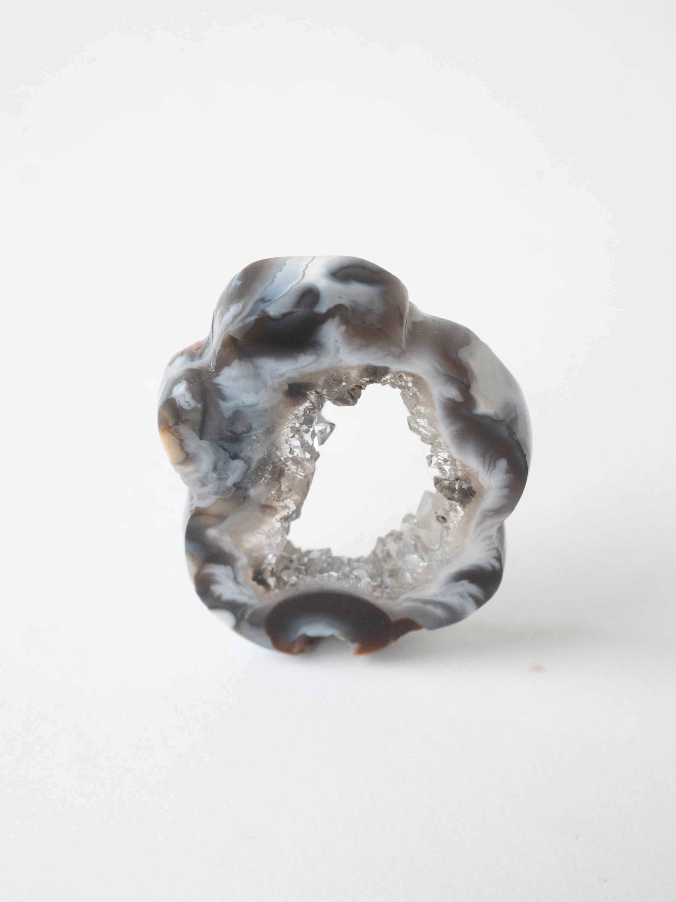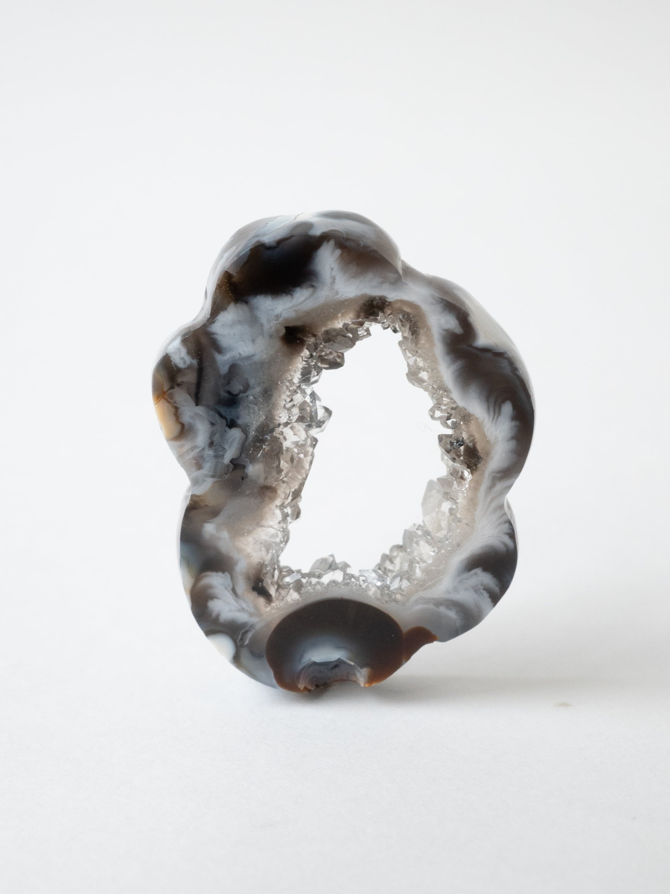 This druzy agate, known for its small sparkling crystals, has been cut into a flower-like form.