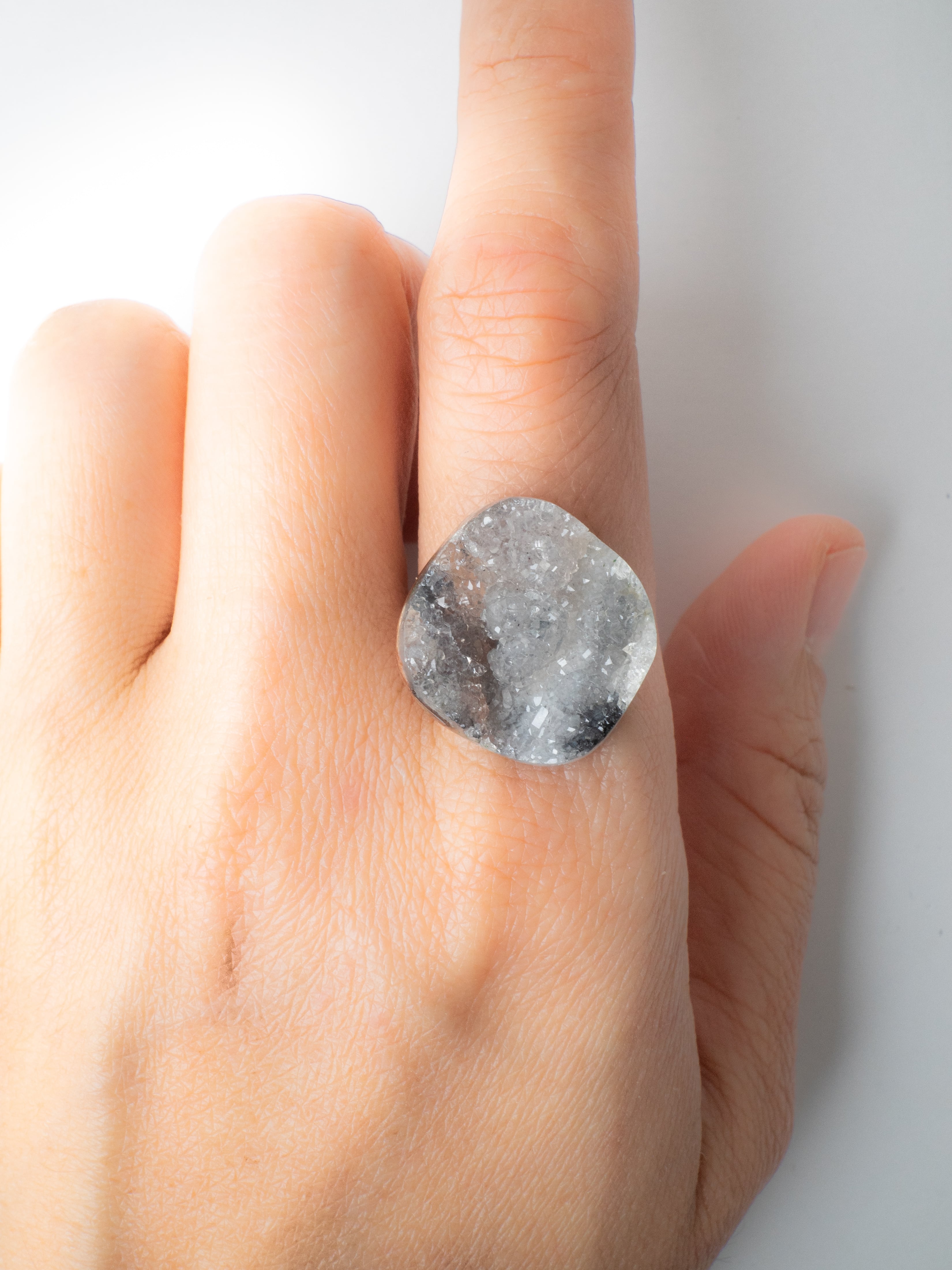 キラキラとした小さな結晶が美しいドゥルジーアゲートを、お花のようなフォルムにカットしました。雲のように見えるものもありますね。自然の形を生かしたカットなので、可愛らしさに偏りすぎないバランスの取れたデザインです。