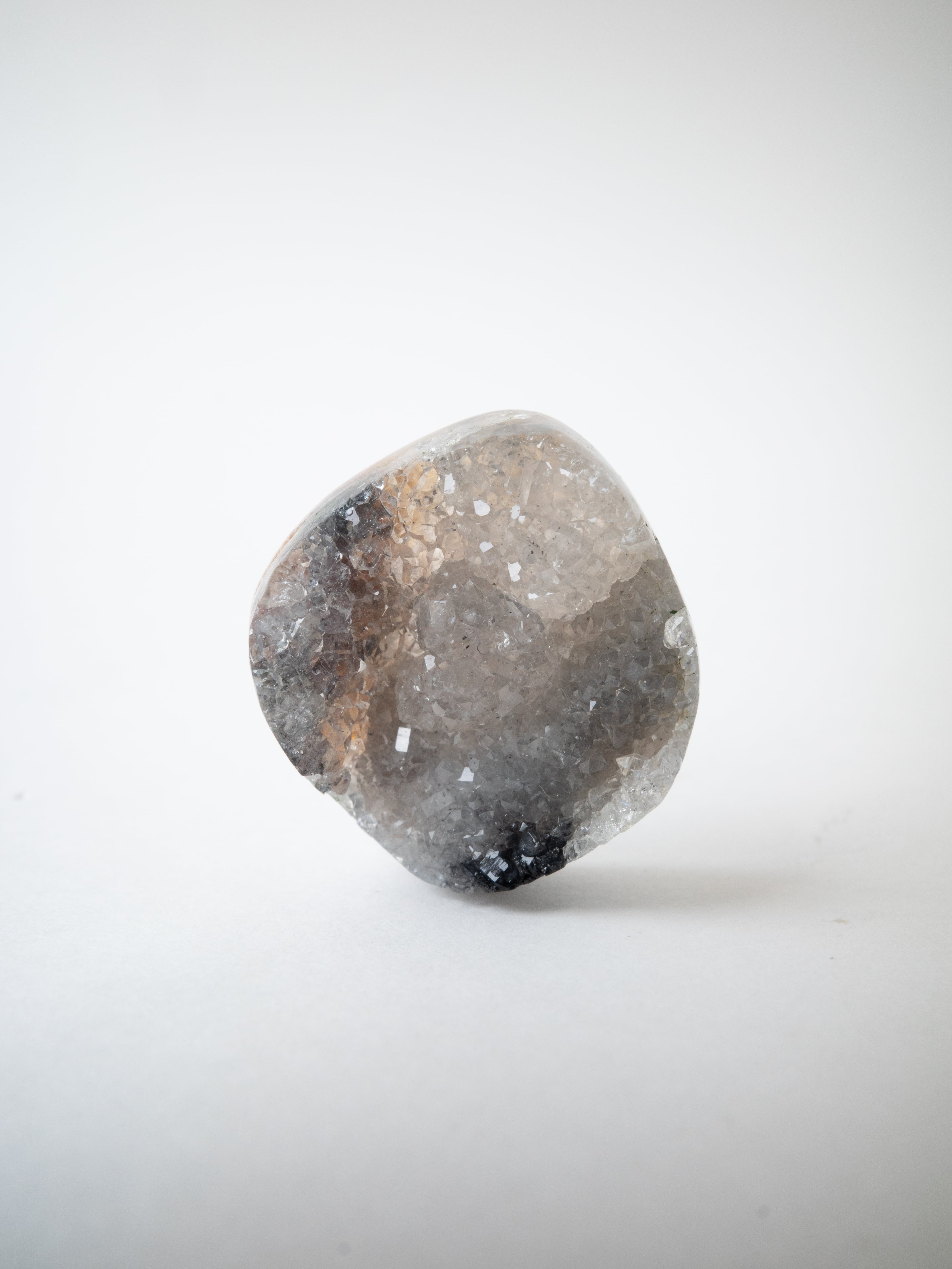 Druzy agate is a type of agate that forms inside cavities of rocks created by volcanic activity. Silica-rich groundwater slowly precipitates inside these cavities, and over a long period of time agate (chalcedony) is formed. In the final stage of its growth, countless microscopic quartz crystals crystallize on the surface of the cavity, forming what is known as a druzy crystal layer.