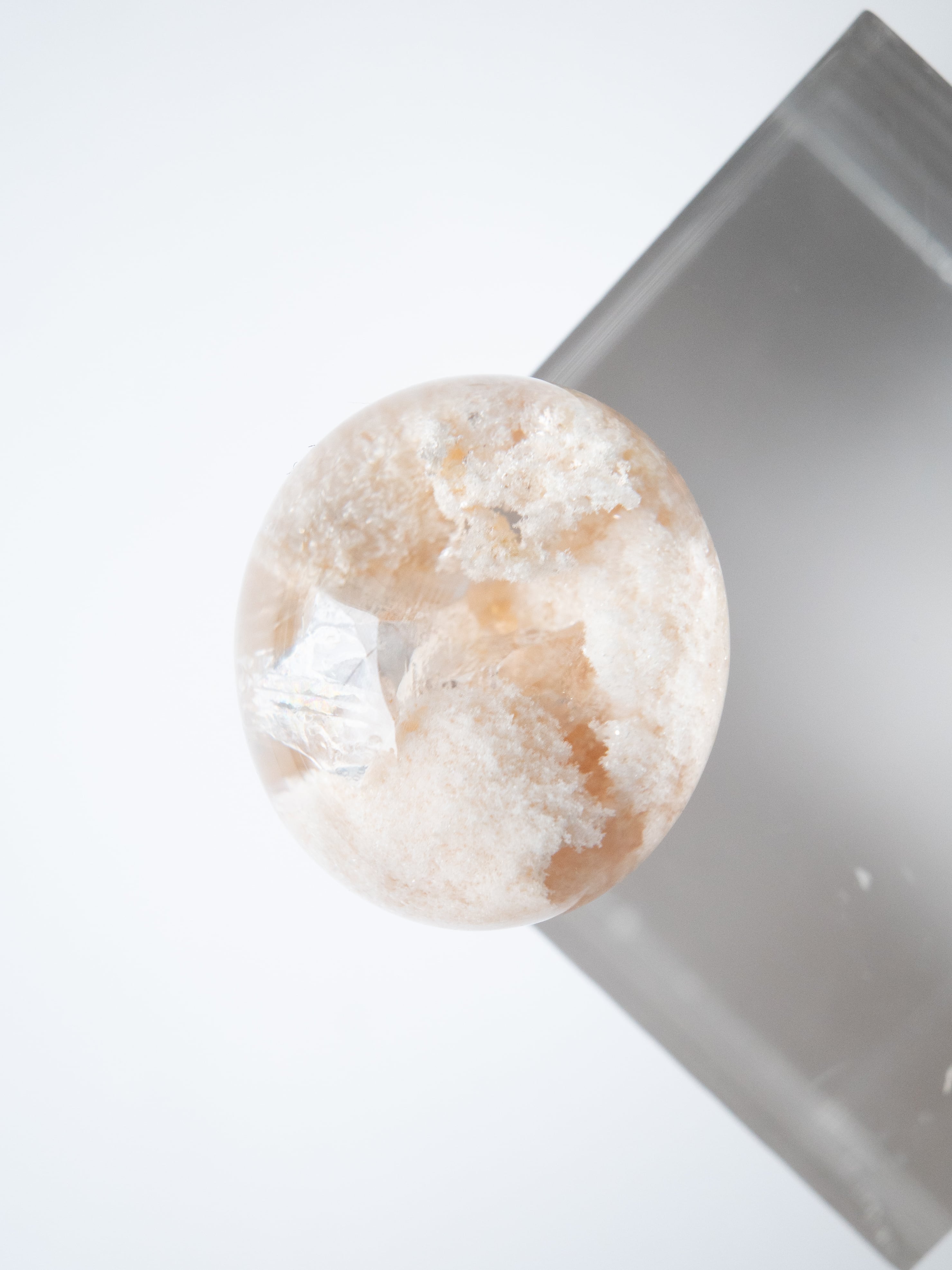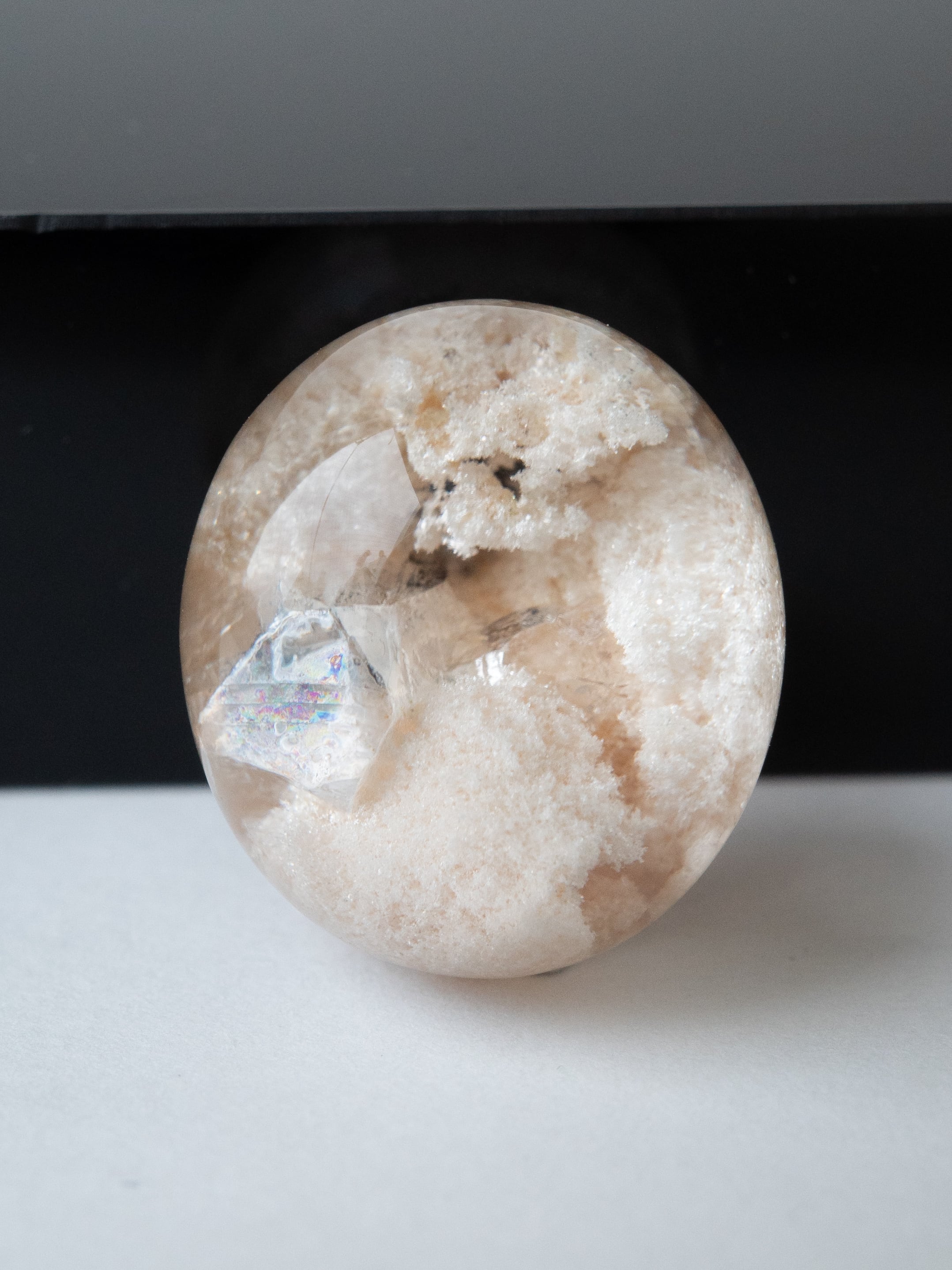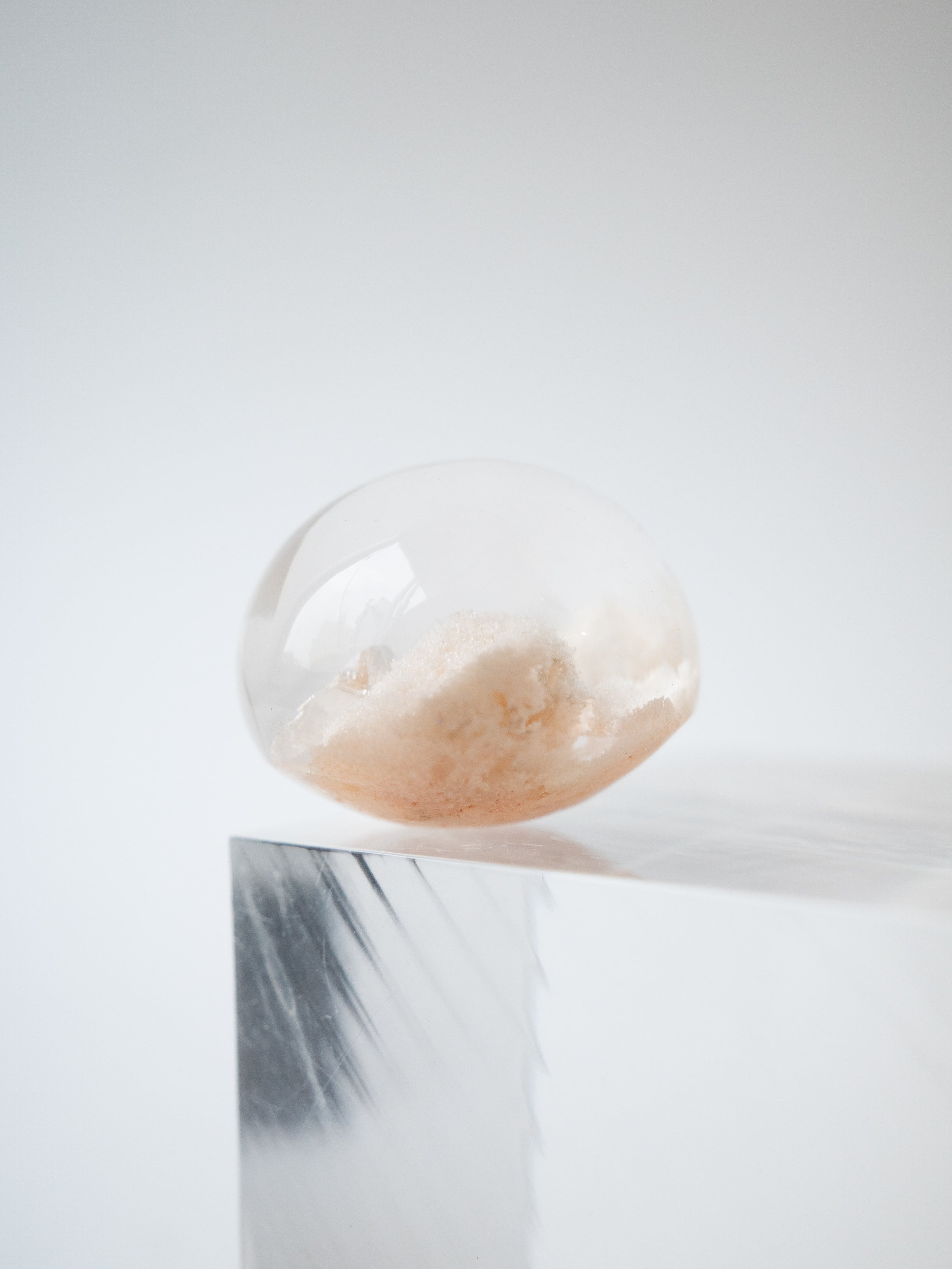 This particular piece is a penetration-type specimen that contains a crystal within the quartz. The internal crystal creates depth and structure, forming a quiet landscape that seems to have captured a moment in time.