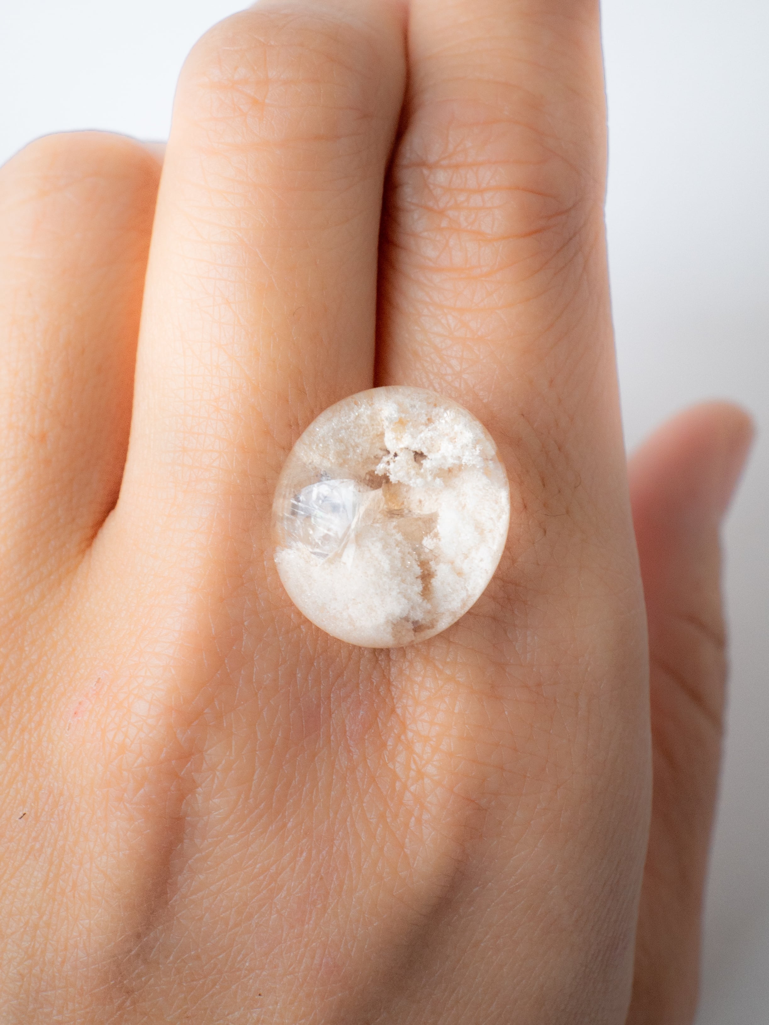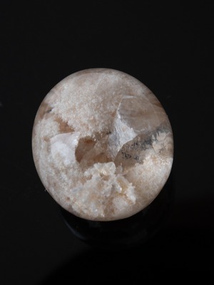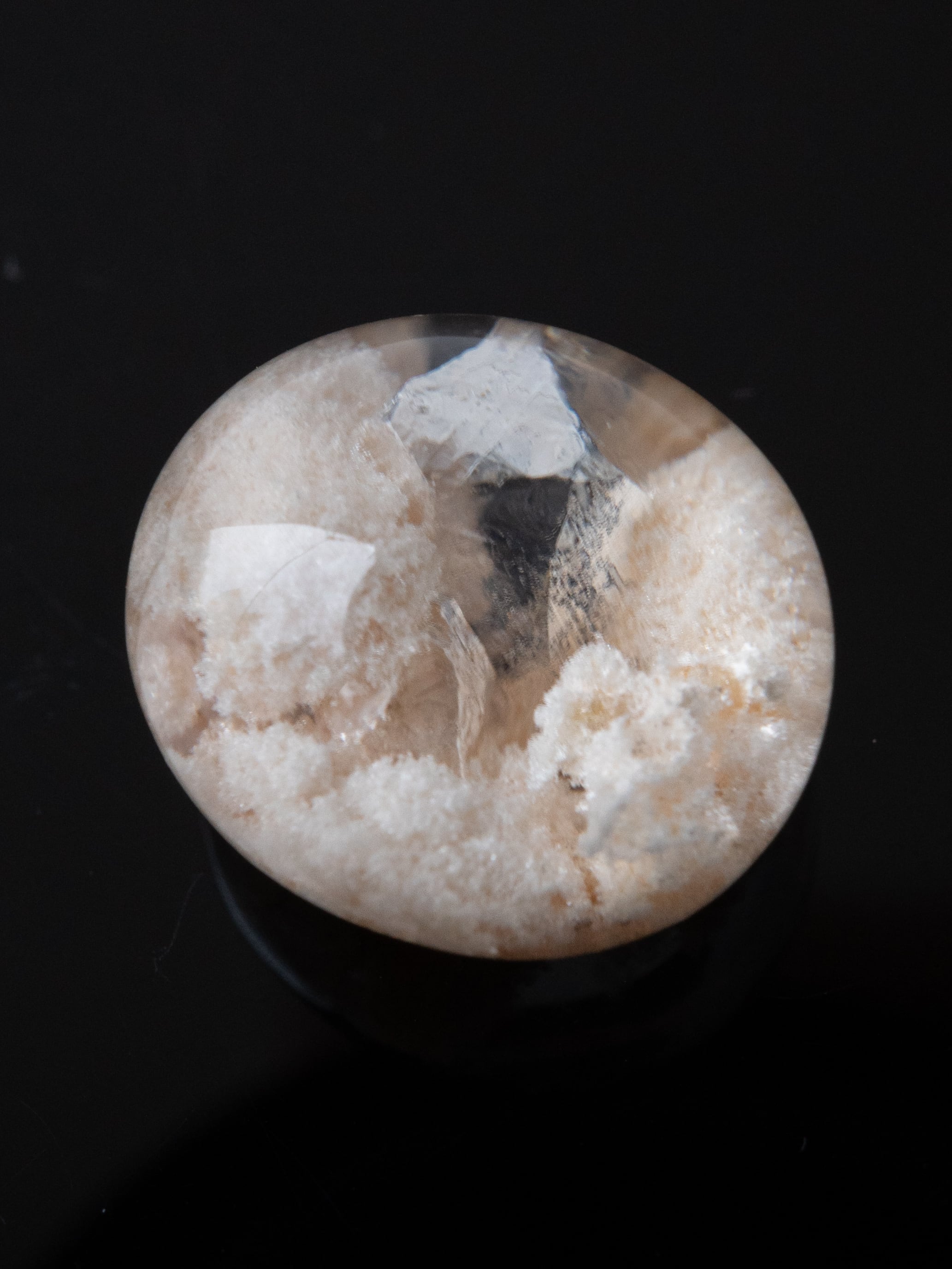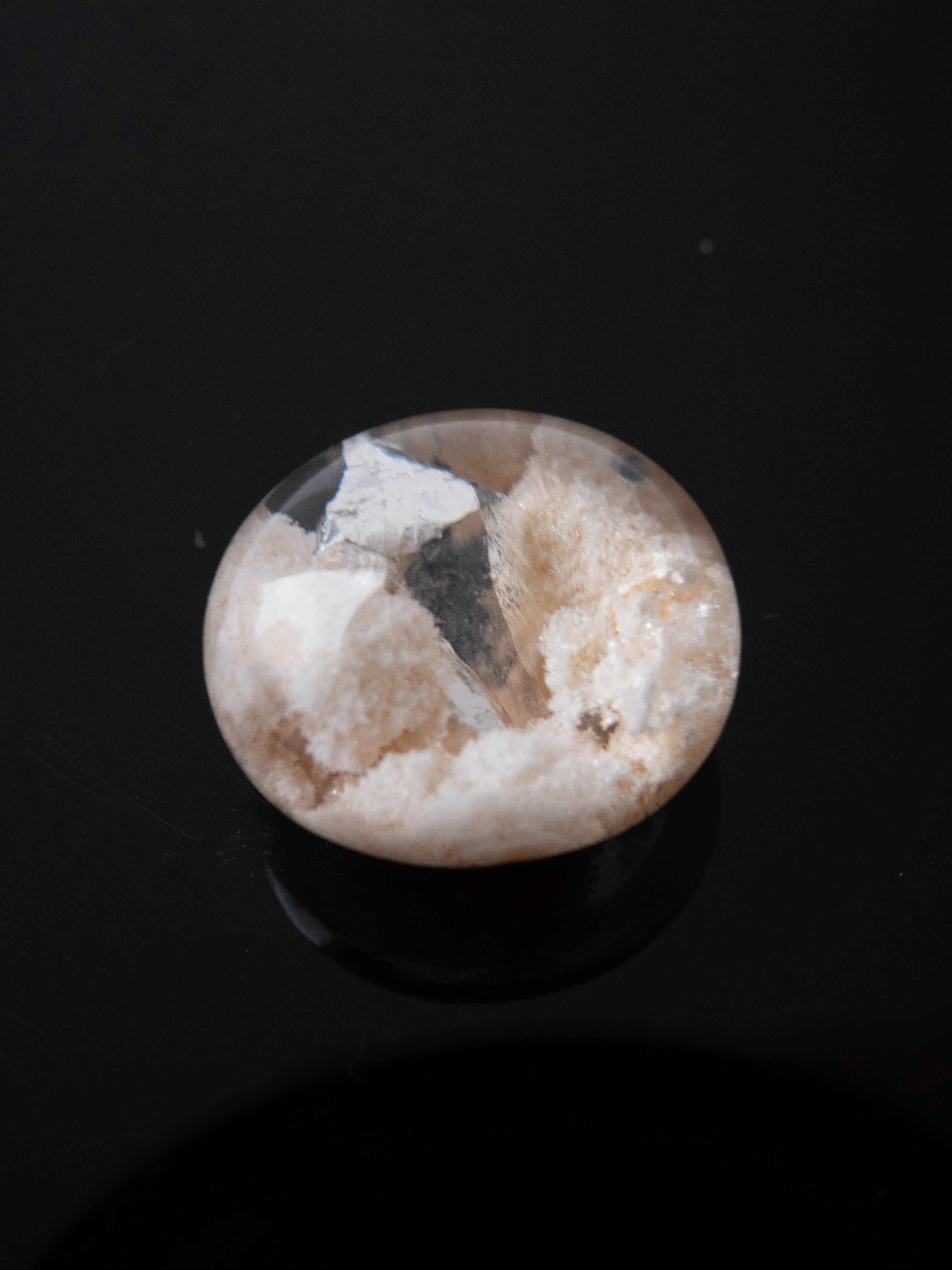 このタイプの石は底の方にイングルージョンを配置しカボションにすることで、水晶のレンズ効果により内包物を拡大させるようにカットされたものが多く、裏面には原石肌が残っているものや、充填処理が施されている石もございます。ご購入前に最後の裏面の写真もご確認ください。また内包物を含んで研磨してあるため面傷の出やすいタイプのルースです。目立つキズは避けていますが、ごく小さなものに関して殆どのルースに入っています。景色の美しさとバランスをみて判断していますので石の特徴としてお考えください。