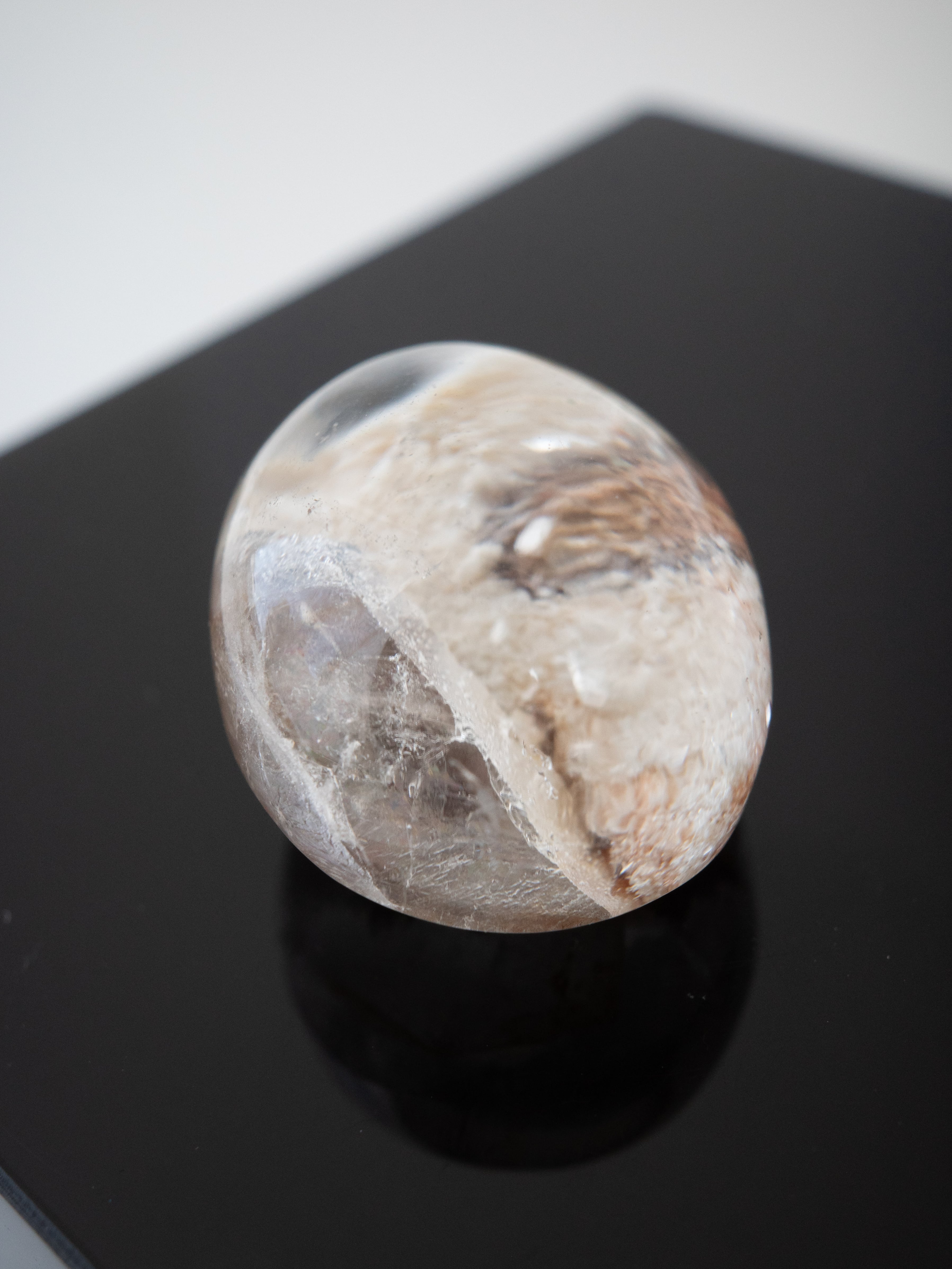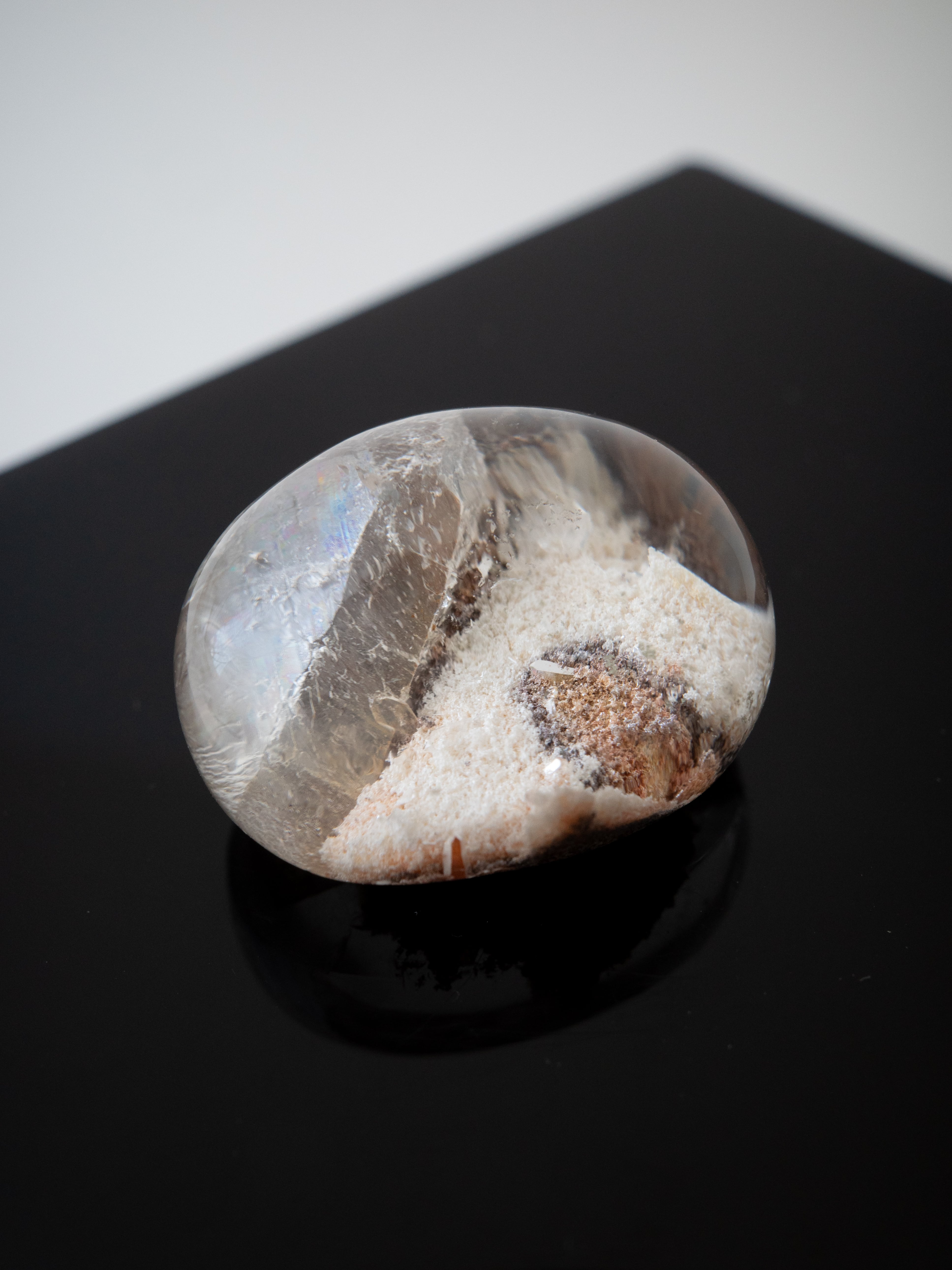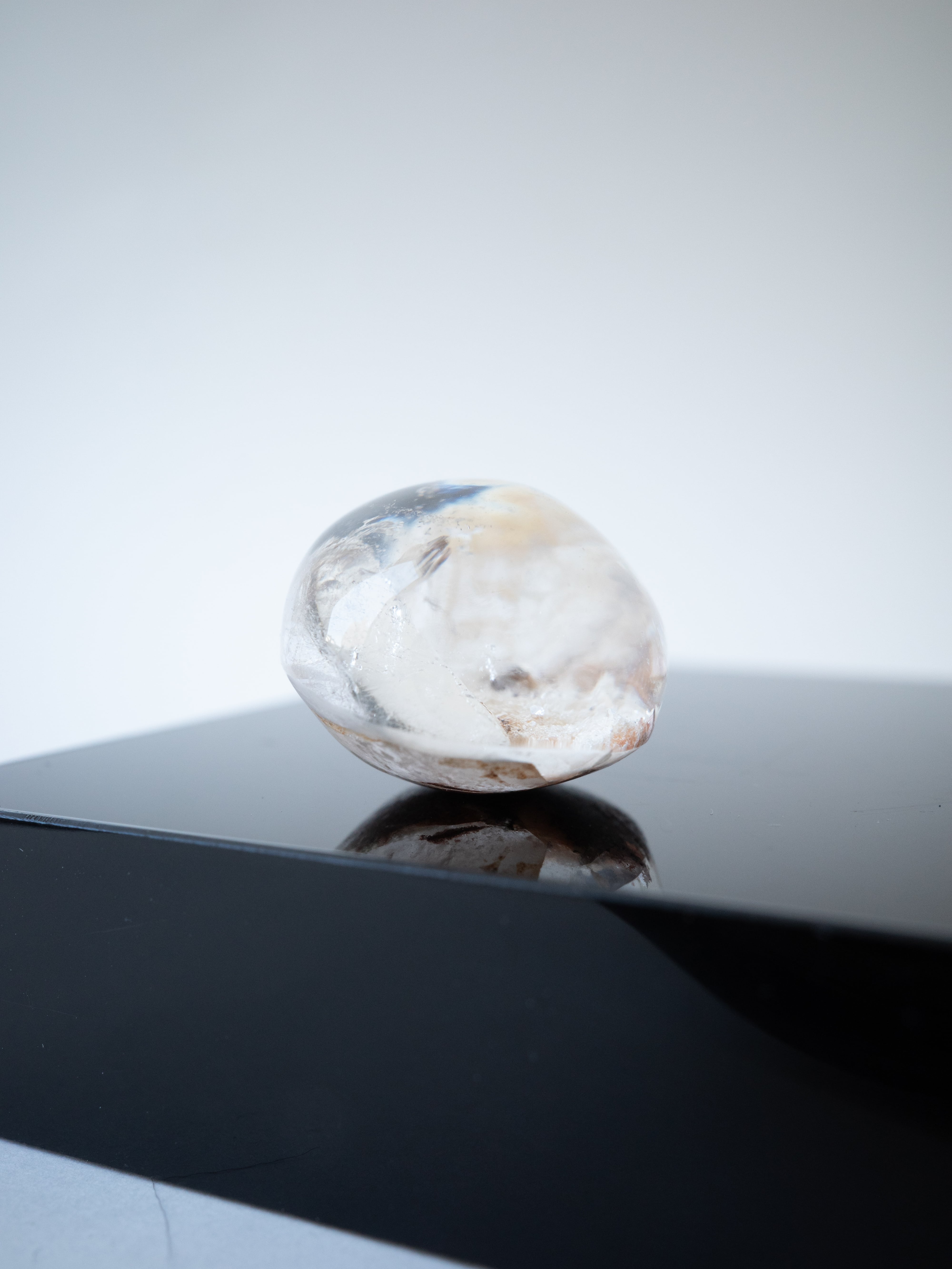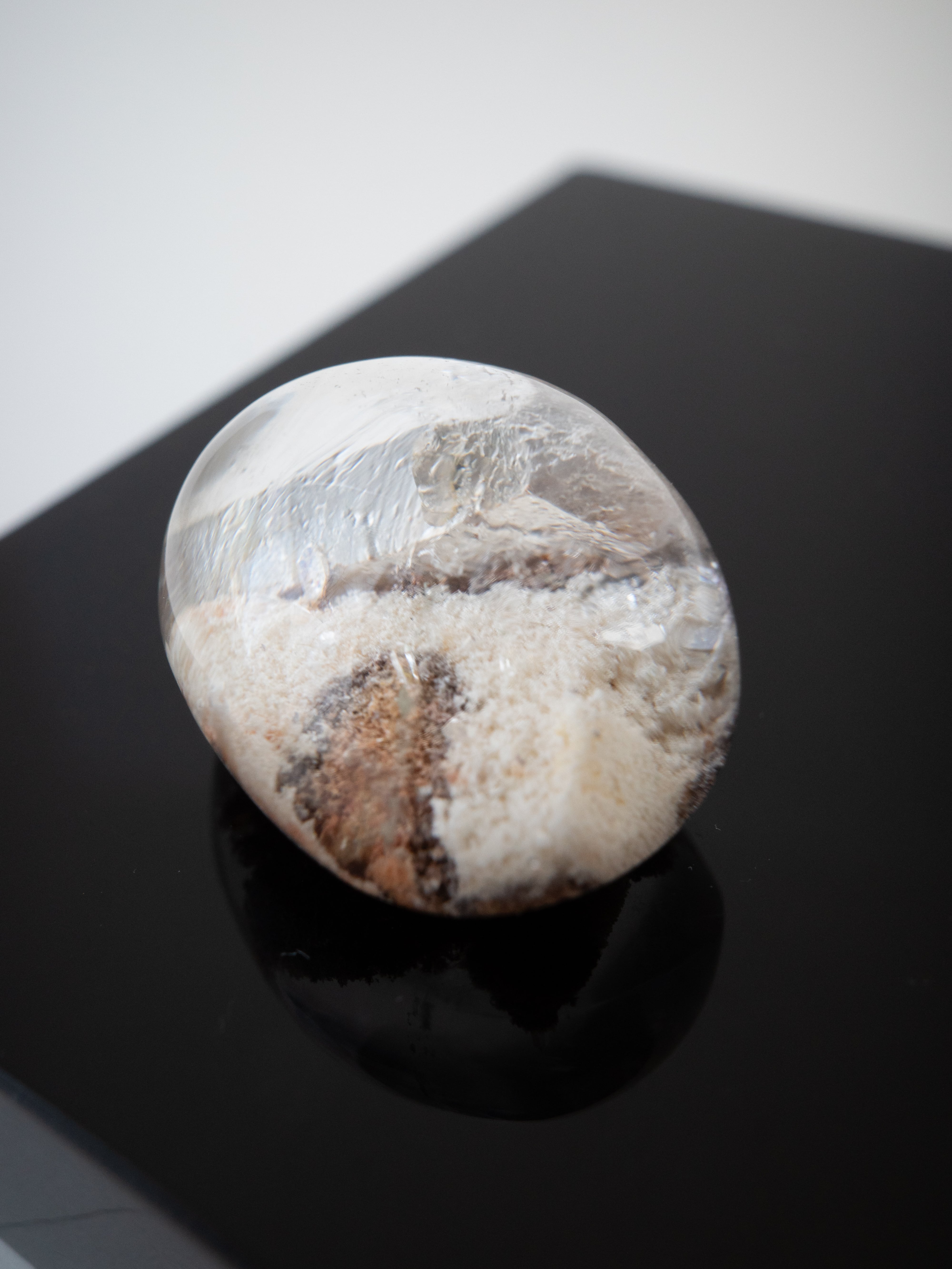 This particular piece is a penetration-type specimen that contains a crystal within the quartz. The internal crystal creates depth and structure, forming a quiet landscape that seems to have captured a moment in time.