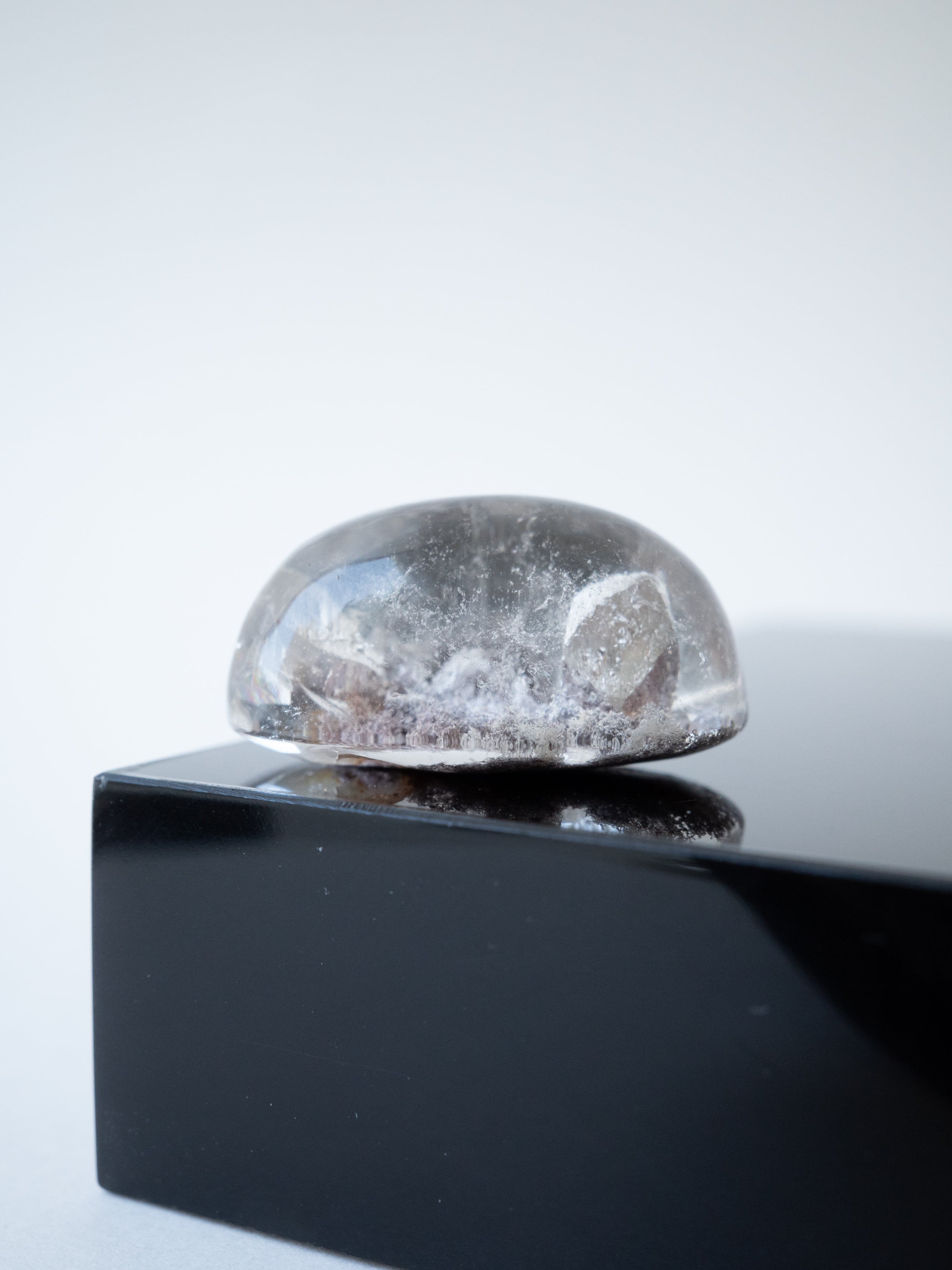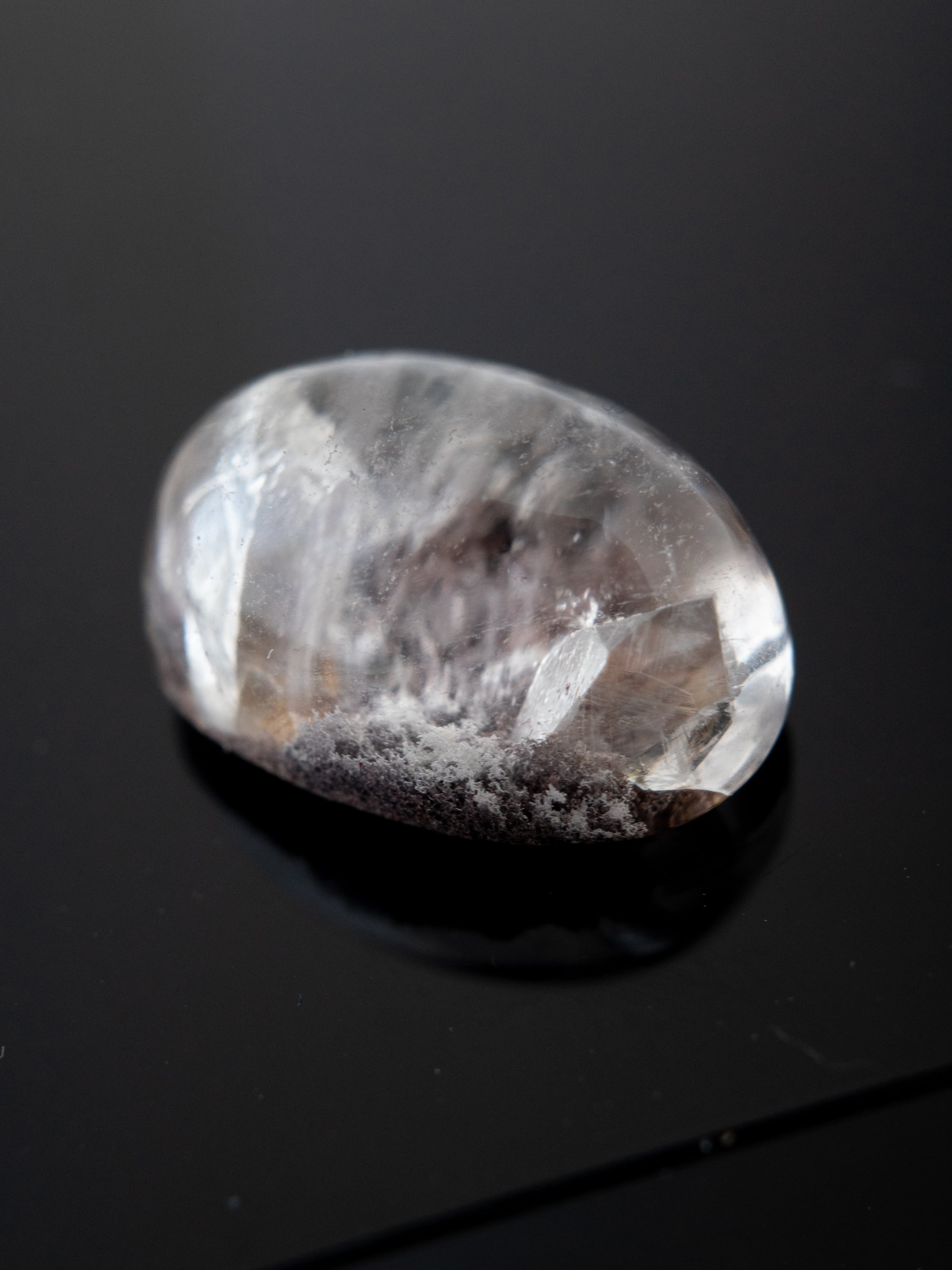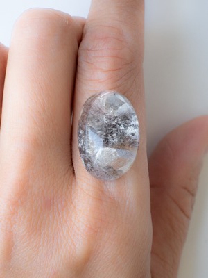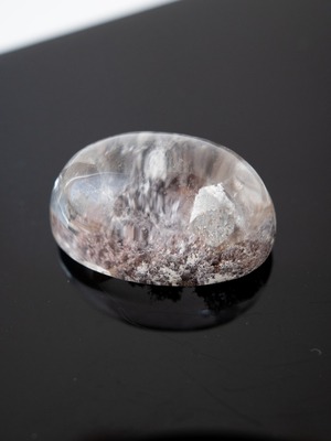 このタイプの石は底の方にイングルージョンを配置しカボションにすることで、水晶のレンズ効果により内包物を拡大させるようにカットされたものが多く、裏面には原石肌が残っているものや、充填処理が施されている石もございます。ご購入前に最後の裏面の写真もご確認ください。また内包物を含んで研磨してあるため面傷の出やすいタイプのルースです。目立つキズは避けていますが、ごく小さなものに関して殆どのルースに入っています。景色の美しさとバランスをみて判断していますので石の特徴としてお考えください。