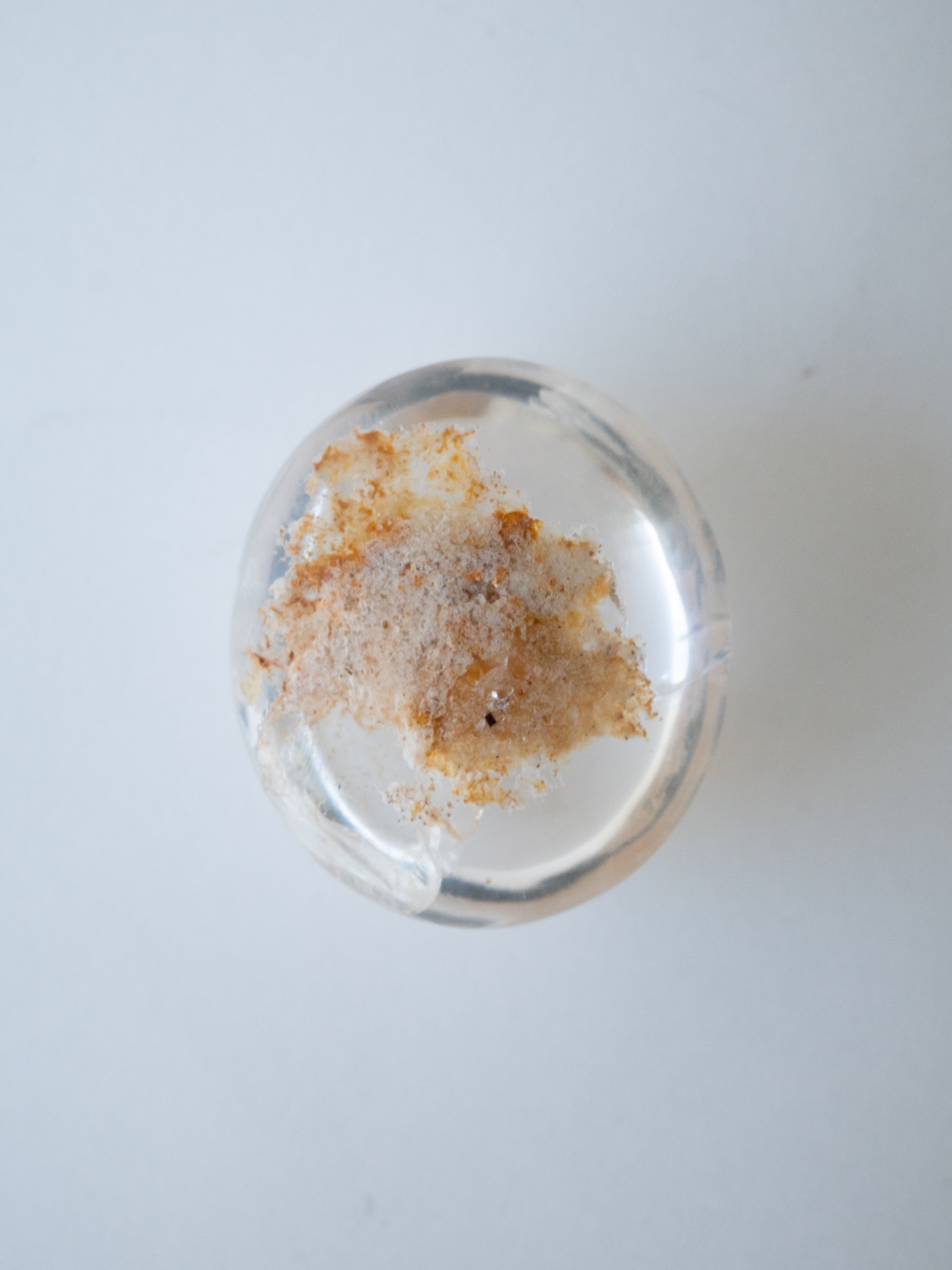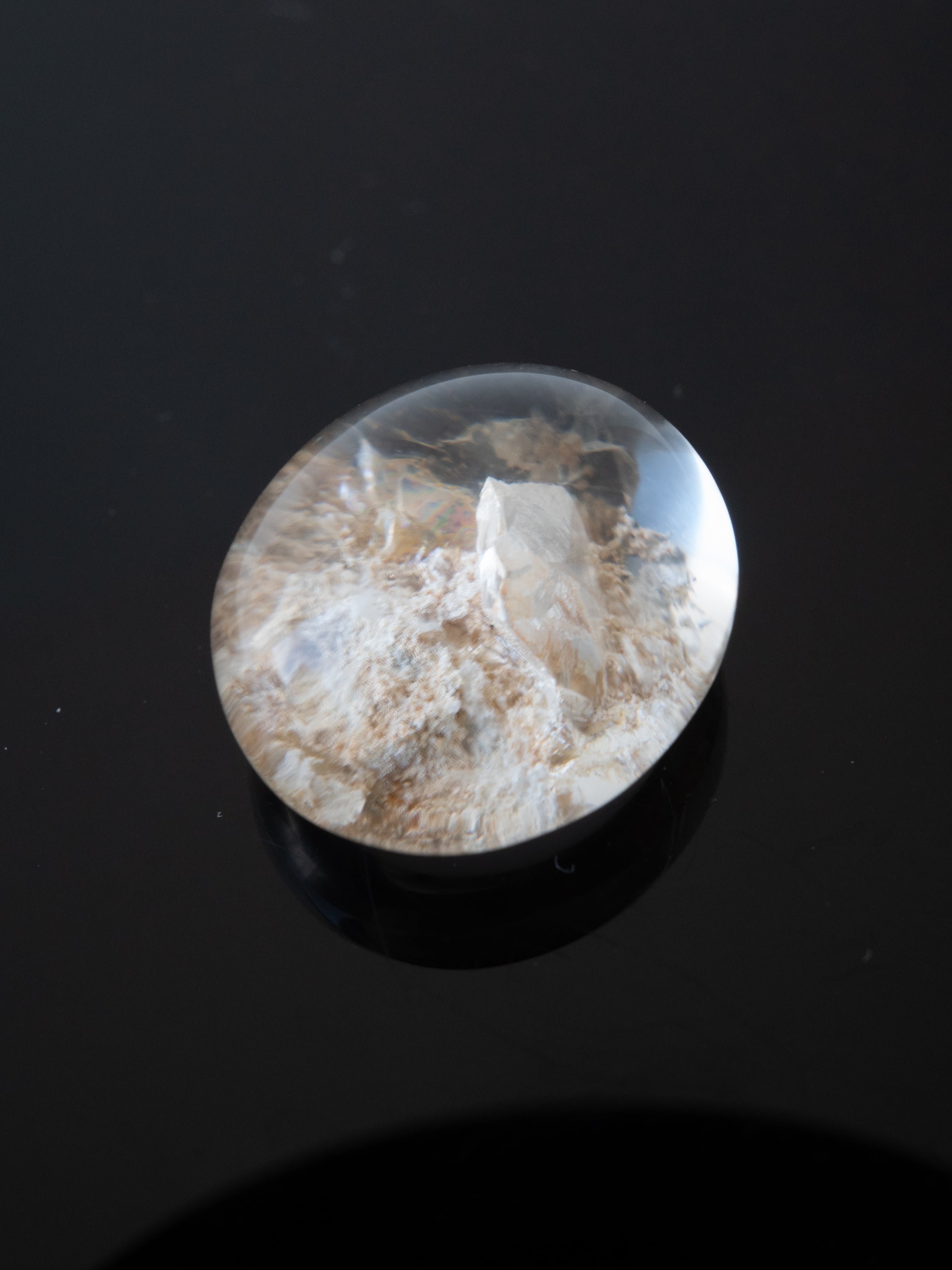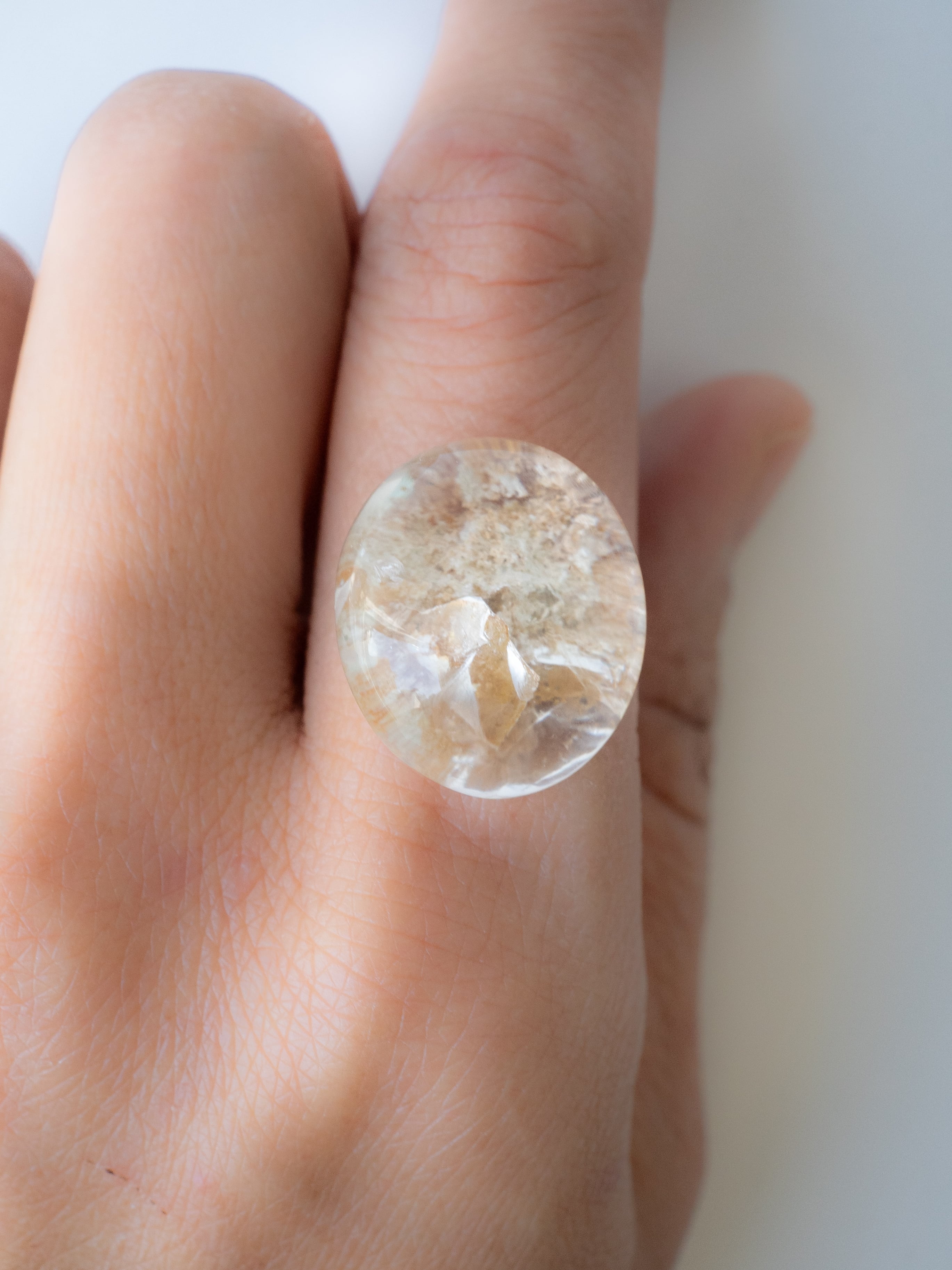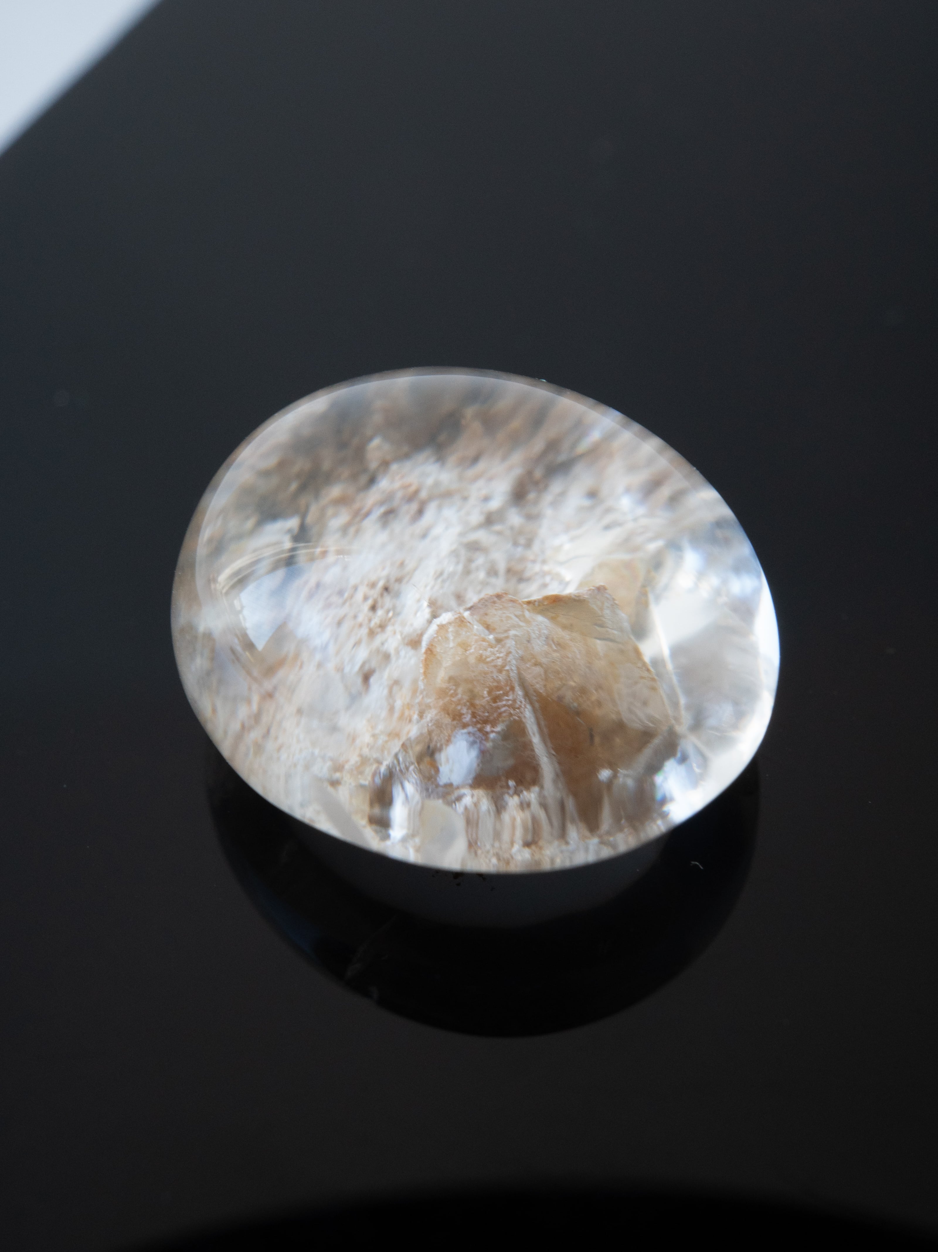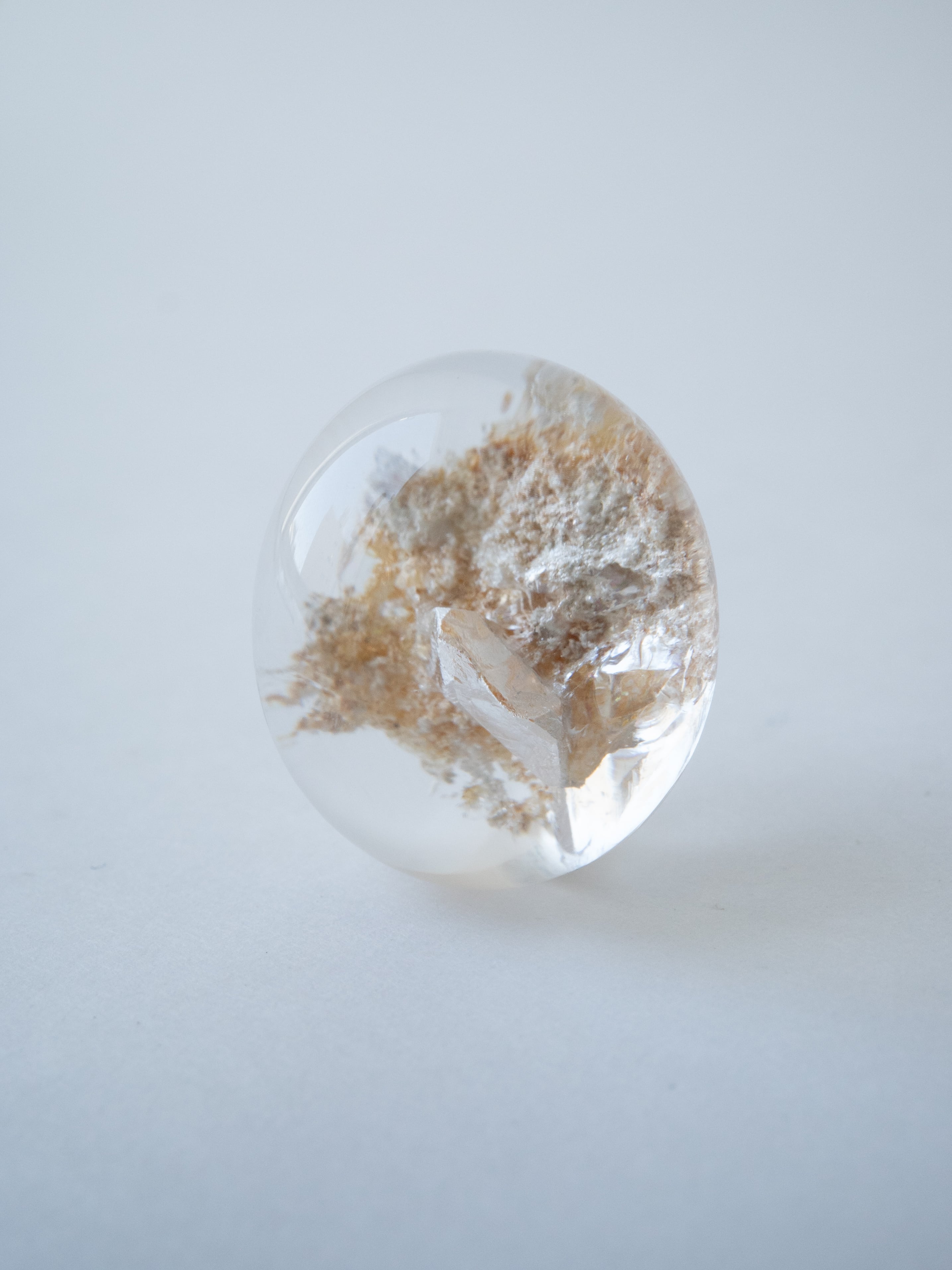 このタイプの石は底の方にイングルージョンを配置しカボションにすることで、水晶のレンズ効果により内包物を拡大させるようにカットされたものが多く、裏面には原石肌が残っているものや、充填処理が施されている石もございます。ご購入前に最後の裏面の写真もご確認ください。また内包物を含んで研磨してあるため面傷の出やすいタイプのルースです。目立つキズは避けていますが、ごく小さなものに関して殆どのルースに入っています。景色の美しさとバランスをみて判断していますので石の特徴としてお考えください。