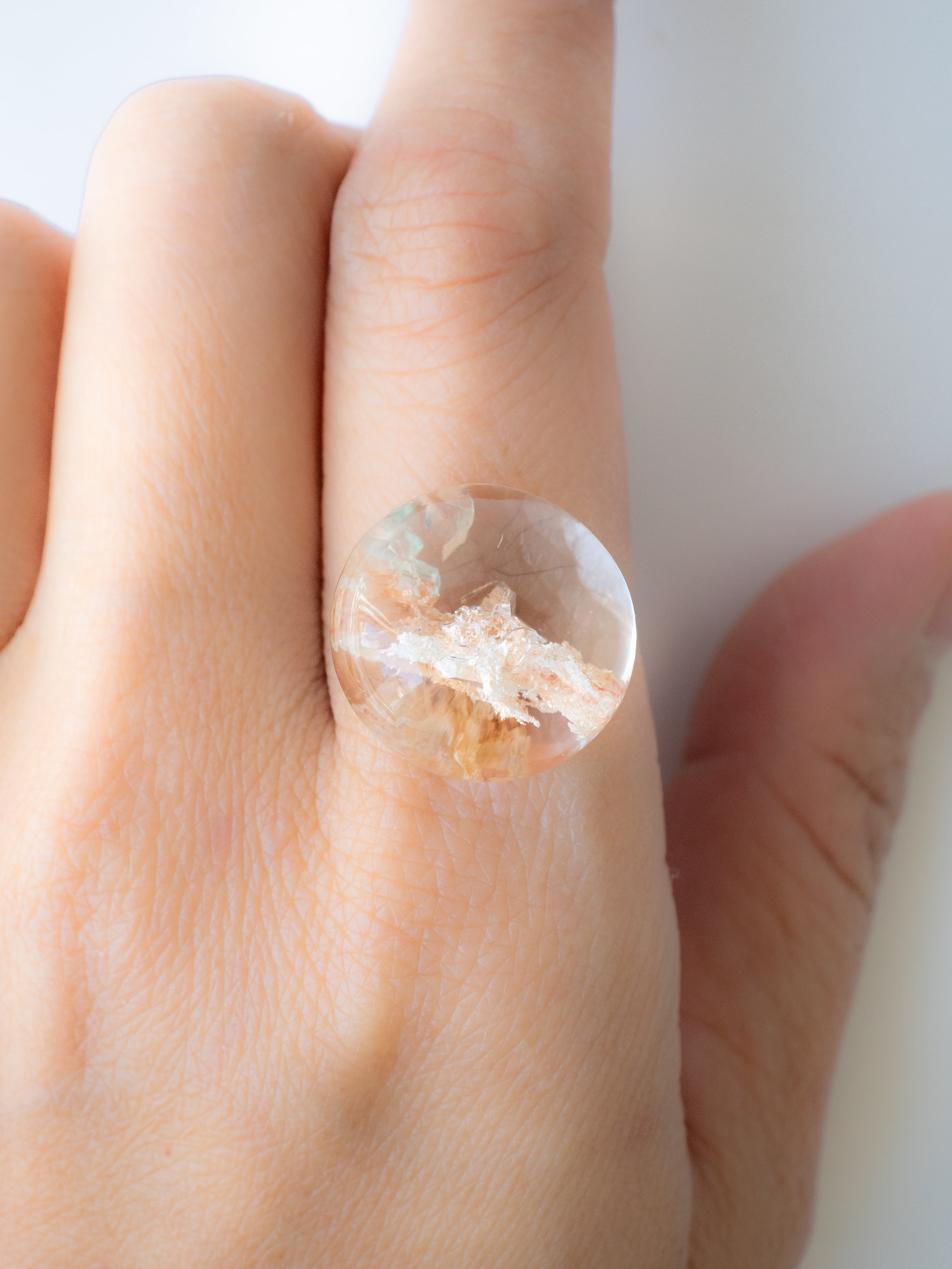 このタイプの石は底の方にイングルージョンを配置しカボションにすることで、水晶のレンズ効果により内包物を拡大させるようにカットされたものが多く、裏面には原石肌が残っているものや、充填処理が施されている石もございます。ご購入前に最後の裏面の写真もご確認ください。また内包物を含んで研磨してあるため面傷の出やすいタイプのルースです。目立つキズは避けていますが、ごく小さなものに関して殆どのルースに入っています。景色の美しさとバランスをみて判断していますので石の特徴としてお考えください。