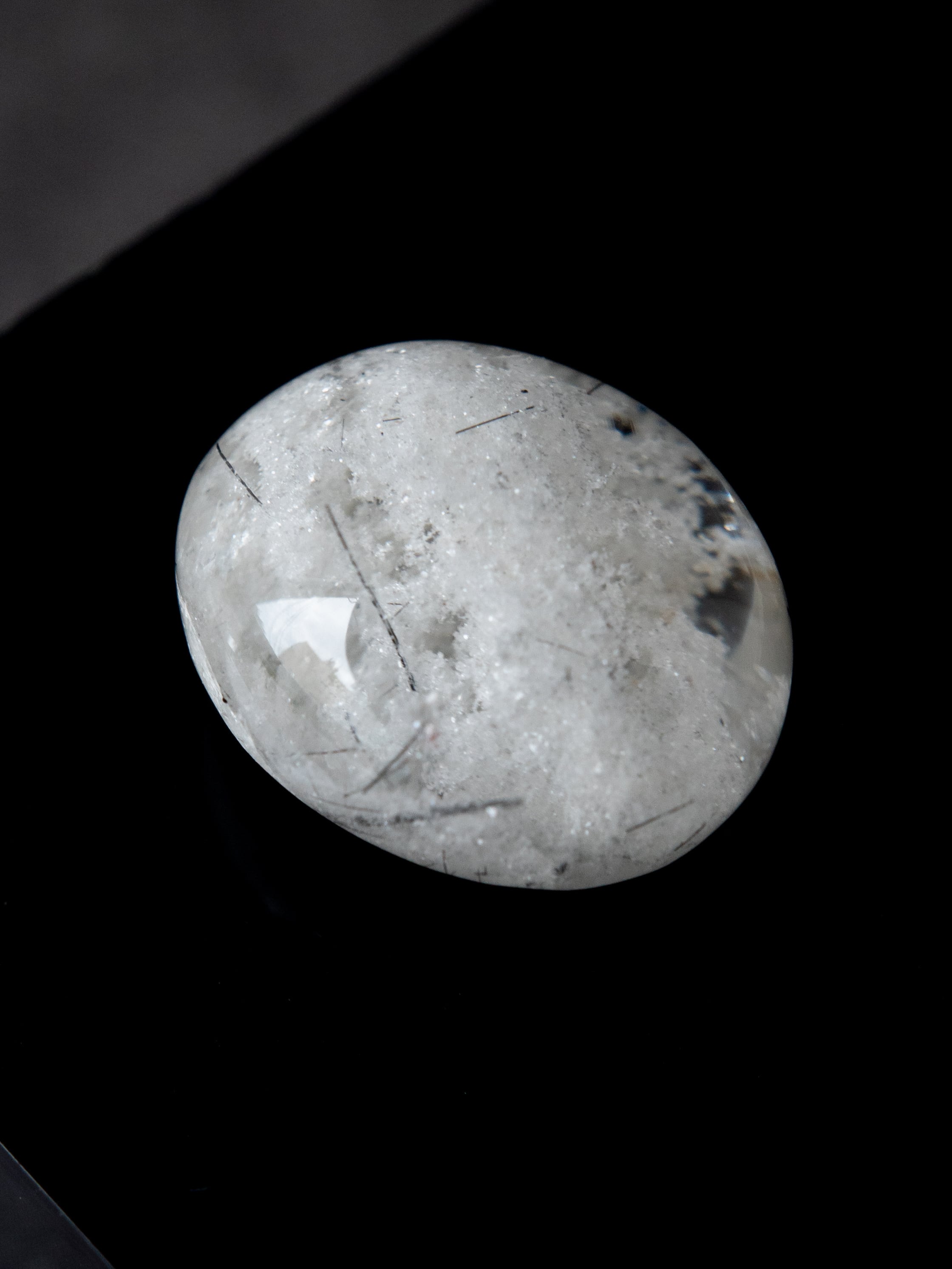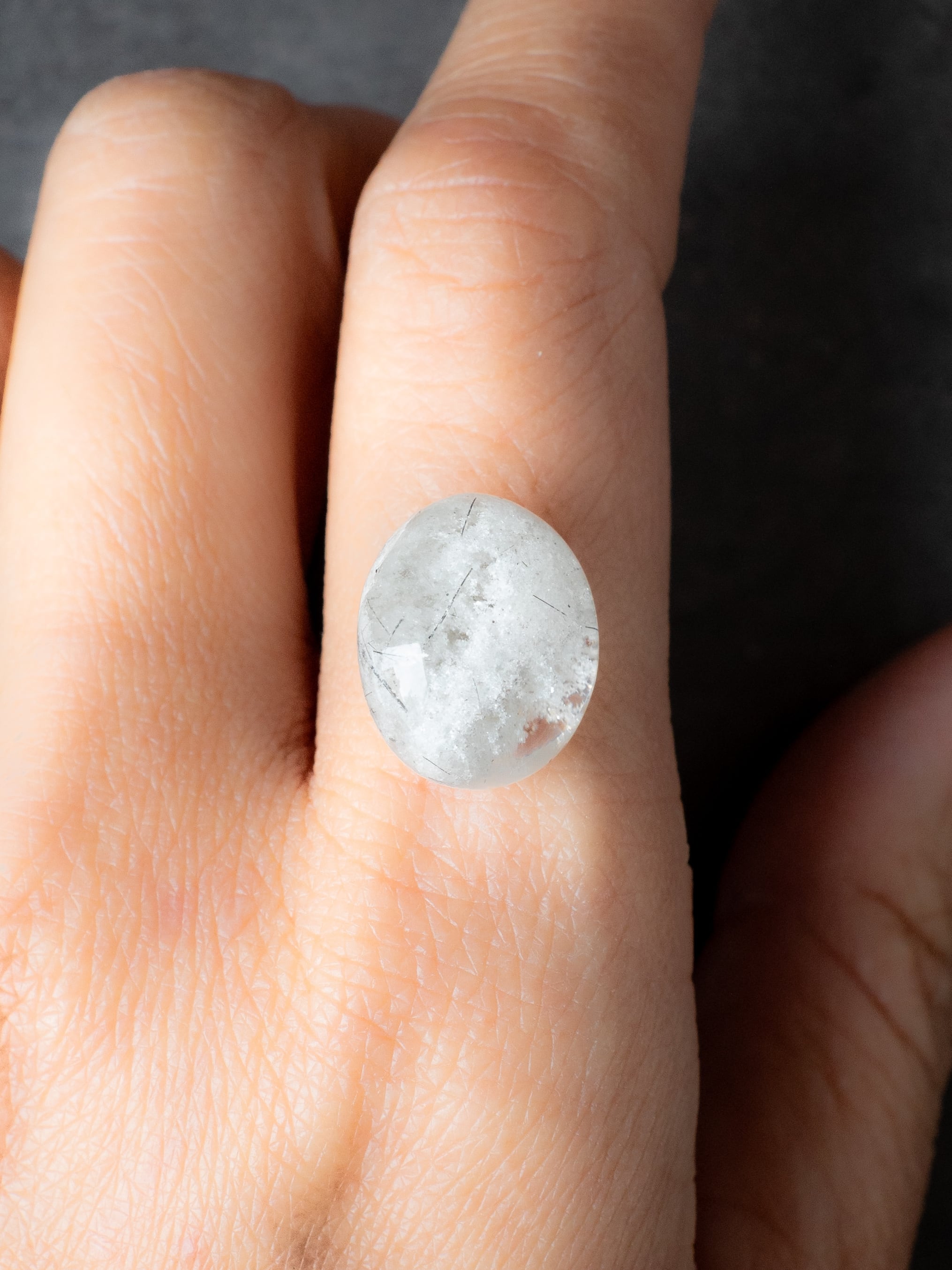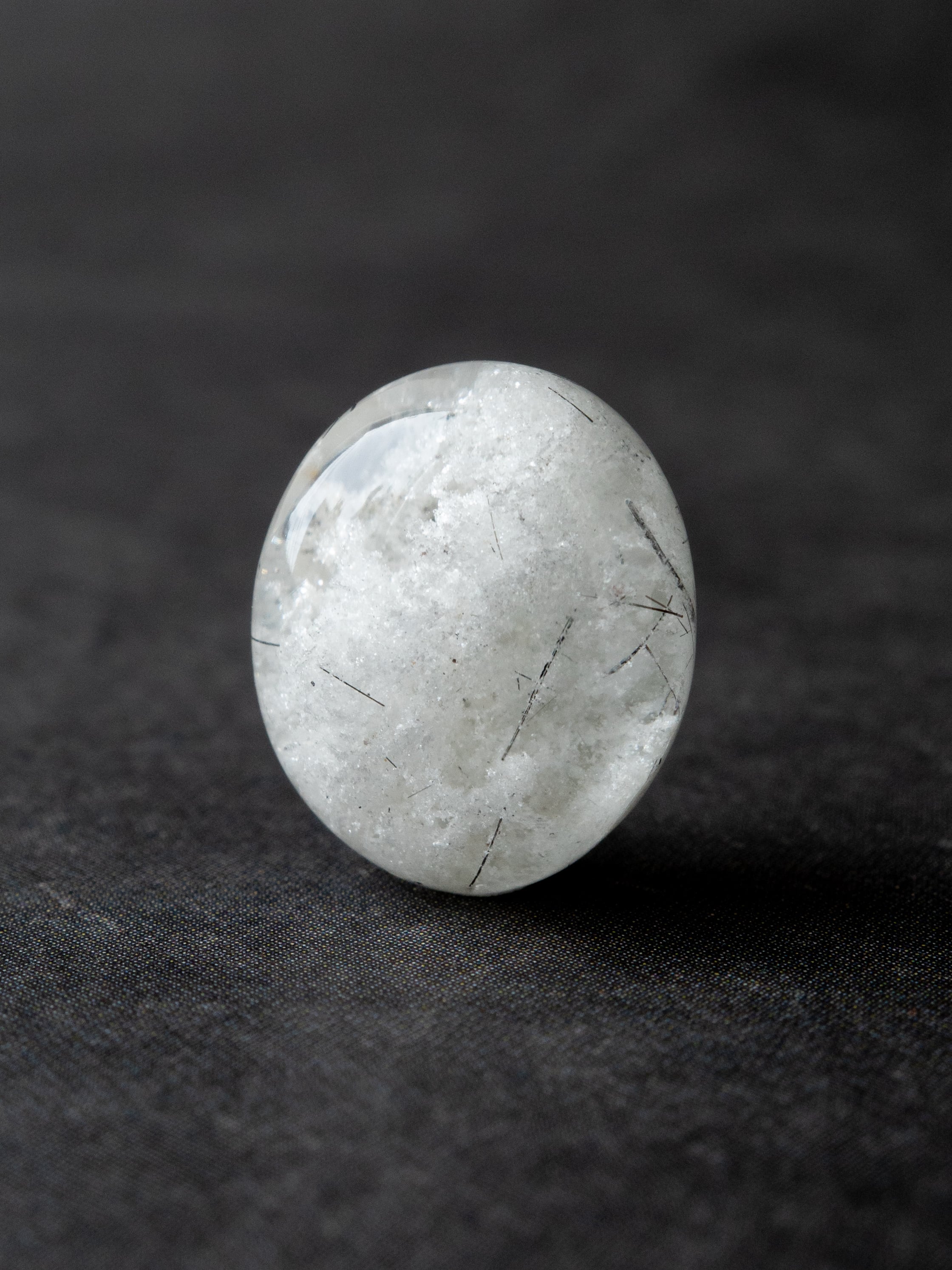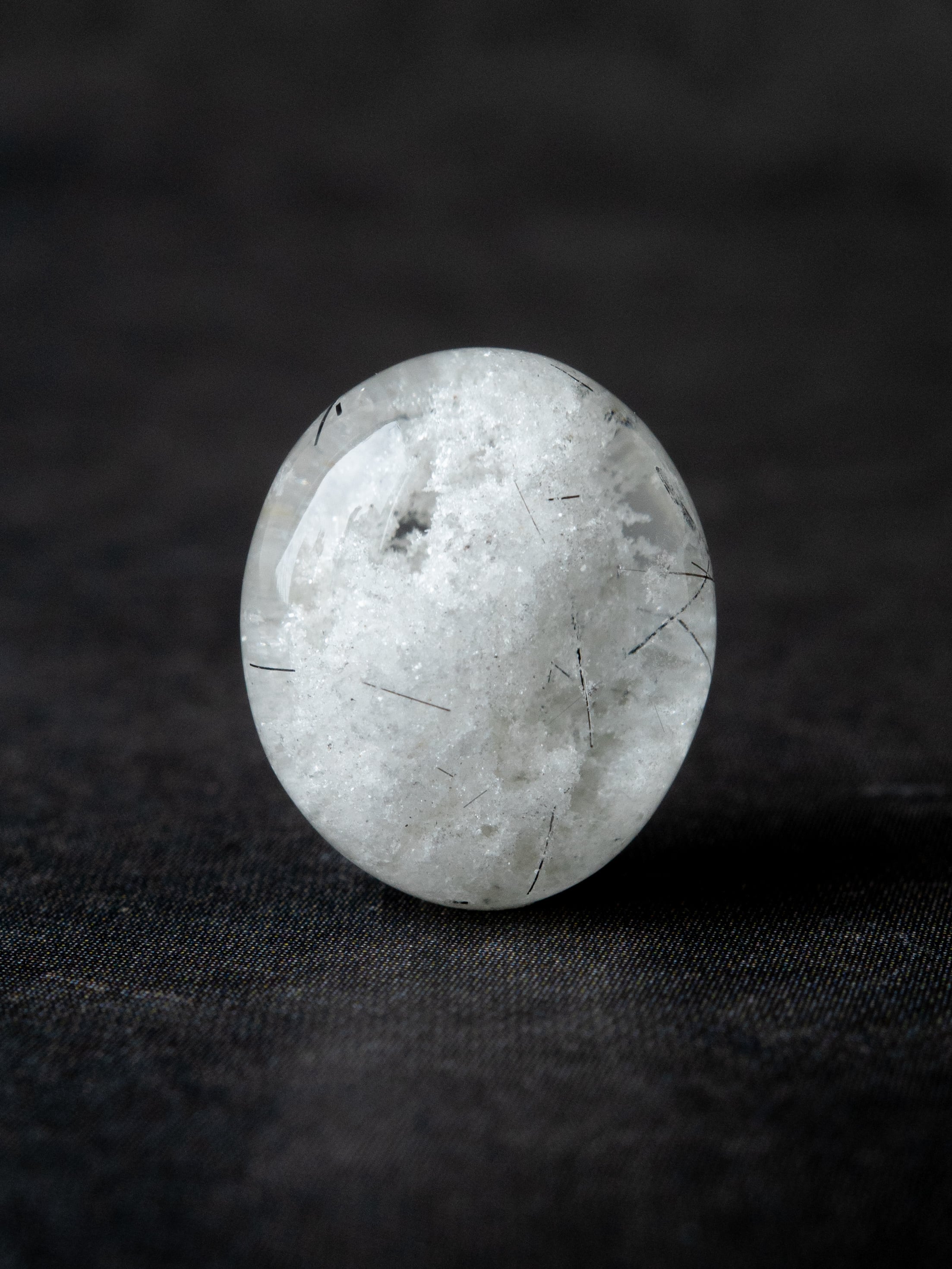 こちらはトルマリンを内包したタイプ。ブラックアンドホワイトのコンタラストがクールな印象のルースです。