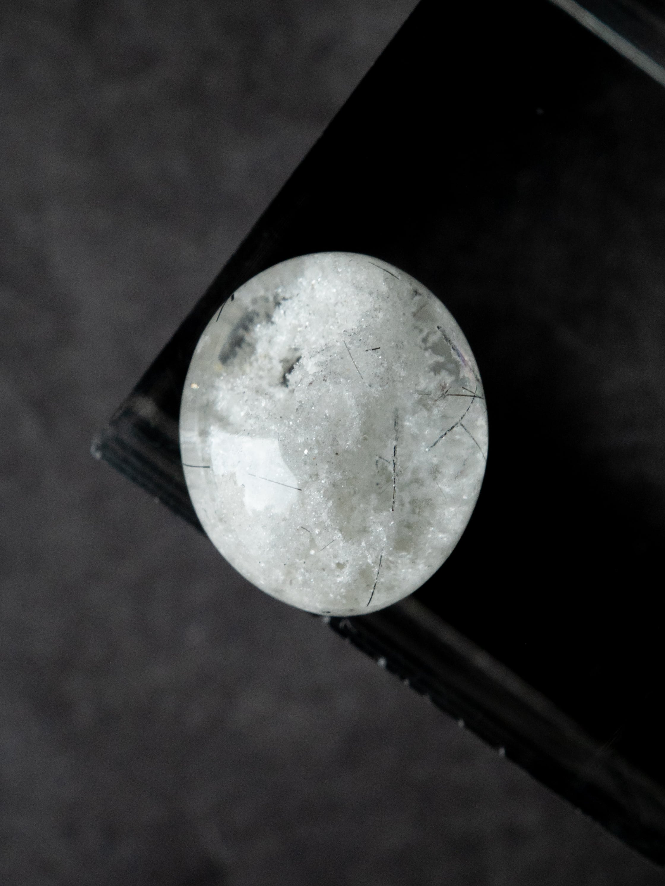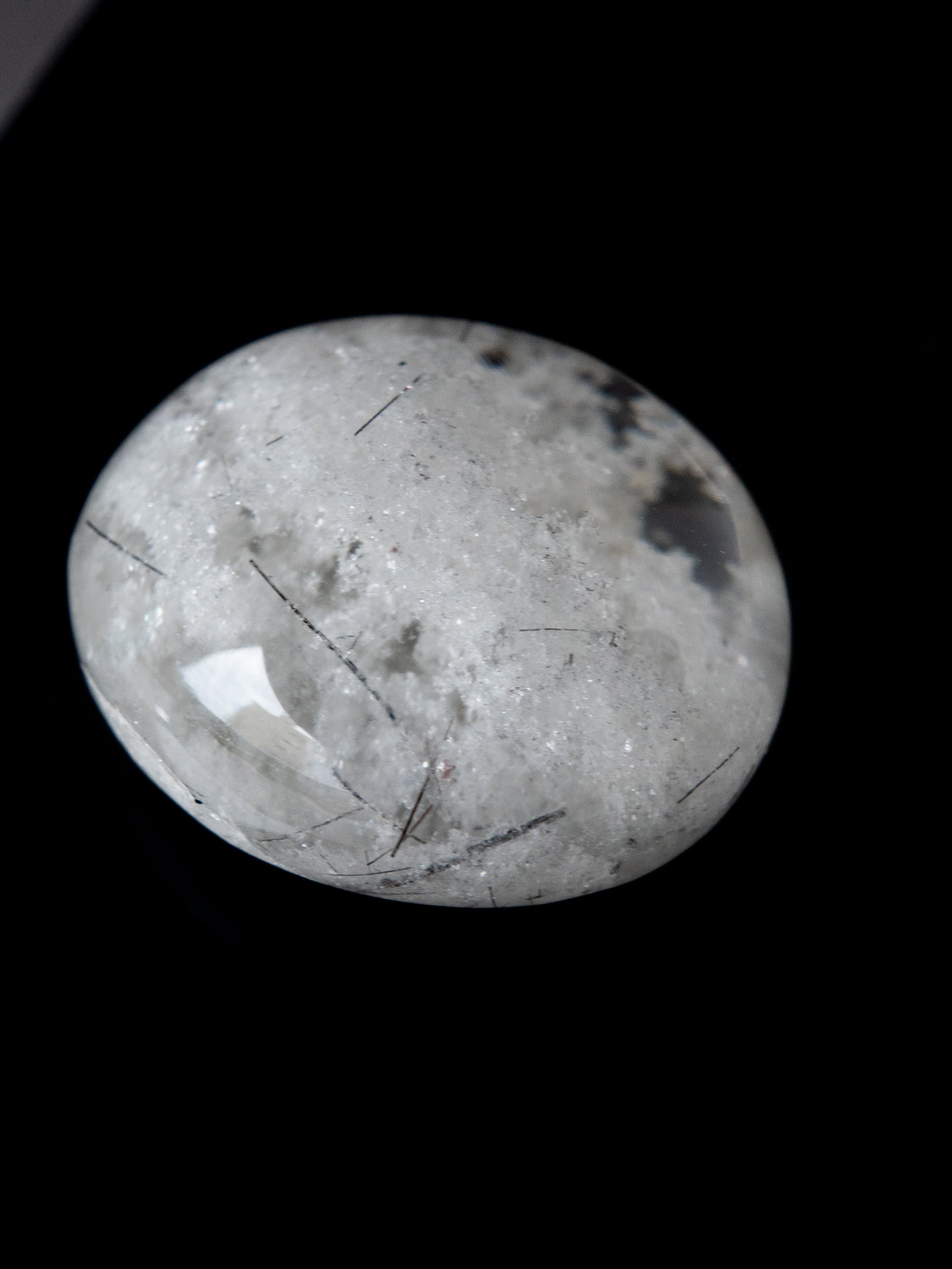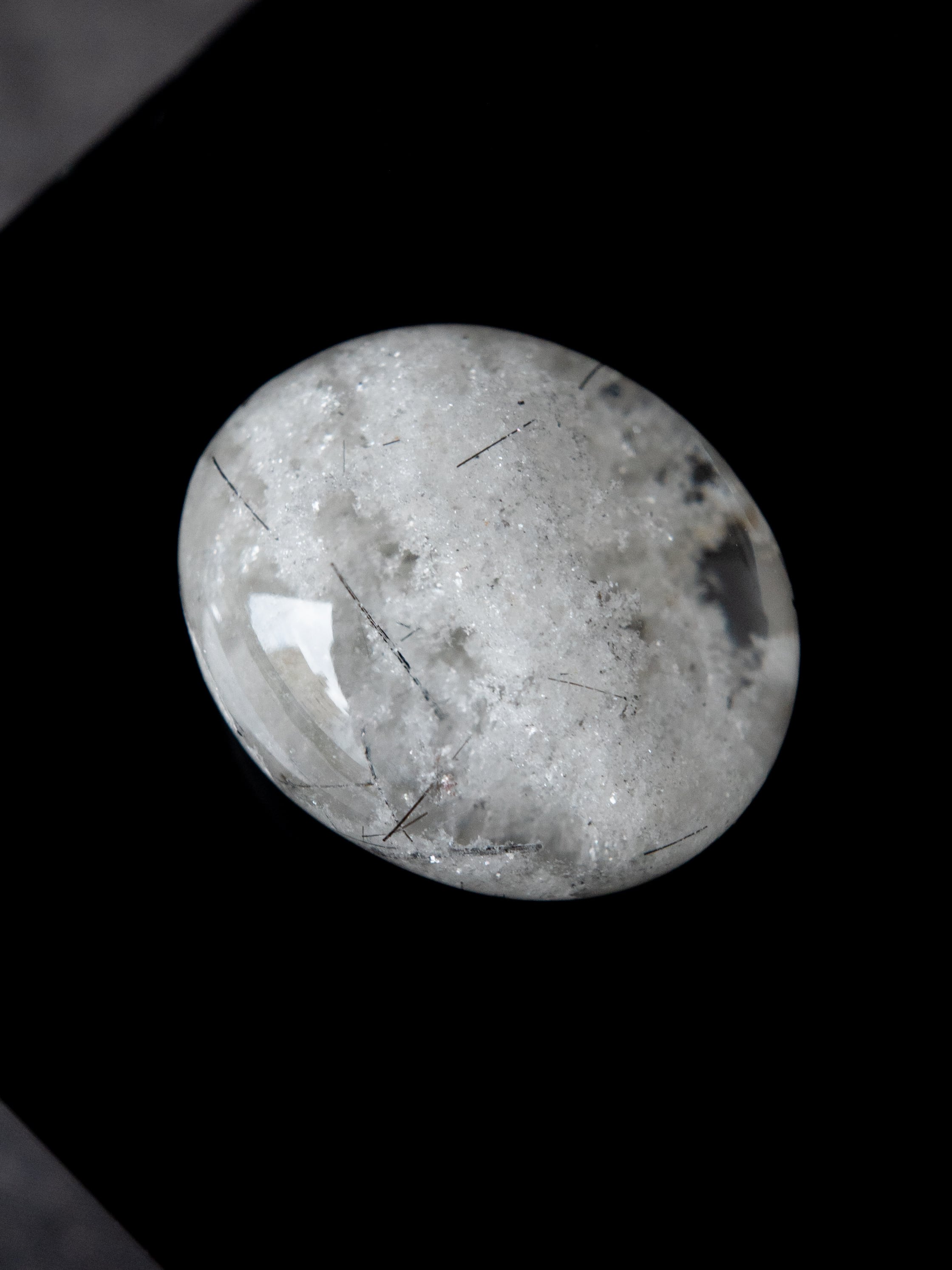 こちらはトルマリンを内包したタイプ。ブラックアンドホワイトのコンタラストがクールな印象のルースです。