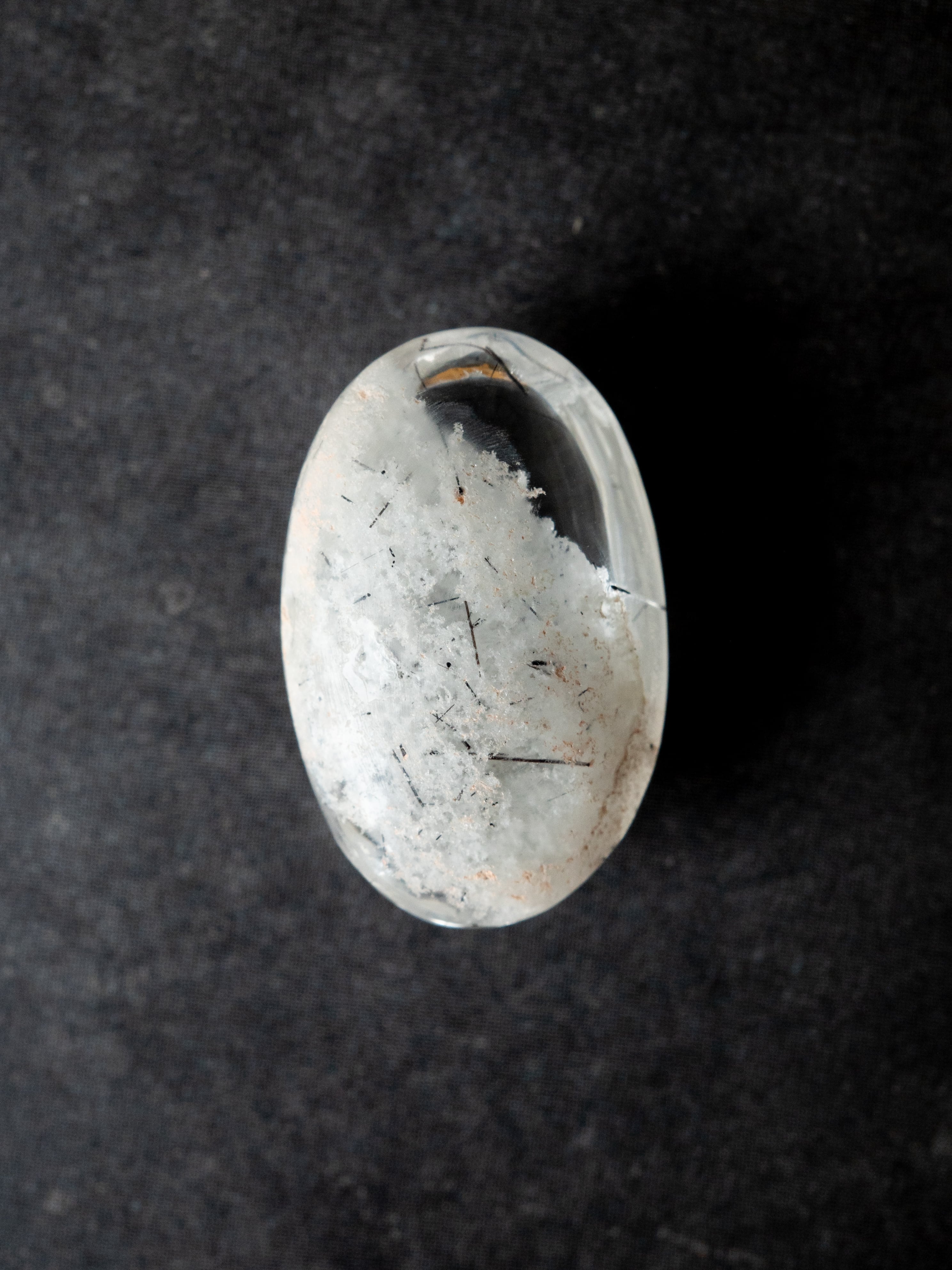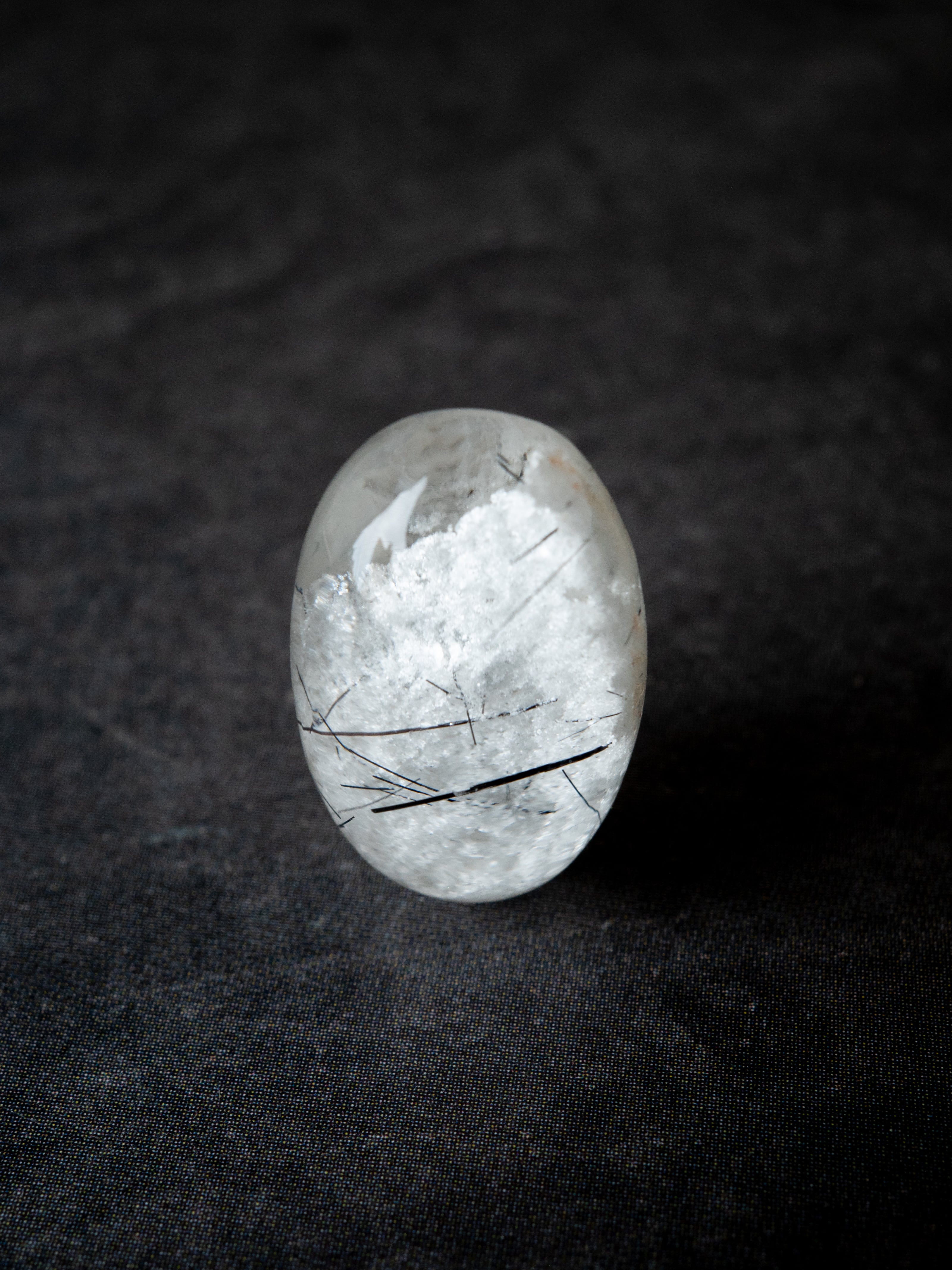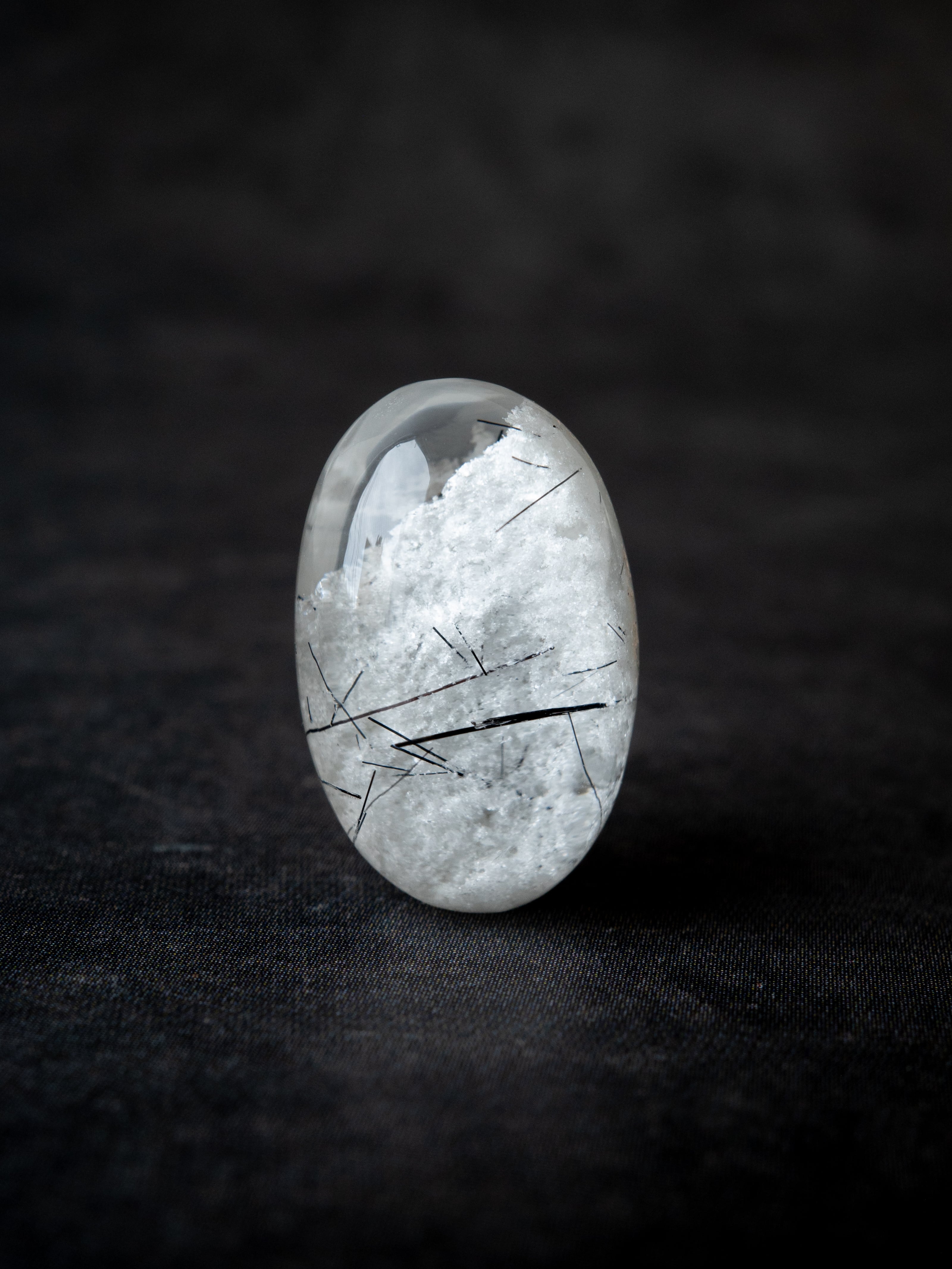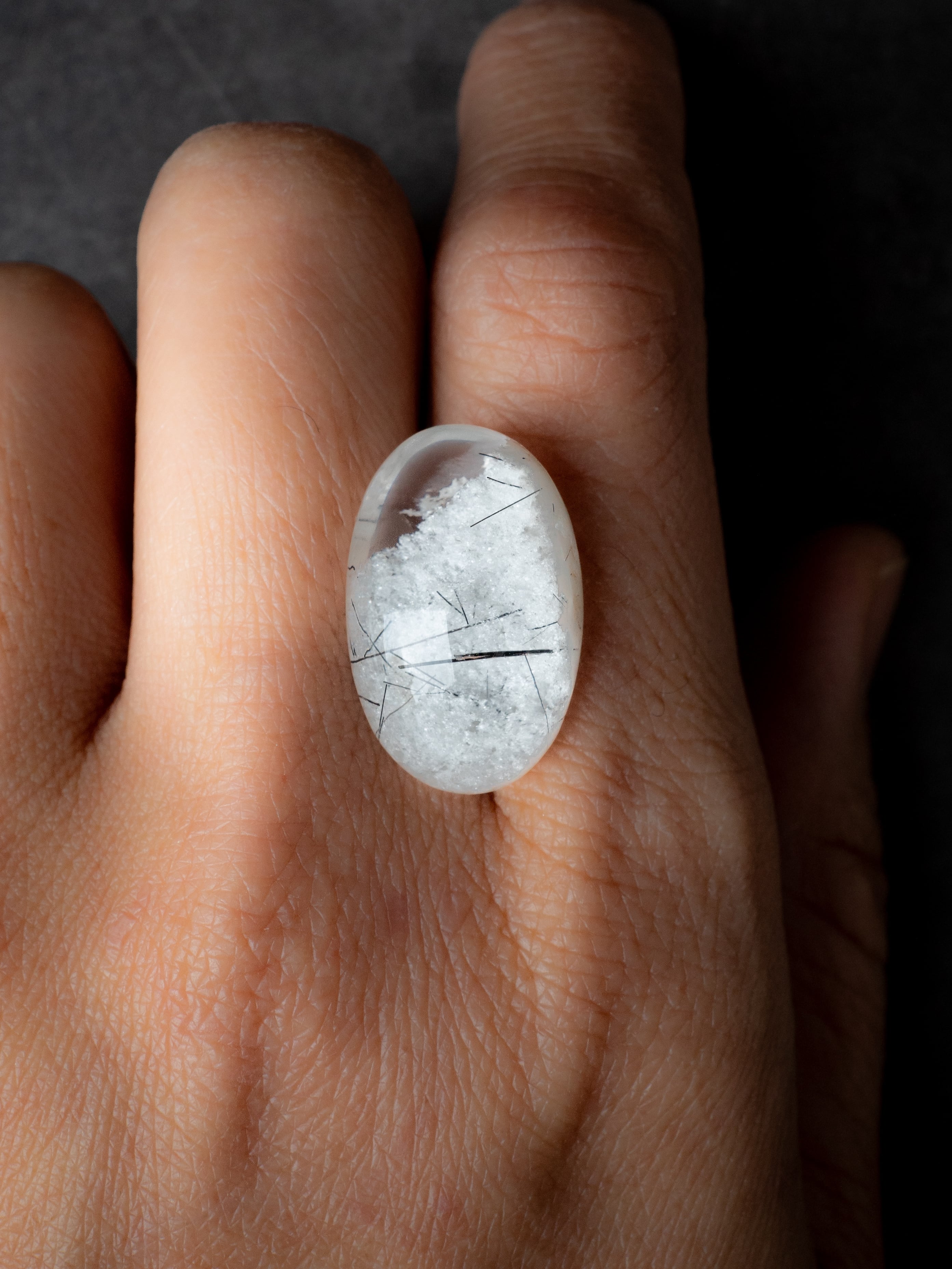 こちらはトルマリンを内包したタイプ。ブラックアンドホワイトのコンタラストがクールな印象のルースです。