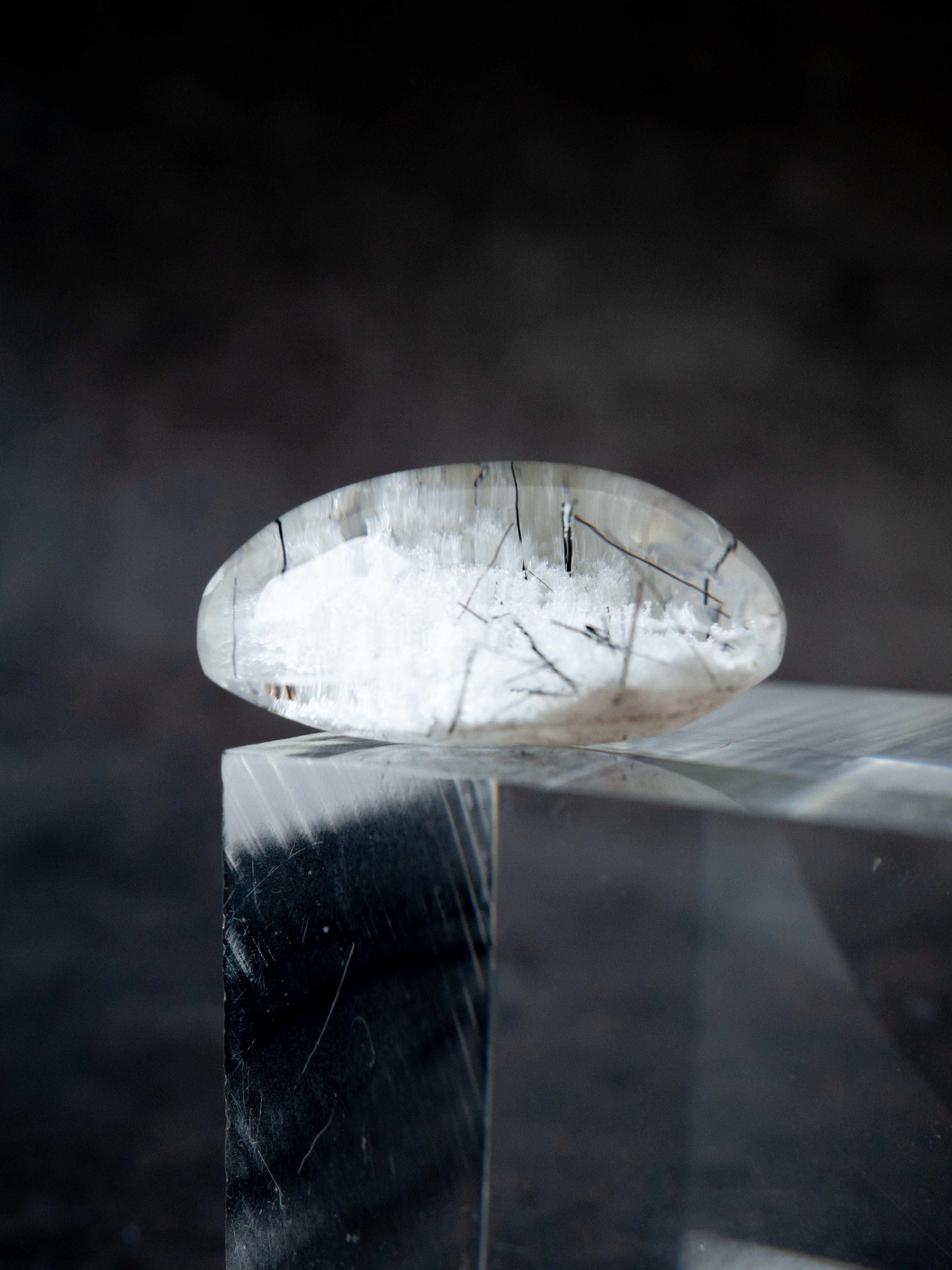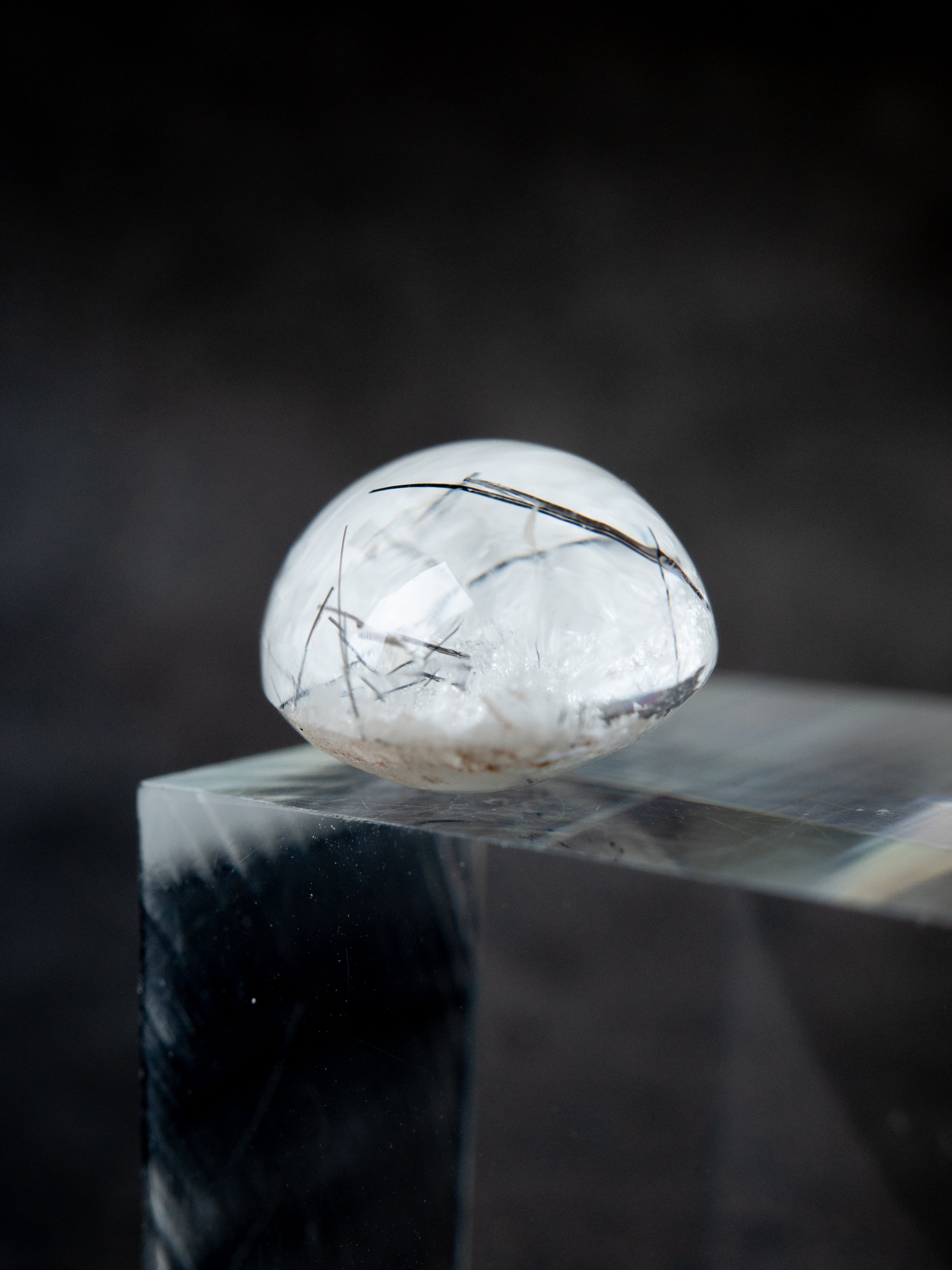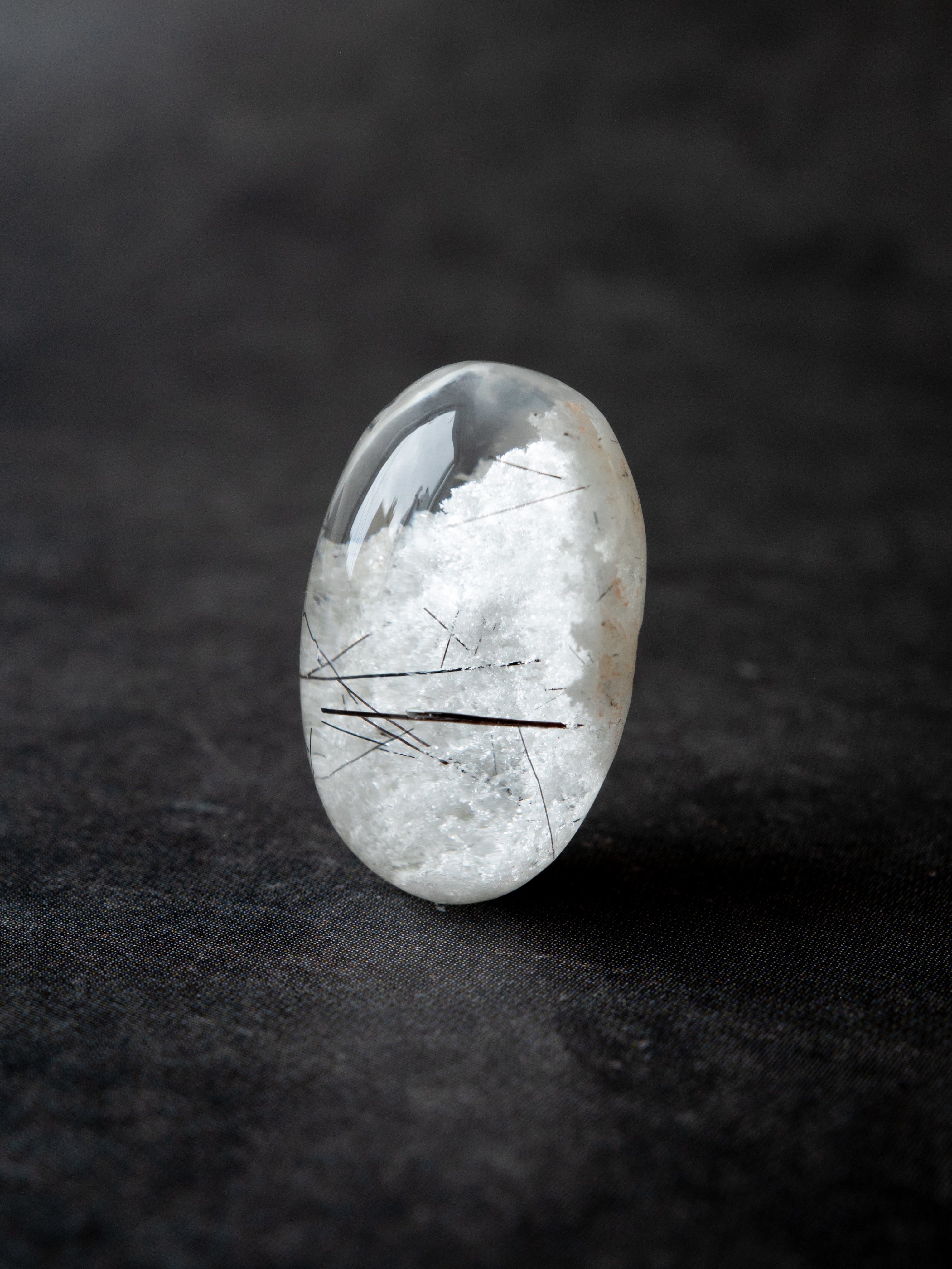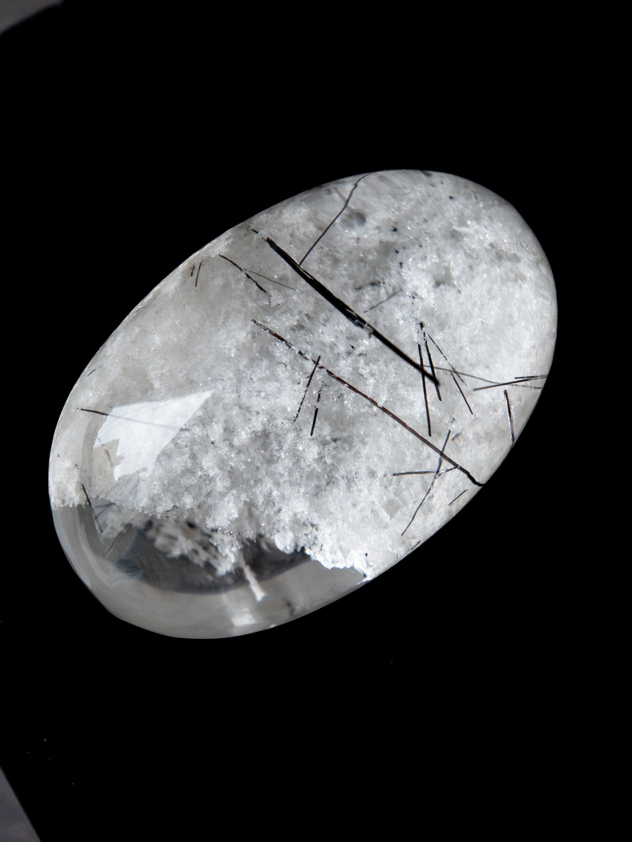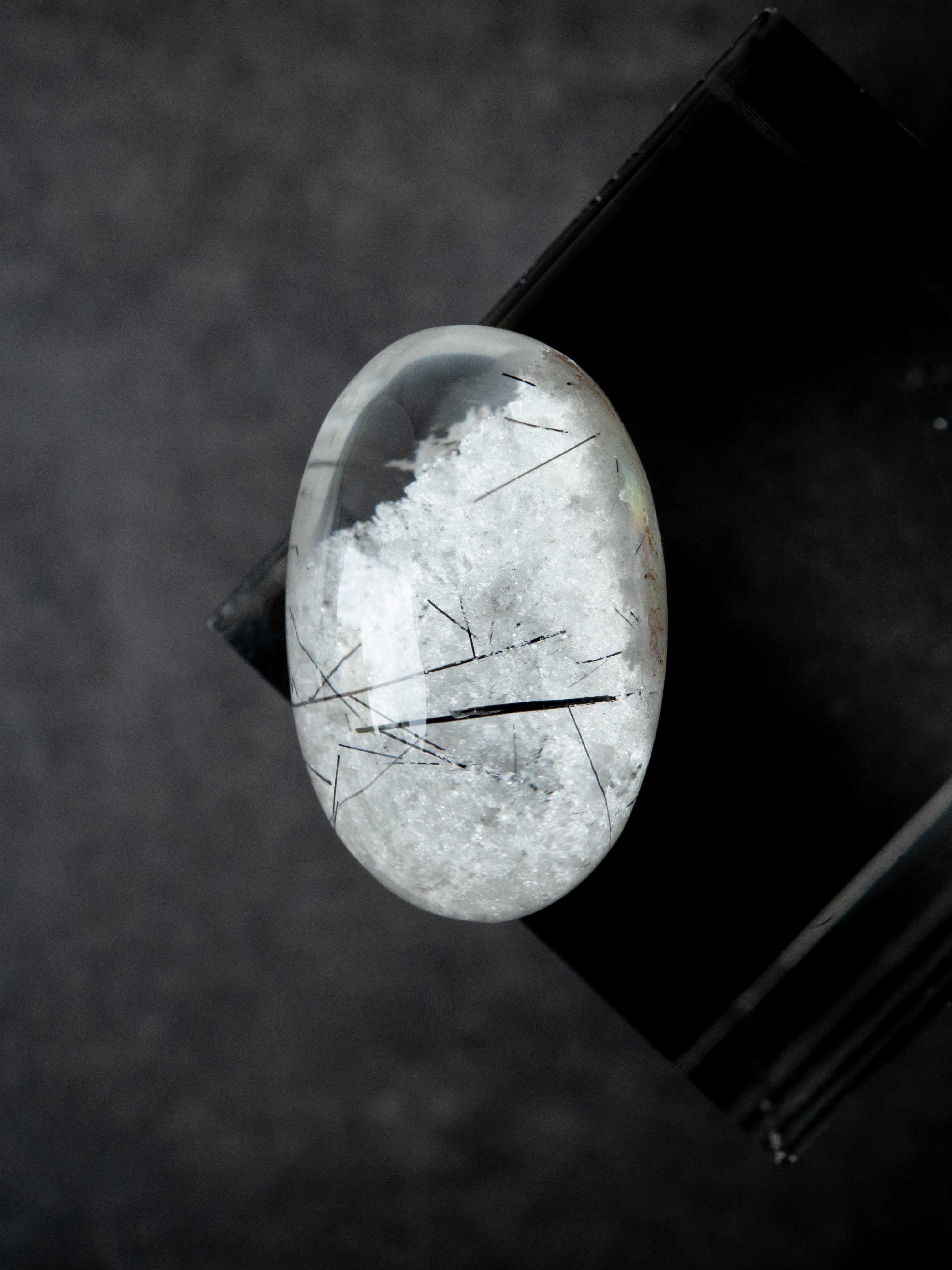 こちらはトルマリンを内包したタイプ。ブラックアンドホワイトのコンタラストがクールな印象のルースです。