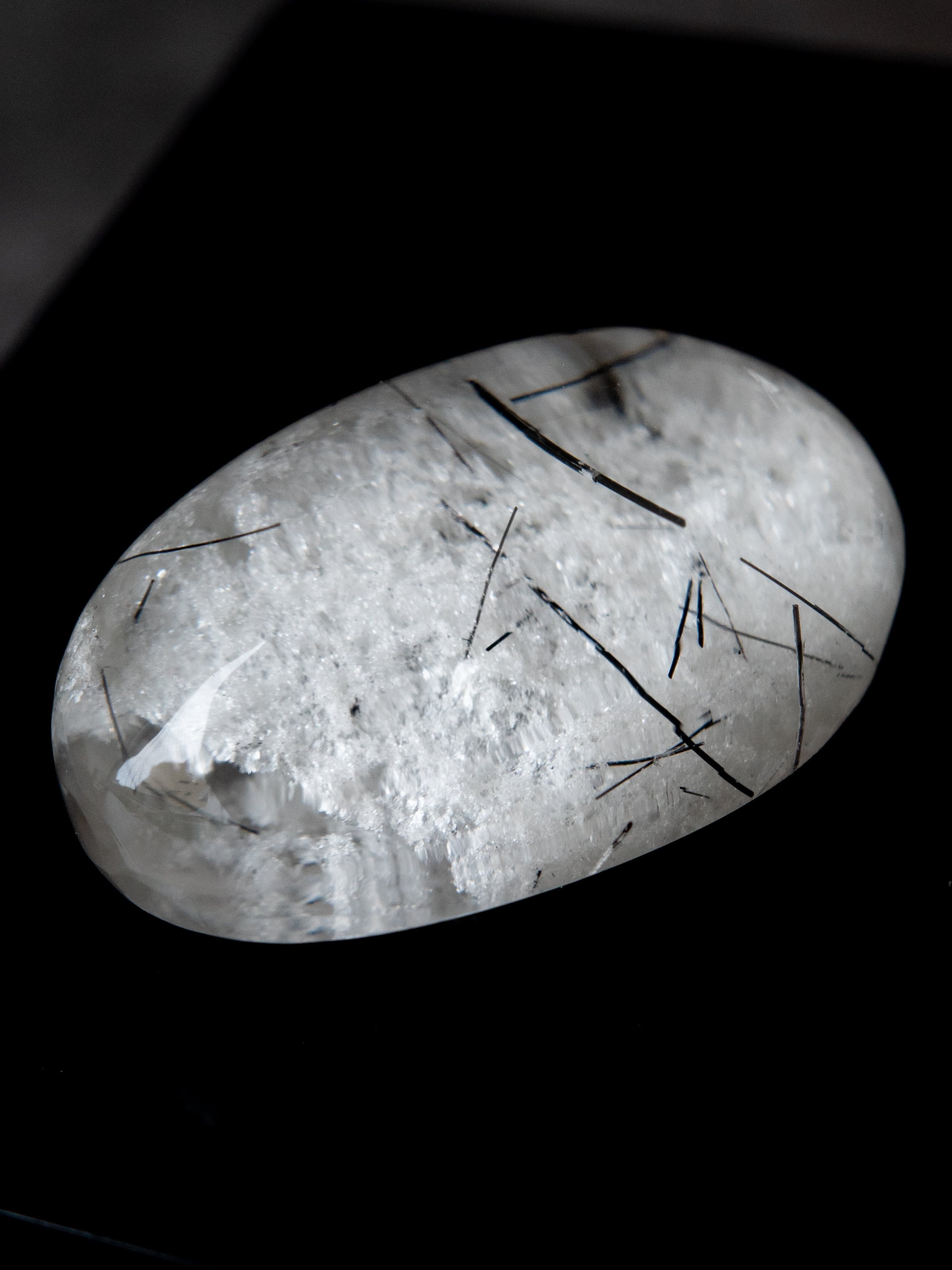 This particular piece contains tourmaline inclusions. The striking black-and-white contrast gives the stone a cool and sophisticated impression.