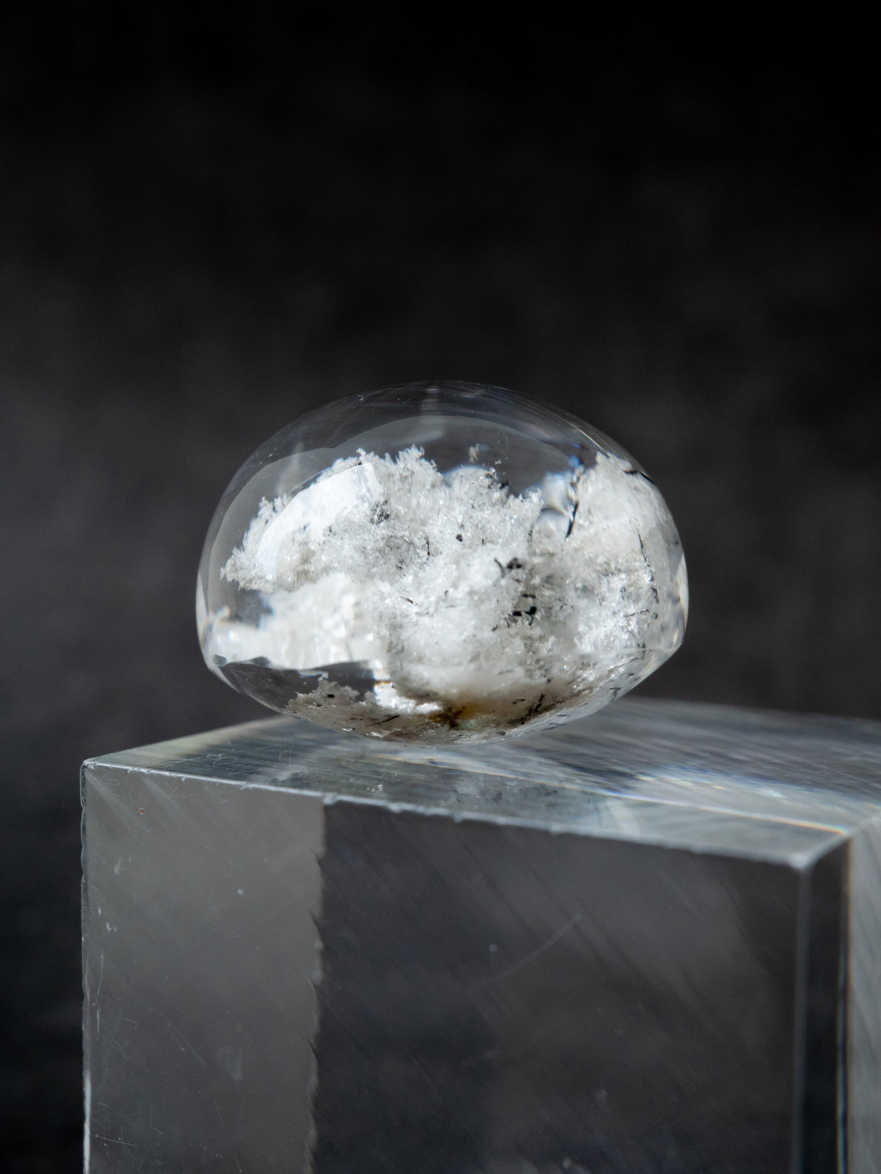 “White Garden Quartz” is a natural gemstone admired for its soft, dreamlike scenery—resembling snow or clouds floating in the sky. Its pure white inclusions are formed by minerals such as muscovite and kaolinite within the quartz, creating these beautiful internal landscapes.