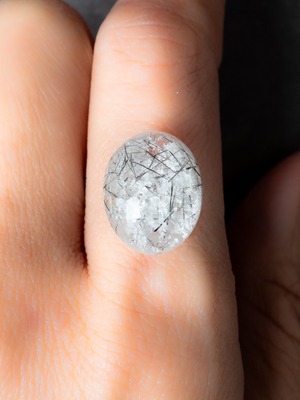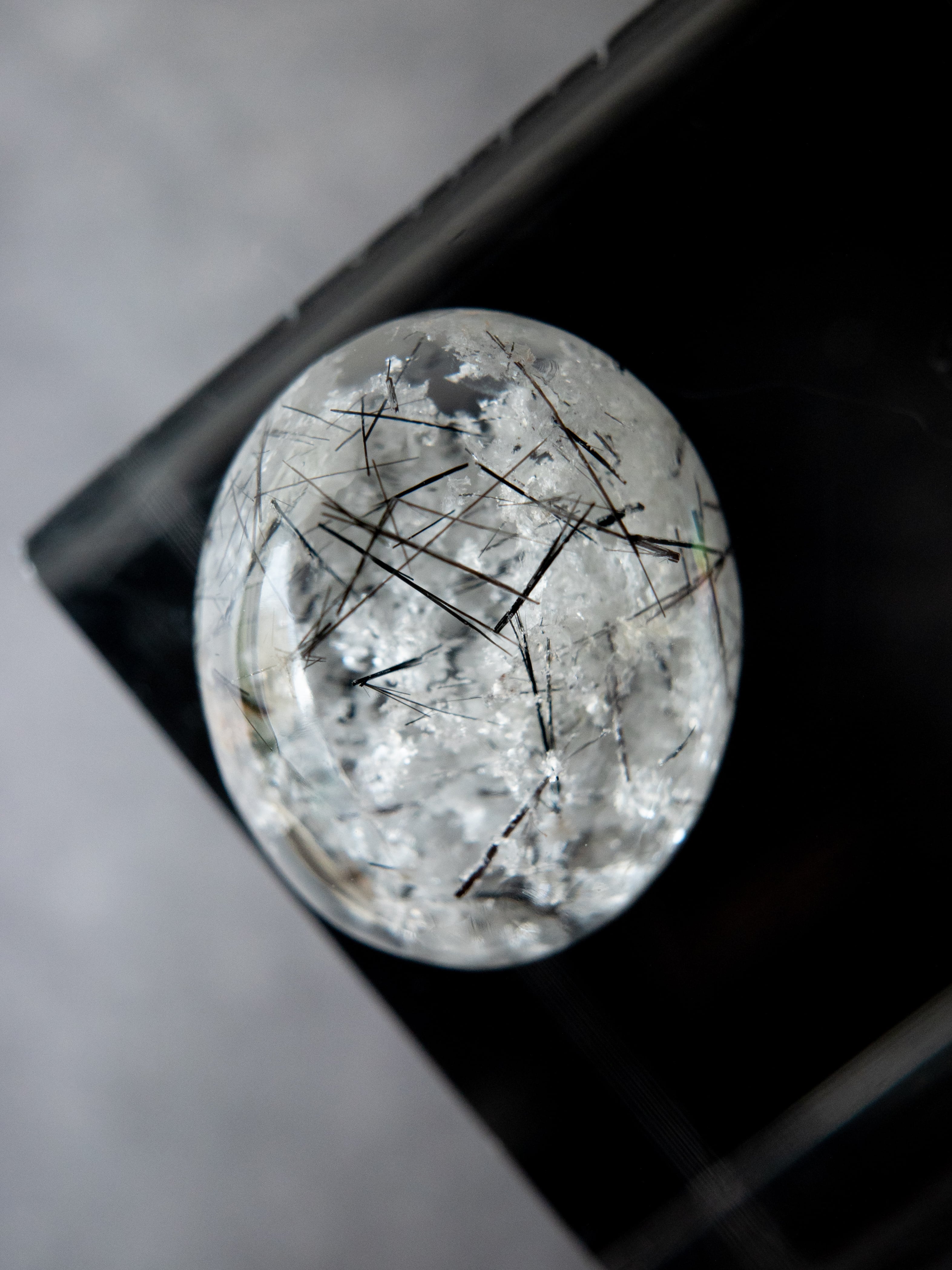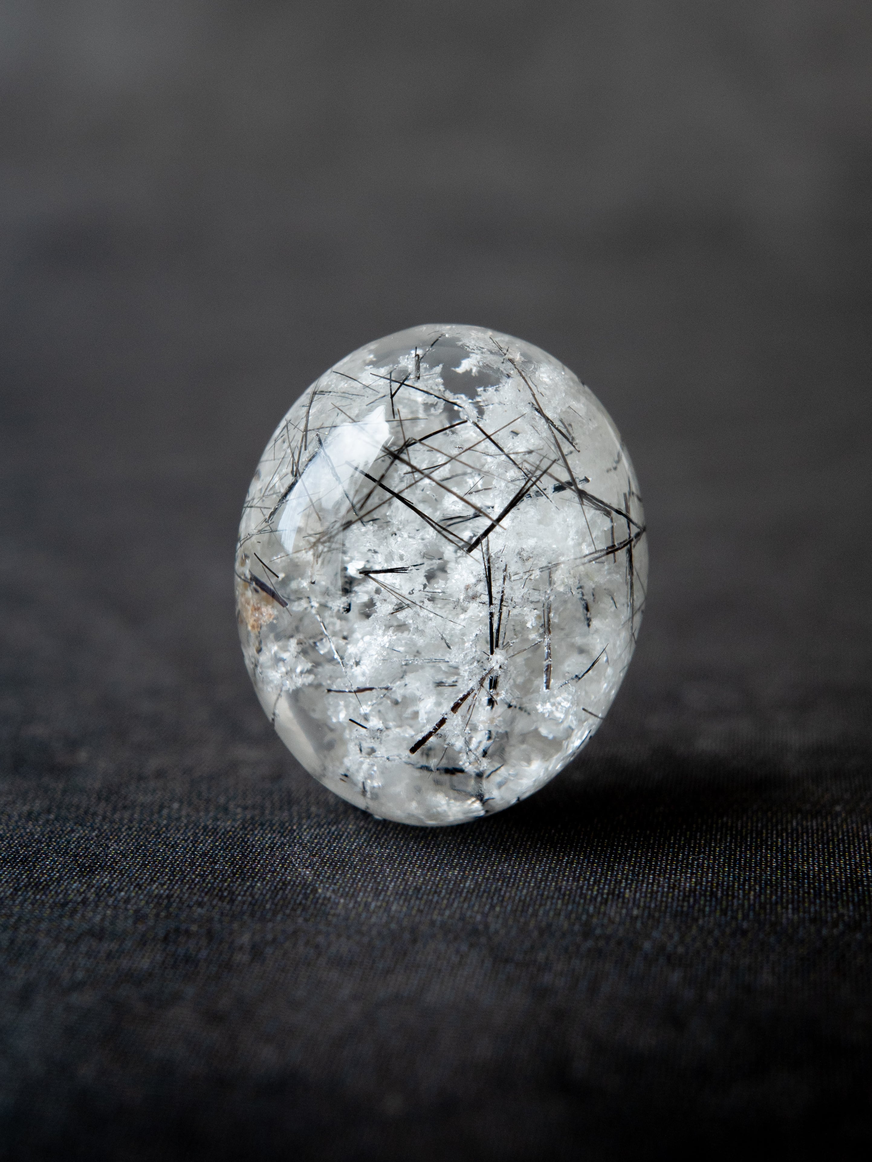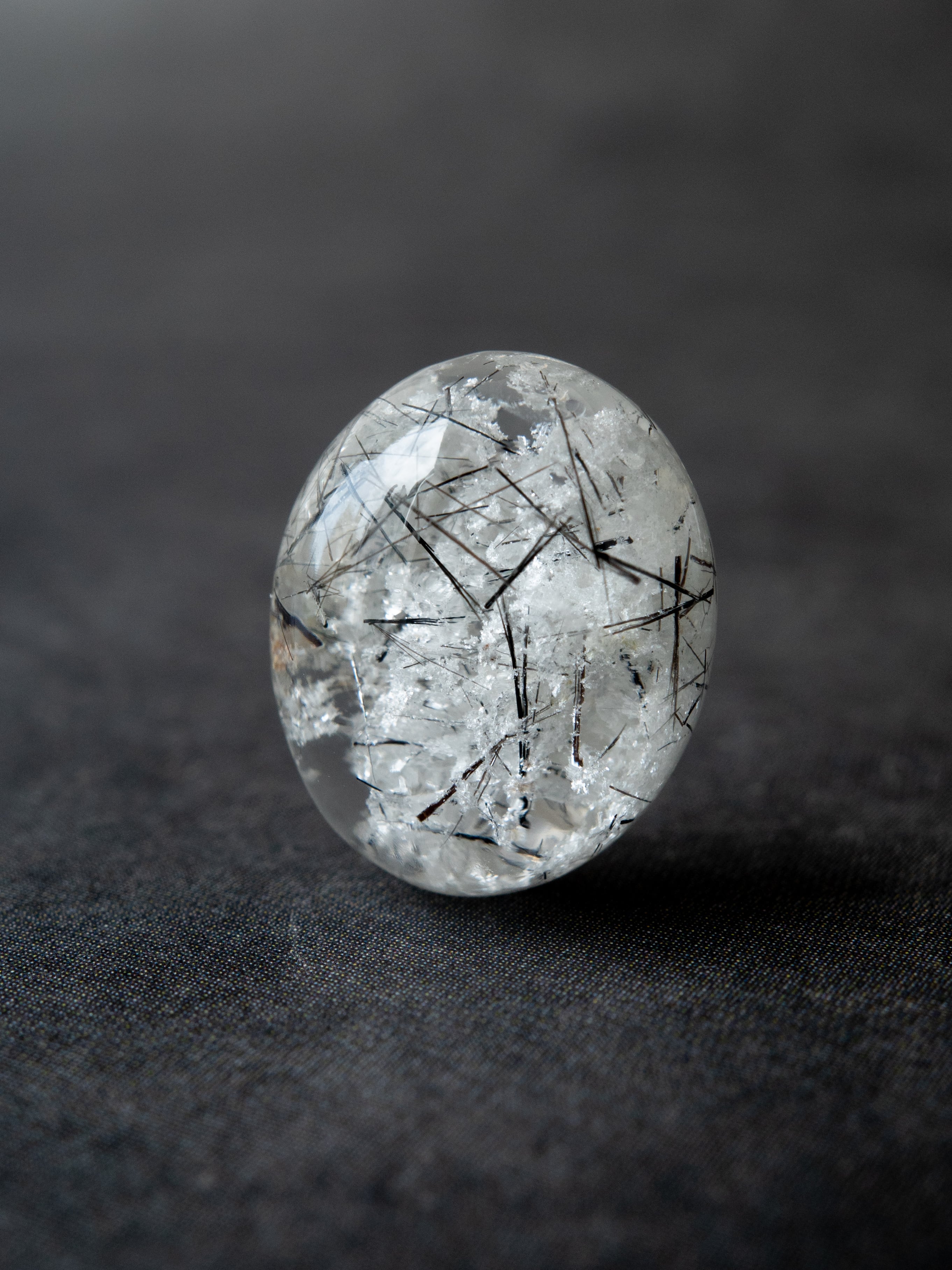 こちらはトルマリンを内包したタイプ。ブラックアンドホワイトのコンタラストがクールな印象のルースです。