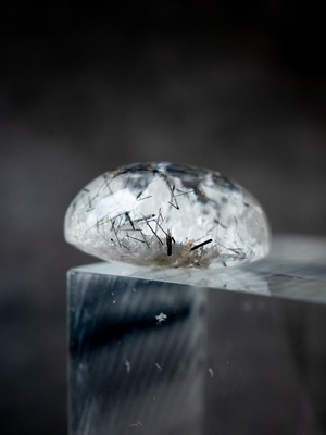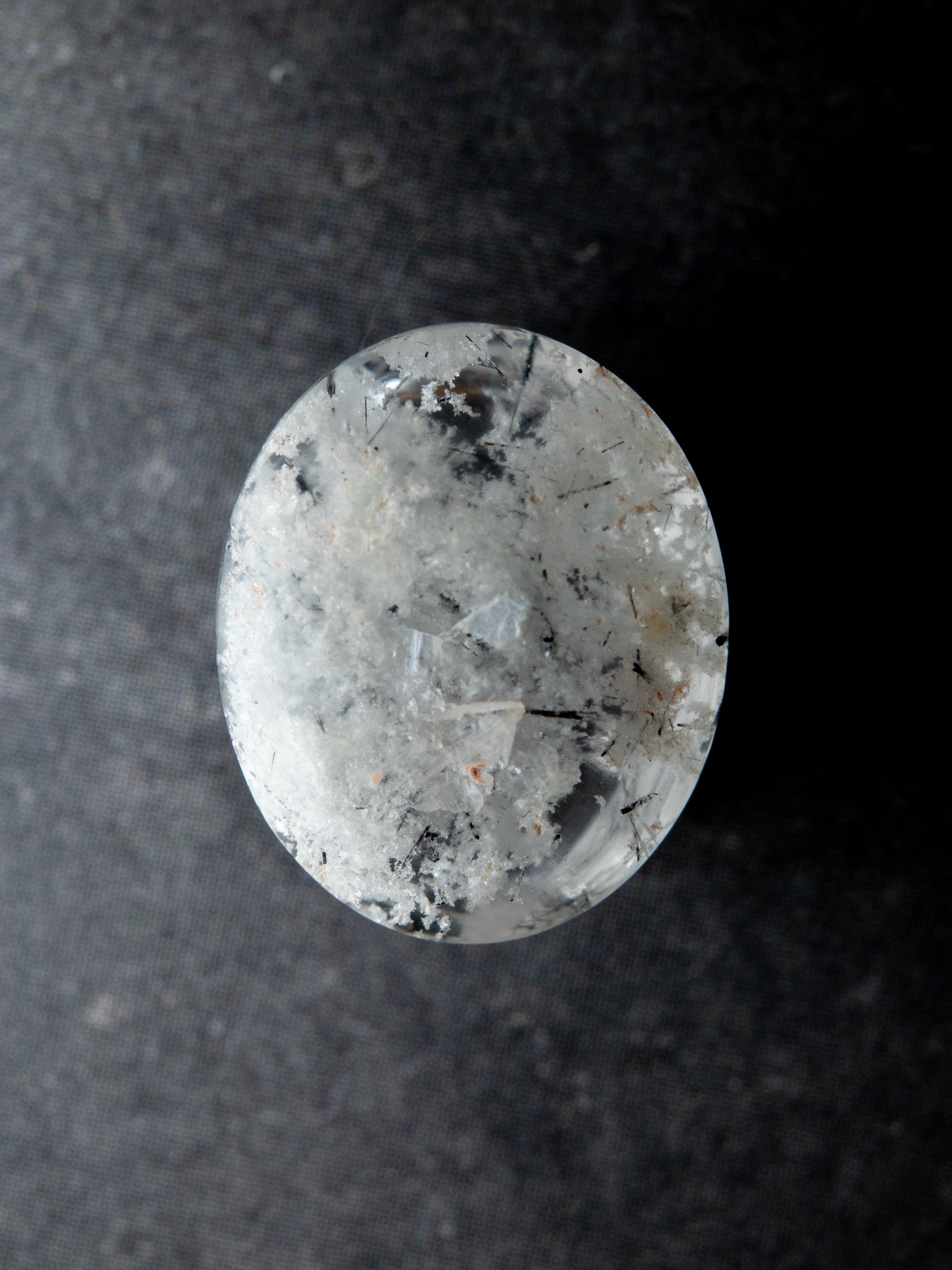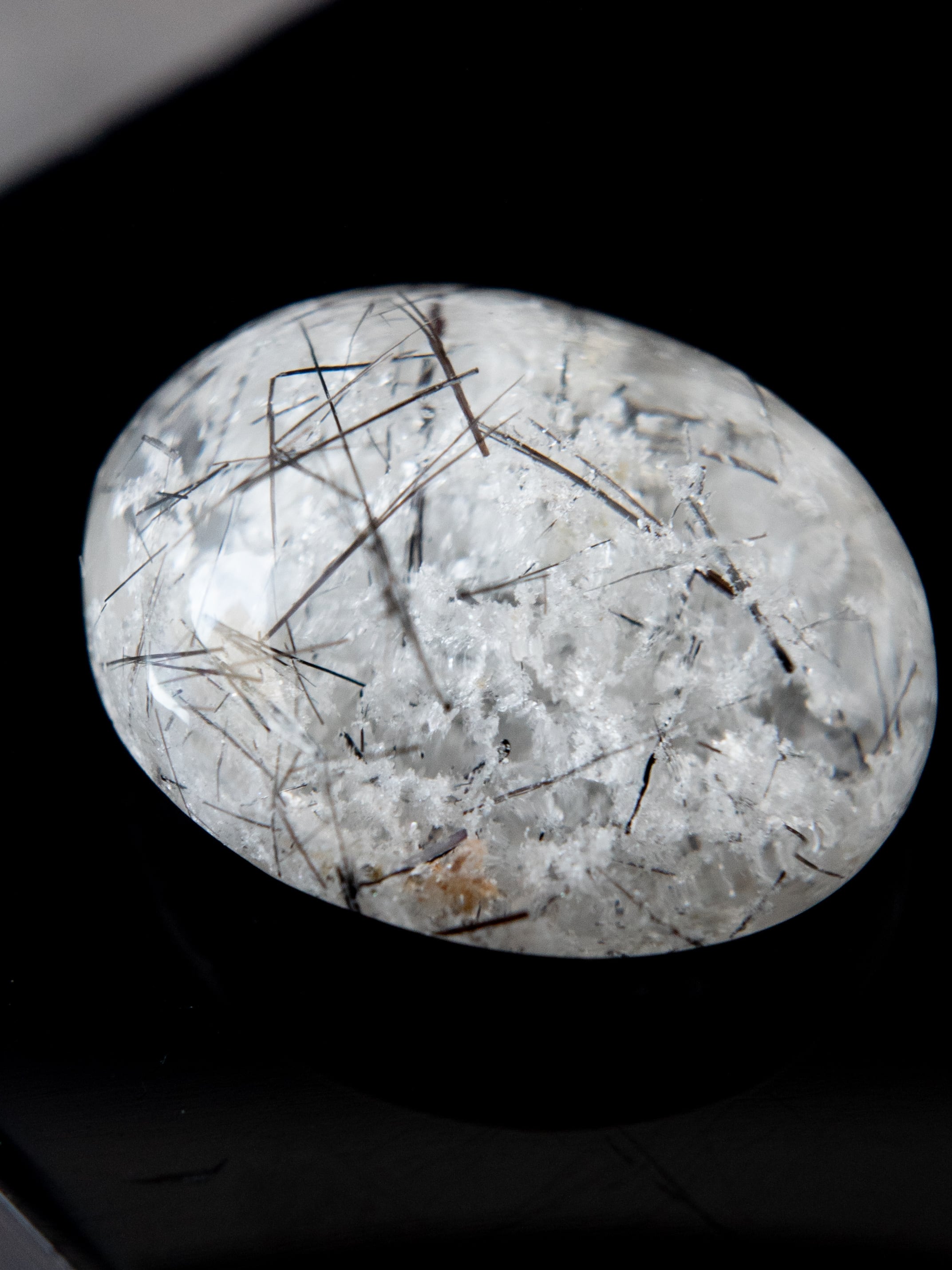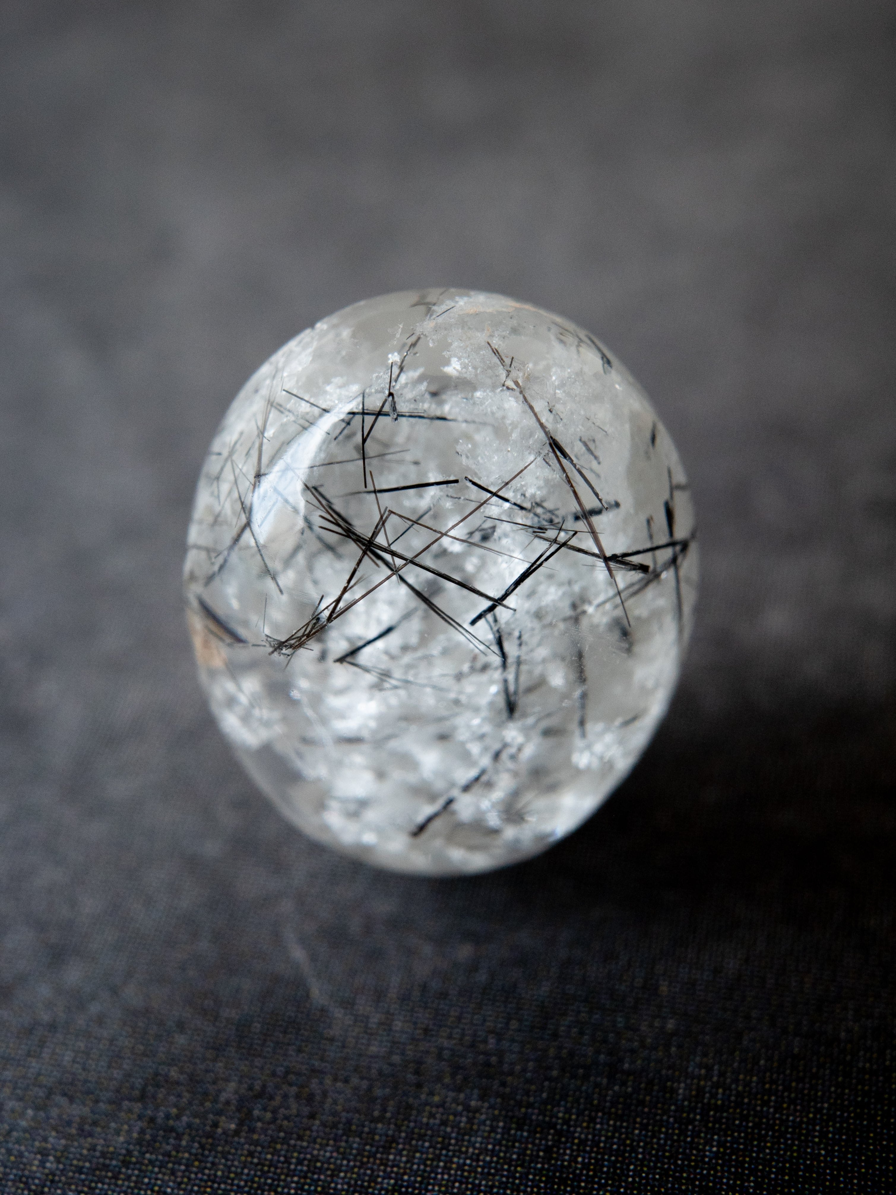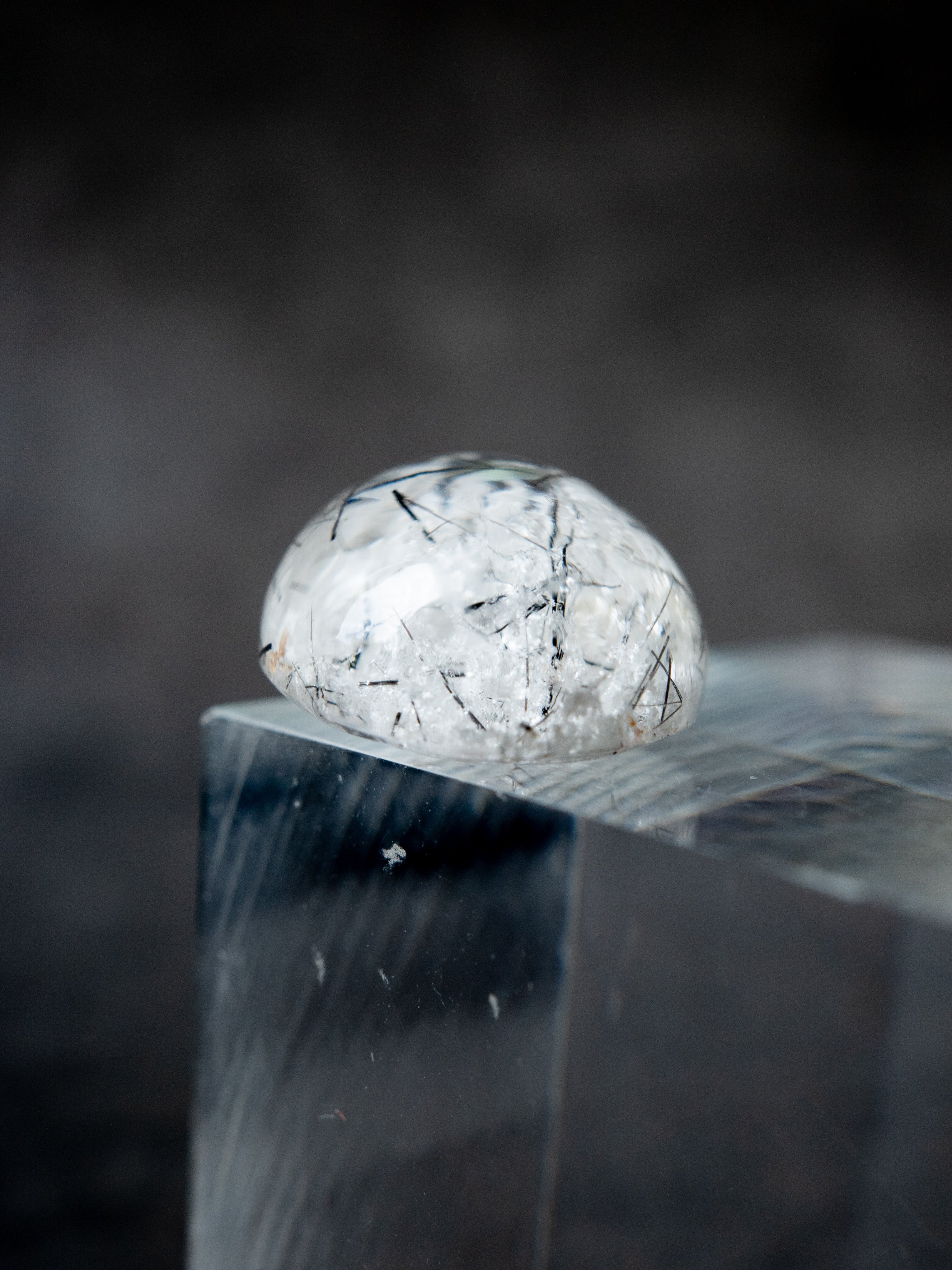こちらはトルマリンを内包したタイプ。ブラックアンドホワイトのコンタラストがクールな印象のルースです。