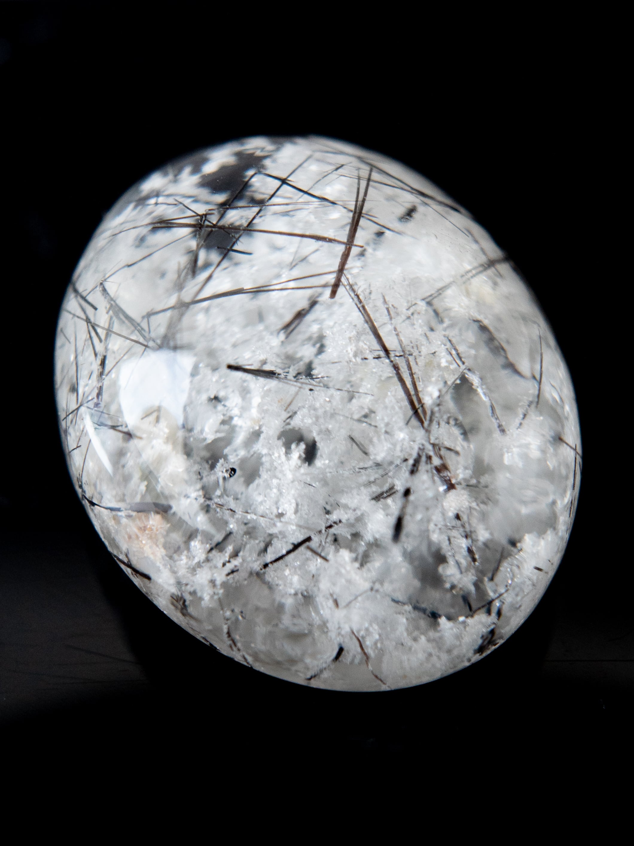 This particular piece contains tourmaline inclusions. The striking black-and-white contrast gives the stone a cool and sophisticated impression.
