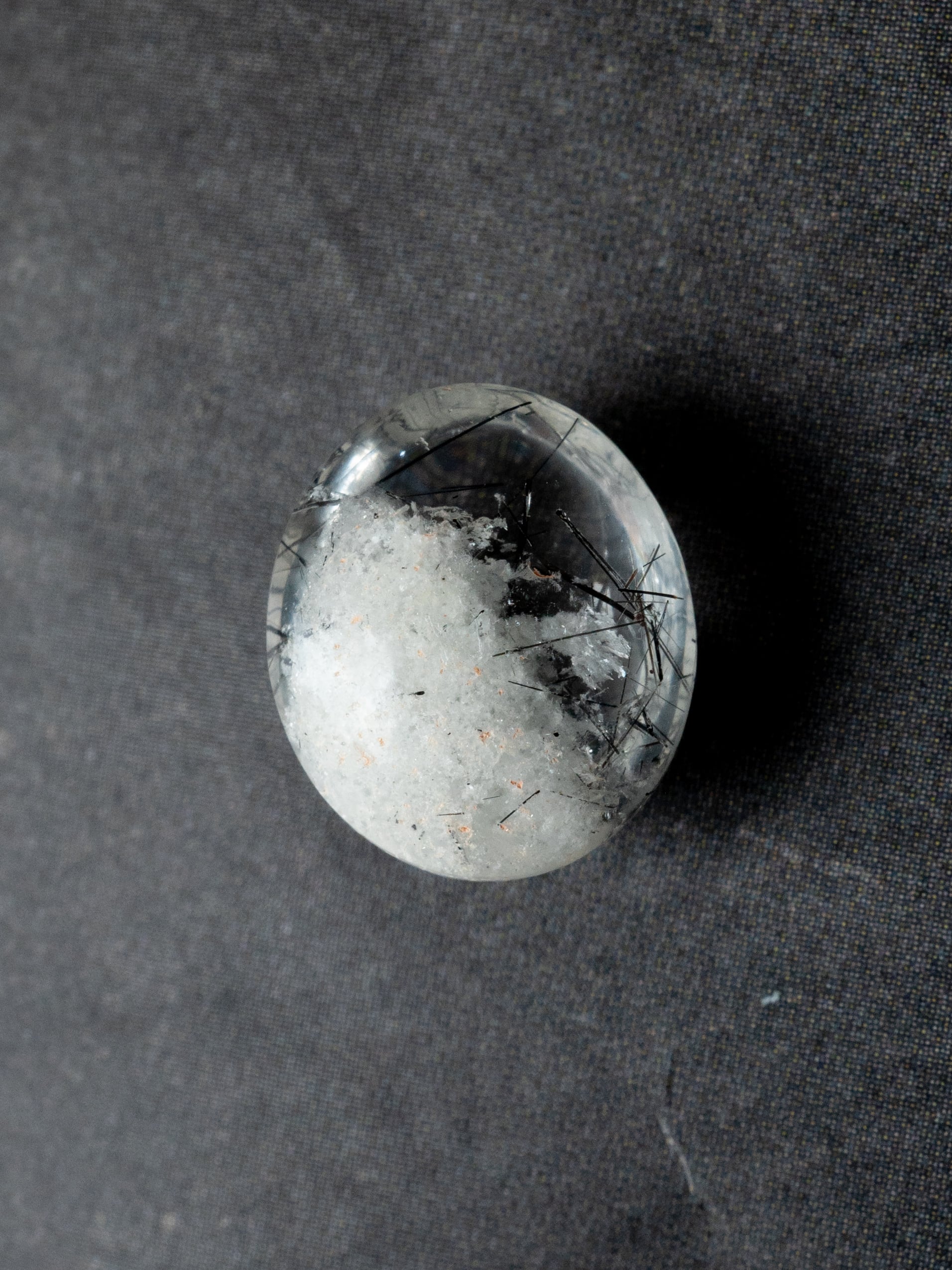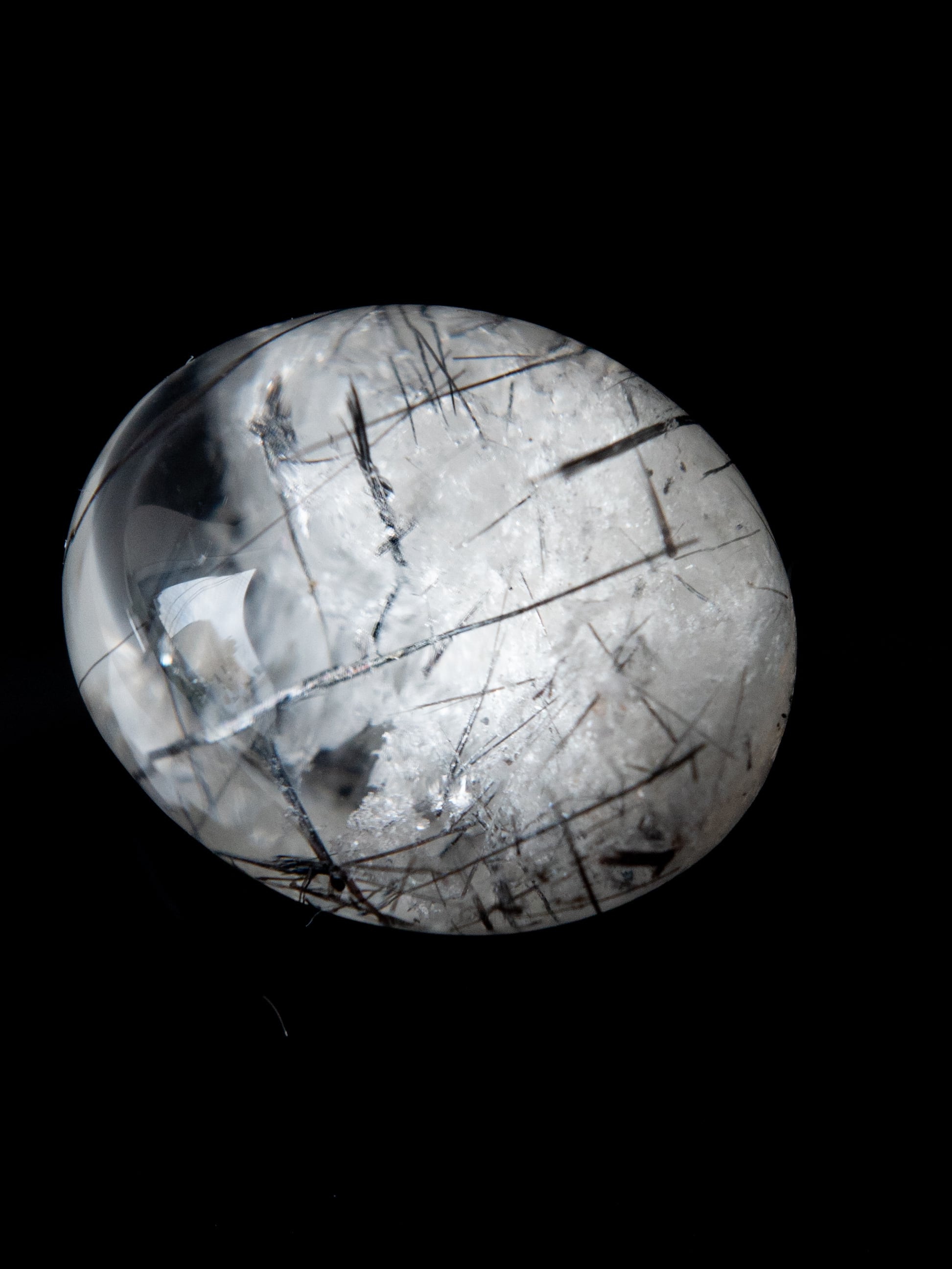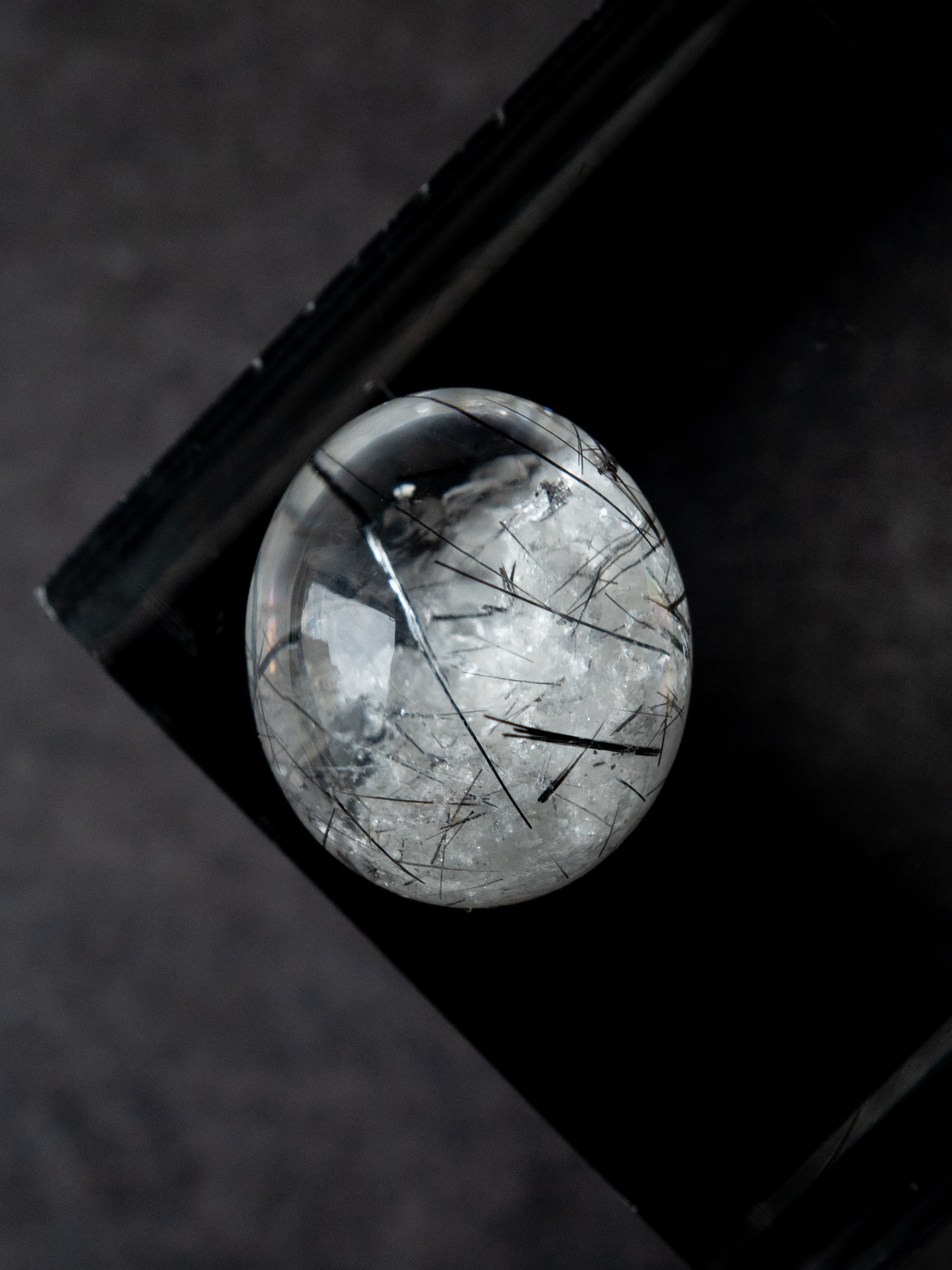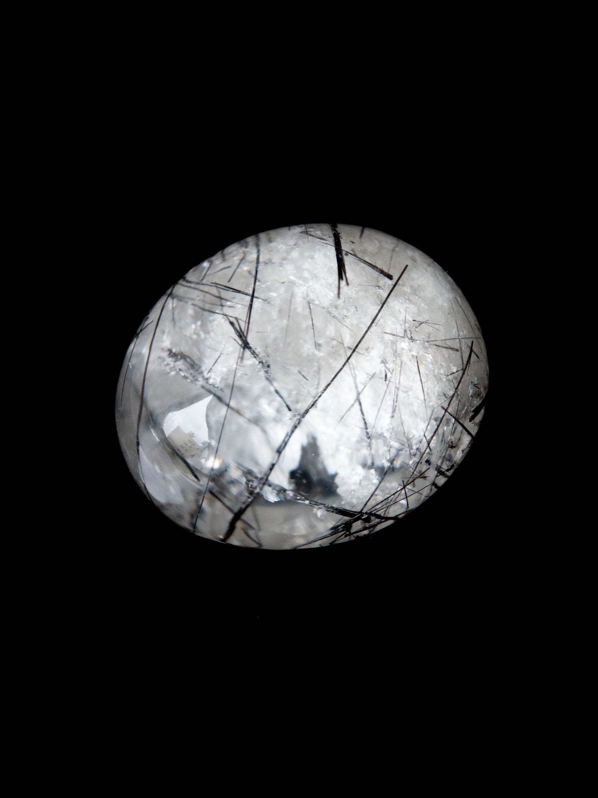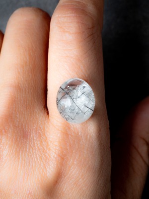 こちらはトルマリンを内包したタイプ。ブラックアンドホワイトのコンタラストがクールな印象のルースです。