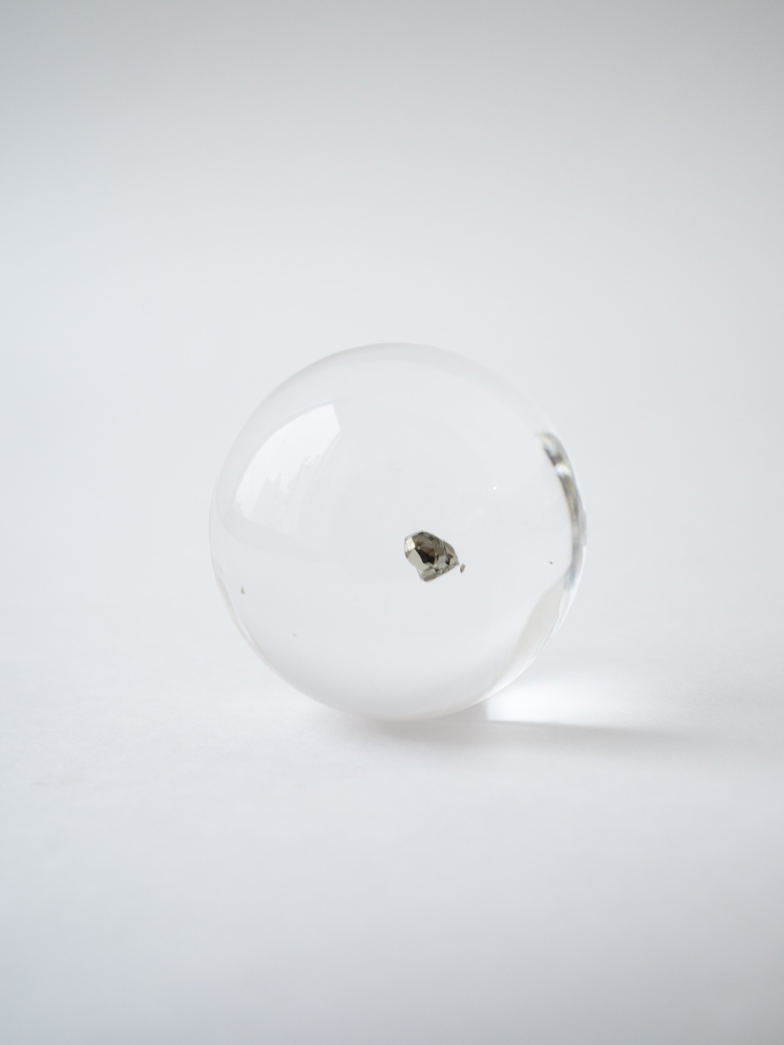 ギリシャ語で「パイ」は、「火」を意味し、昔は火打ち石として使用されていた歴史があります。パイライトは硫化鉱物のため、原石の状態で保存するとサビやすいのですが、水晶の中に閉じ込められているのでずっと綺麗な結晶を楽しめることができます。