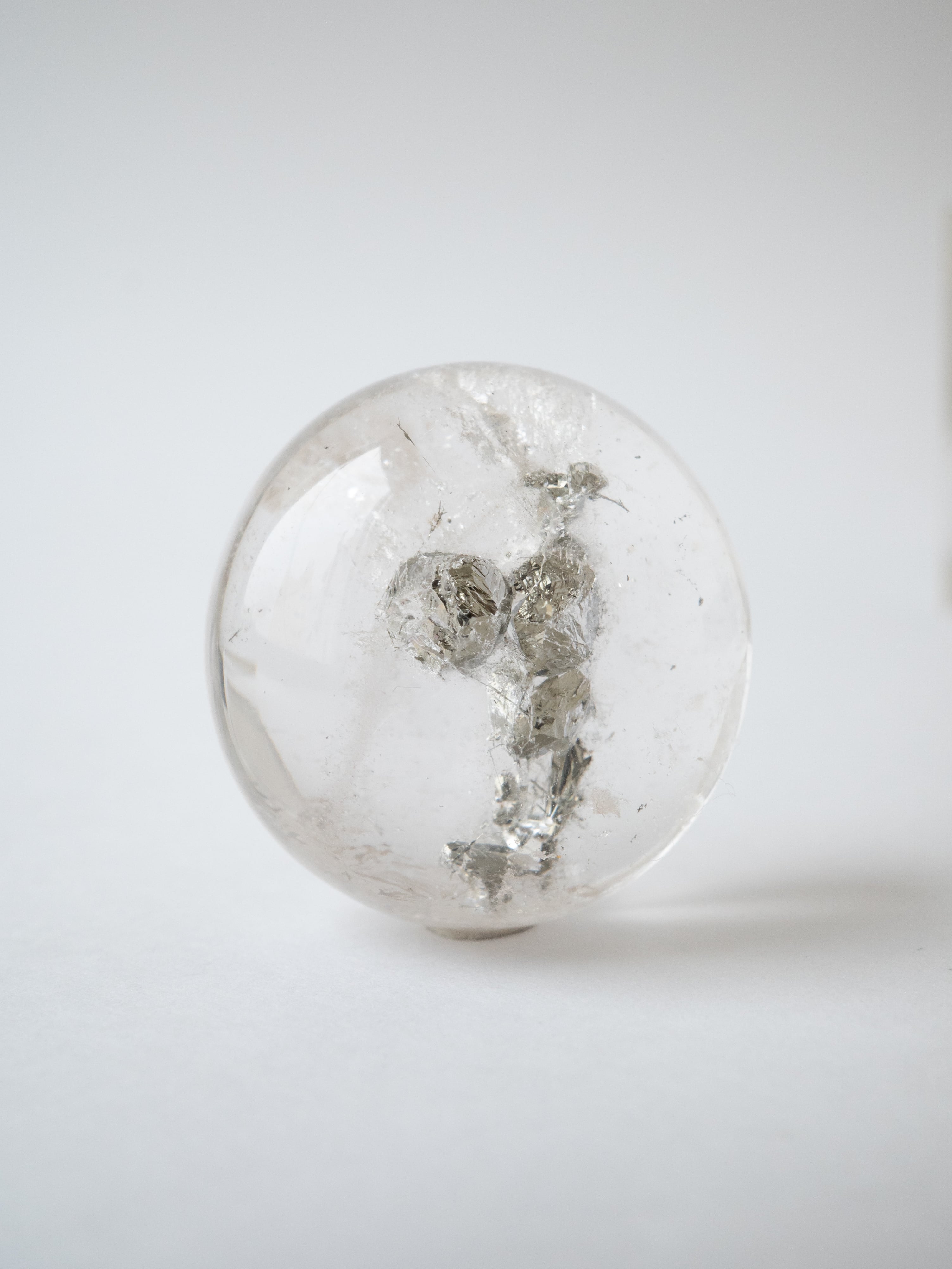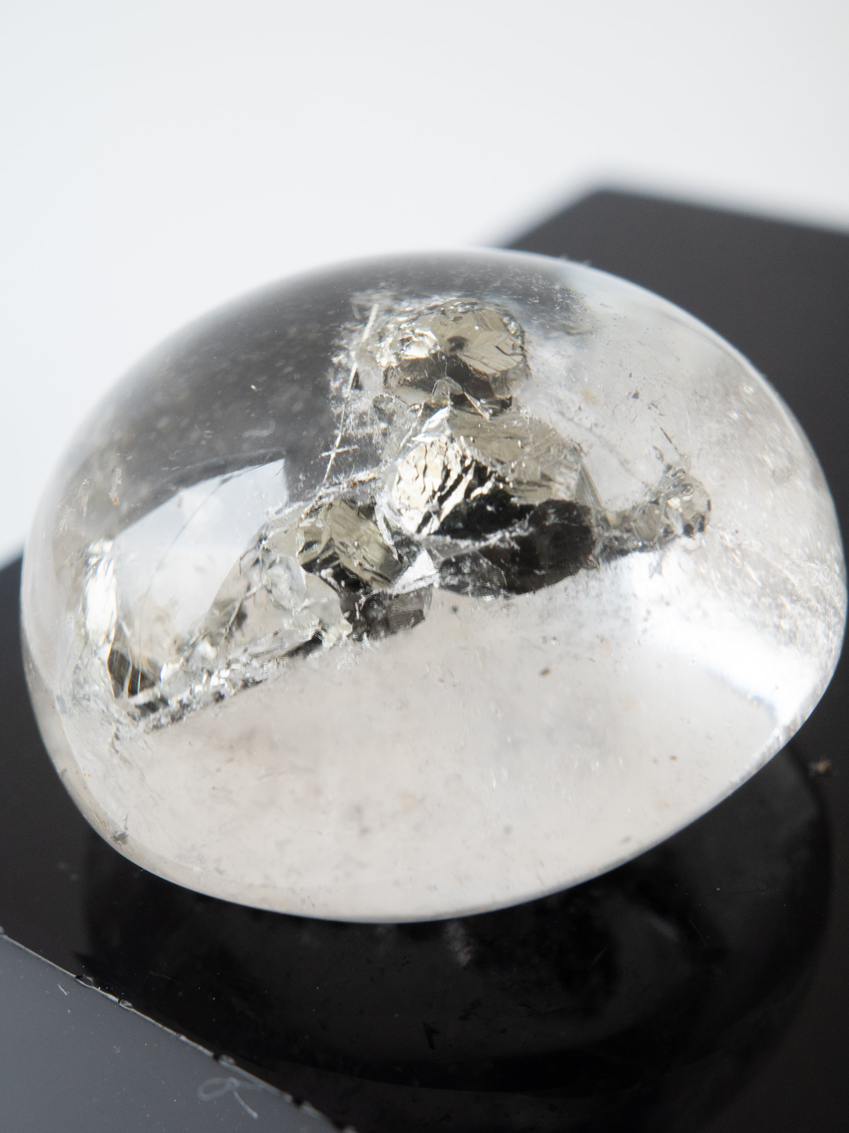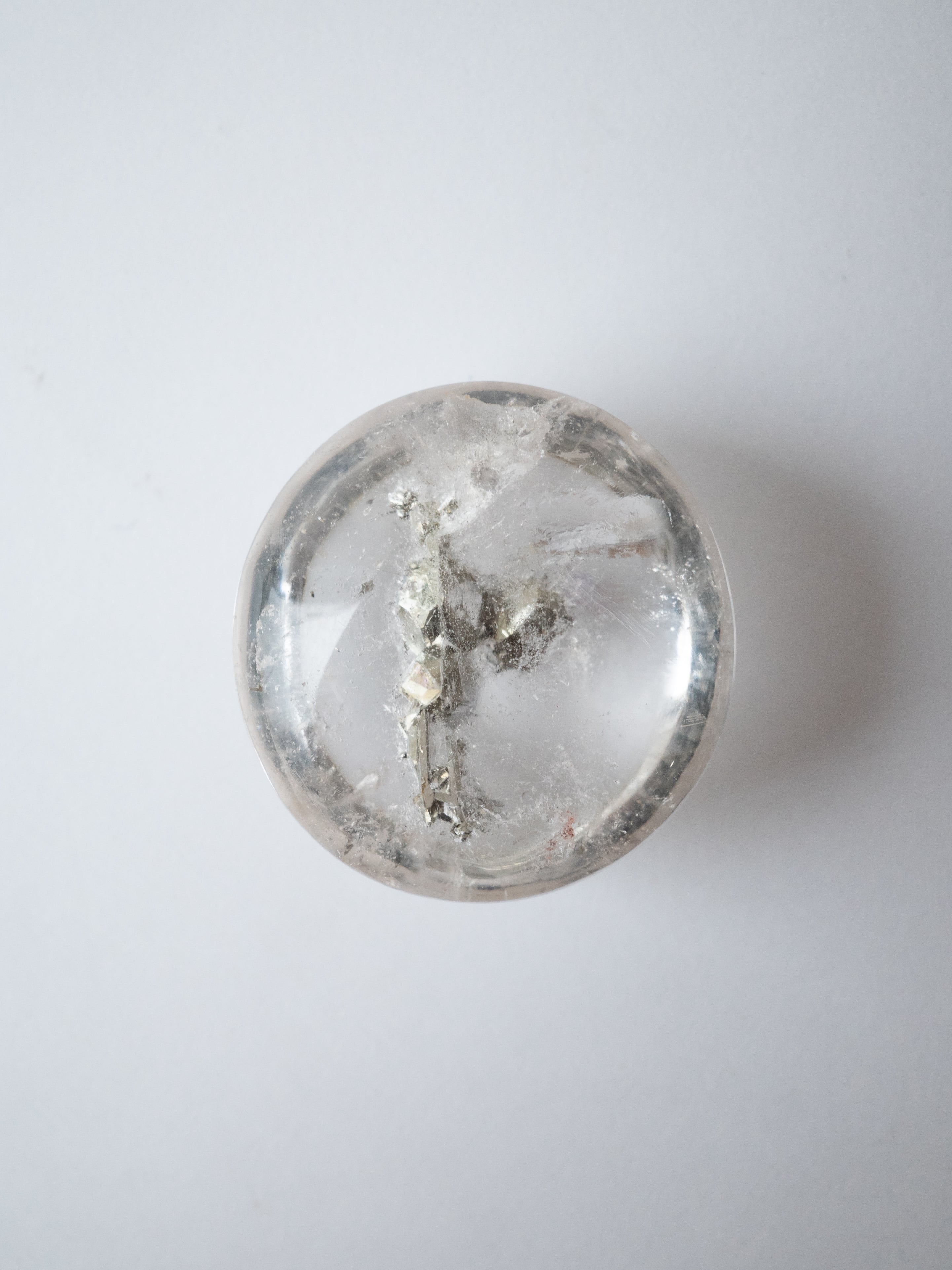The word “py” comes from Greek and means “fire,” reflecting its historical use as a fire-starting stone. As pyrite is a sulfide mineral, it is prone to oxidation and can rust when kept in its raw form. However, when it is enclosed within quartz, the crystal remains beautifully preserved, allowing its brilliance to be enjoyed for years to come.