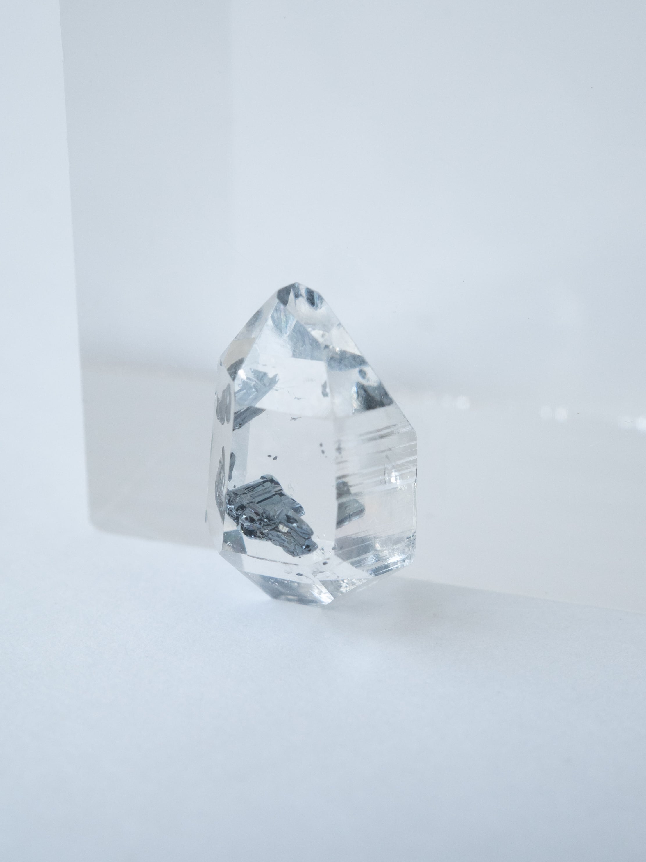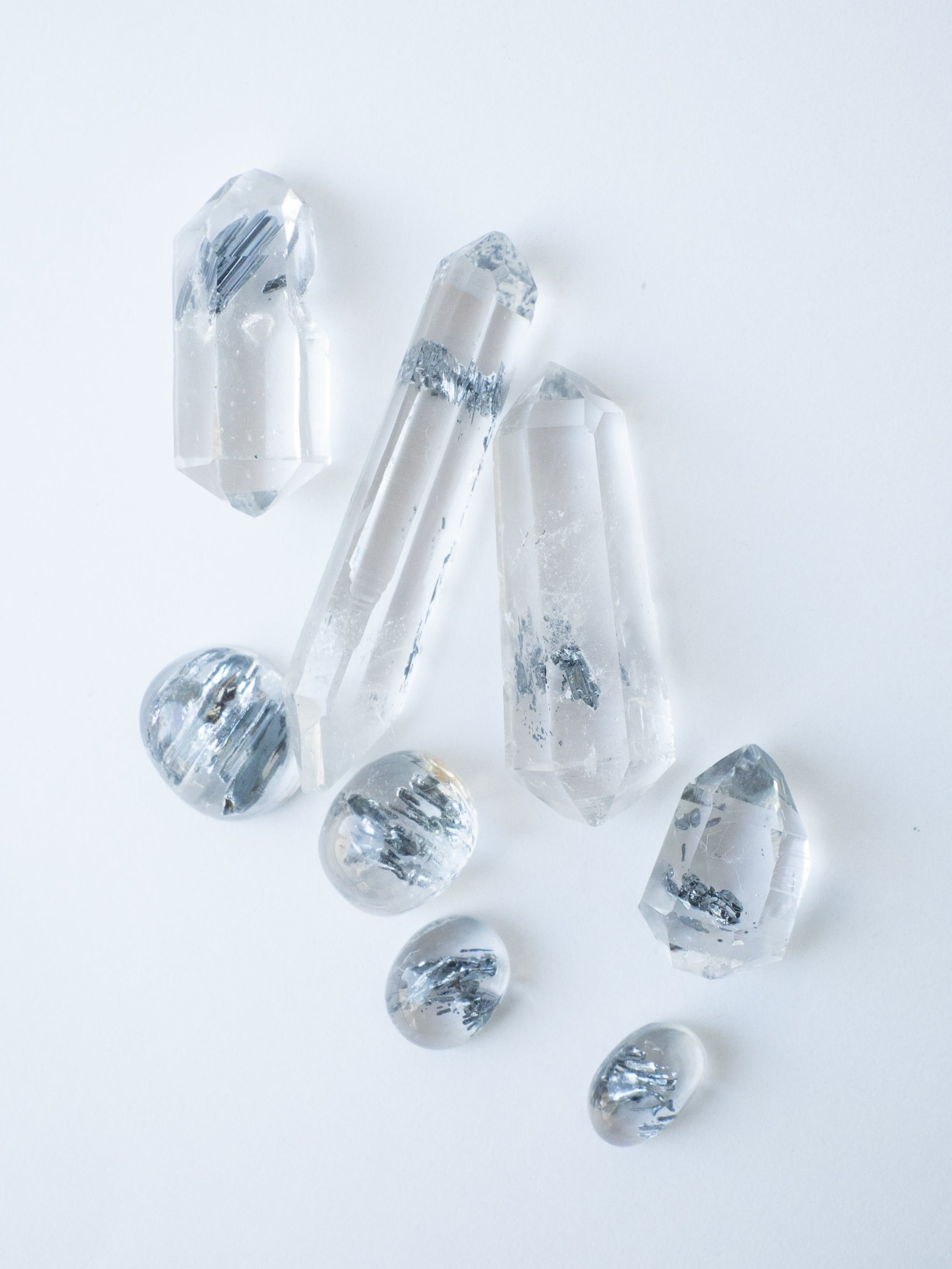 スティブナイトインクォーツ(Stibnite in Quartz)は、石英の中に針状や柱状のスティブナイト(輝安鉱)結晶が含まれるクォーツです。黒銀色の光沢と、剣のような結晶の形状が特徴的で、産出地域が限られるため、流通量も非常に少ない天然石です。
