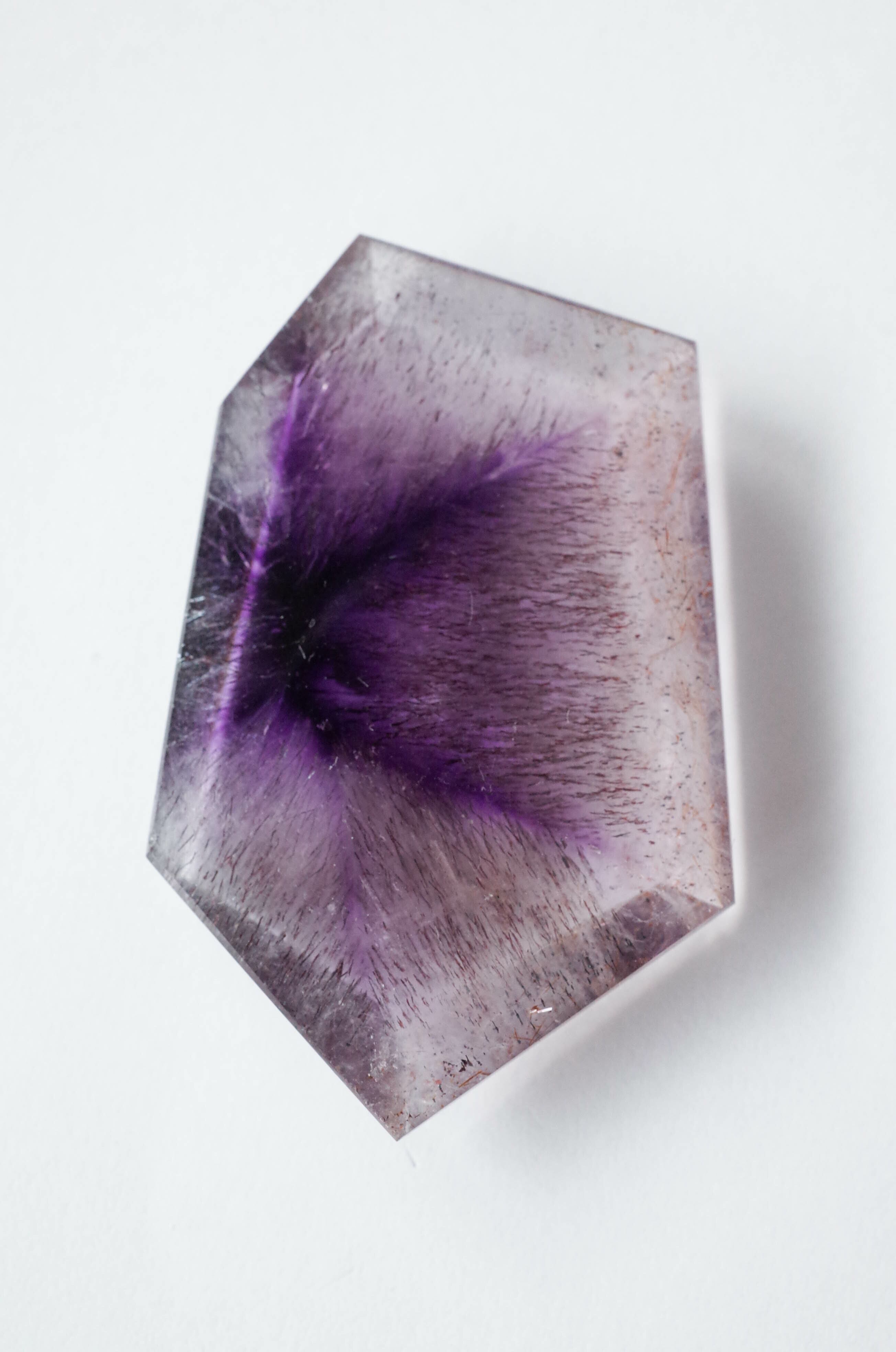 アメシストがトラピッチェ模様に入った美しい六角形の結晶スライス。その他にゲーサイト、レピドクロサイト、などが内包されたクォーツです。クォリティーが高く、それぞれのインクルージョンが合わさって、直線的なカットと柄の良さを引き立てています。