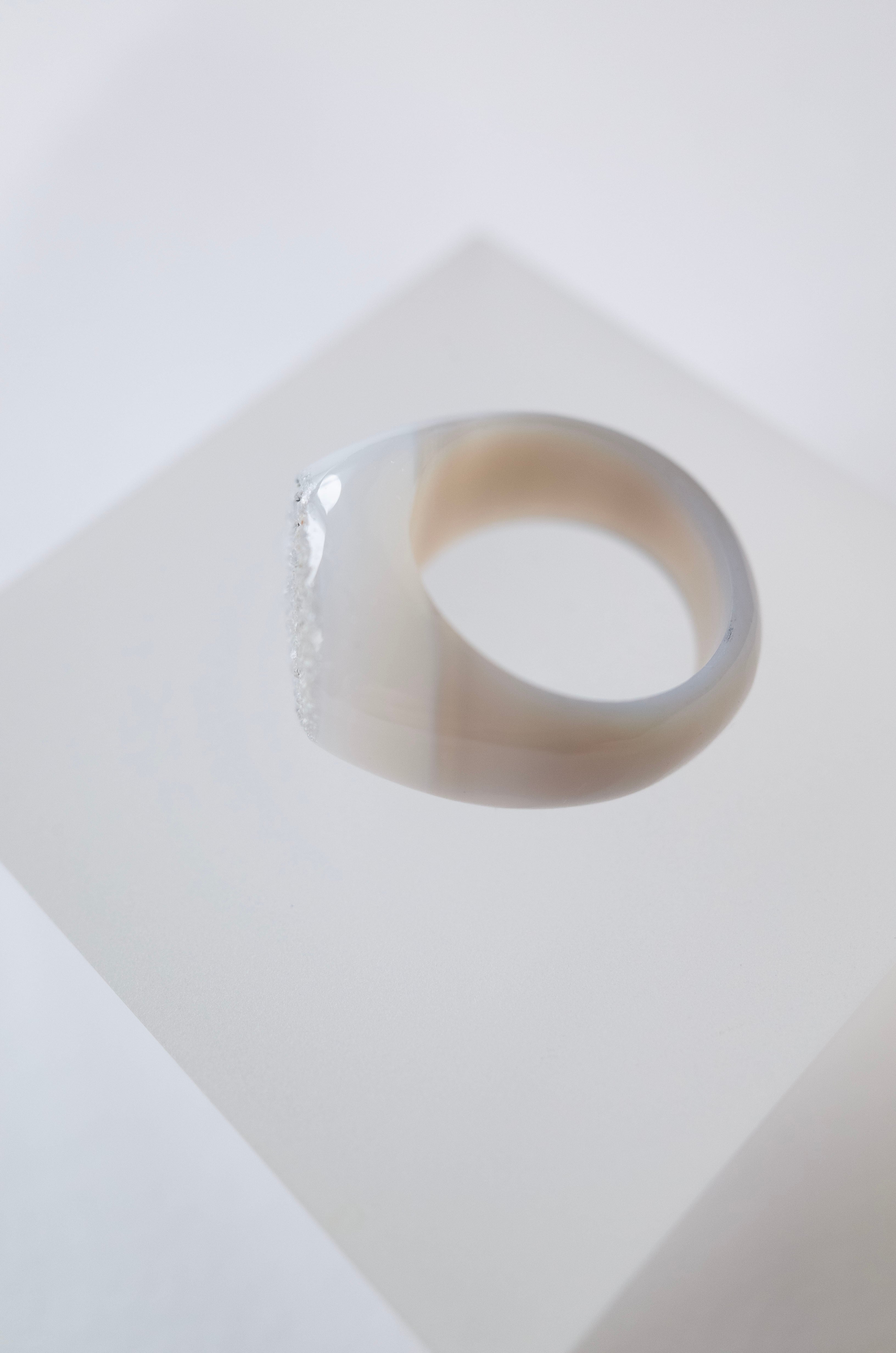 ドゥルジーアゲートをそのままくりぬいて作った指輪です。使いやすいニュートラルカラーで、晶洞の部分がパウダースノーのように細かくキラキラしています。地金のリングと重ね付けしたりと普段使いしやすいサイズ感です。