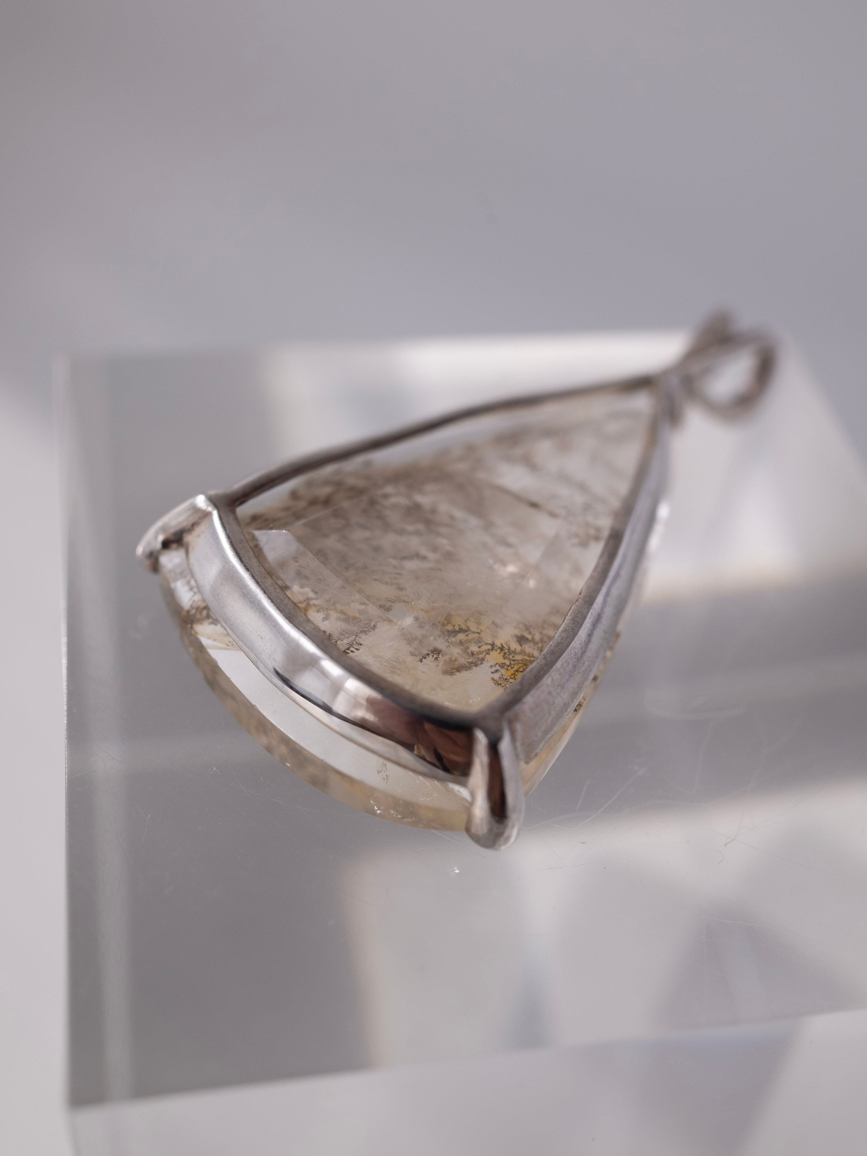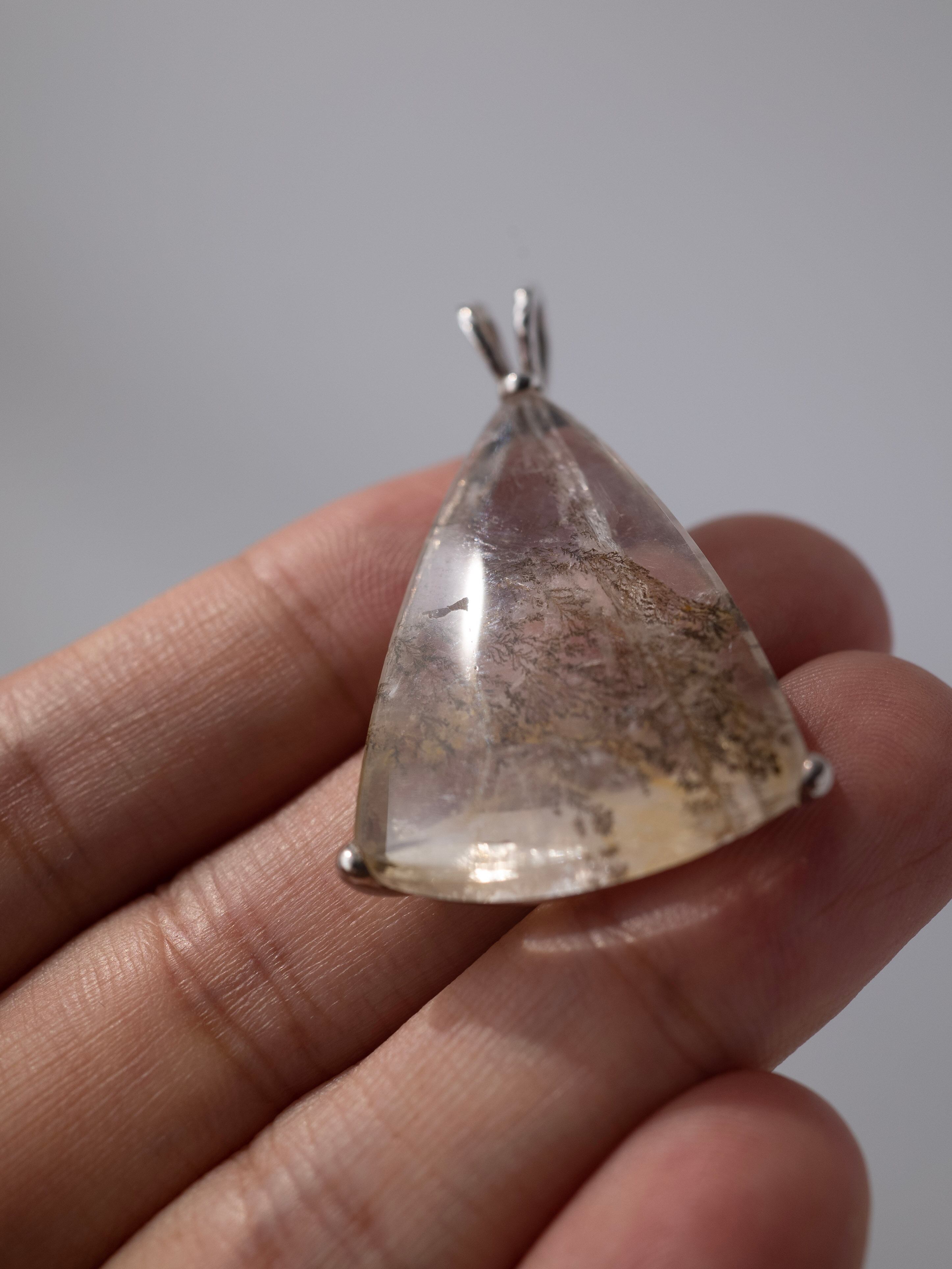 まるで水晶の中に植物を閉じ込めてしまったかのようなデンドリティッククォーツ。アゲートやオパールを母岩とするものもあり、総称でデンドライトとも呼ばれています。こちらはシルバー製のペンダントトップとしての販売です。