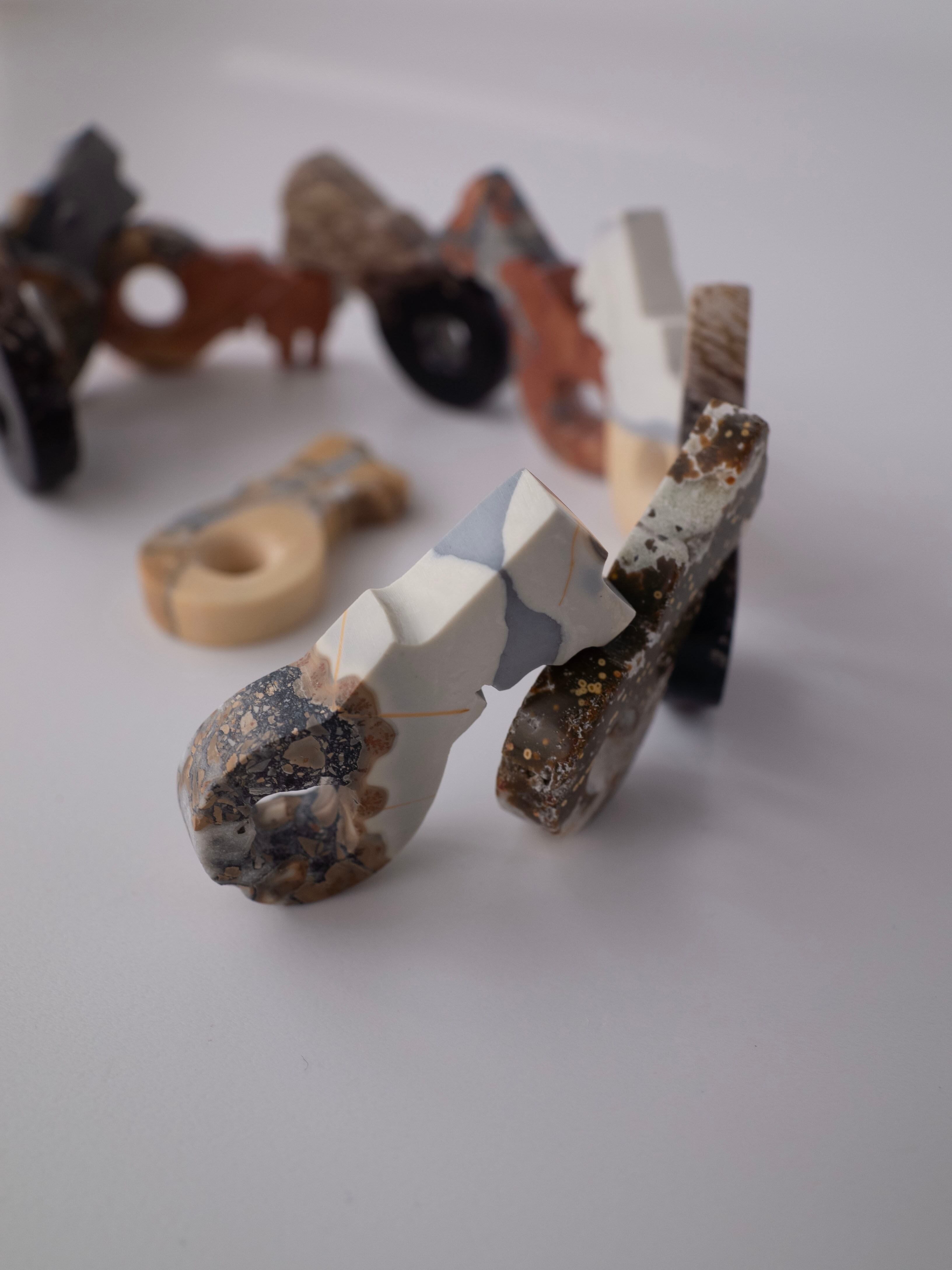 こちらは模様が面白い石を選びカギのモチーフでカットしたマリガノジャスパーです。インドネシアで手作業でカットしているため細かなディティールは不完全な部分もありますが、それも味と思って楽しんでいただければ幸いです。