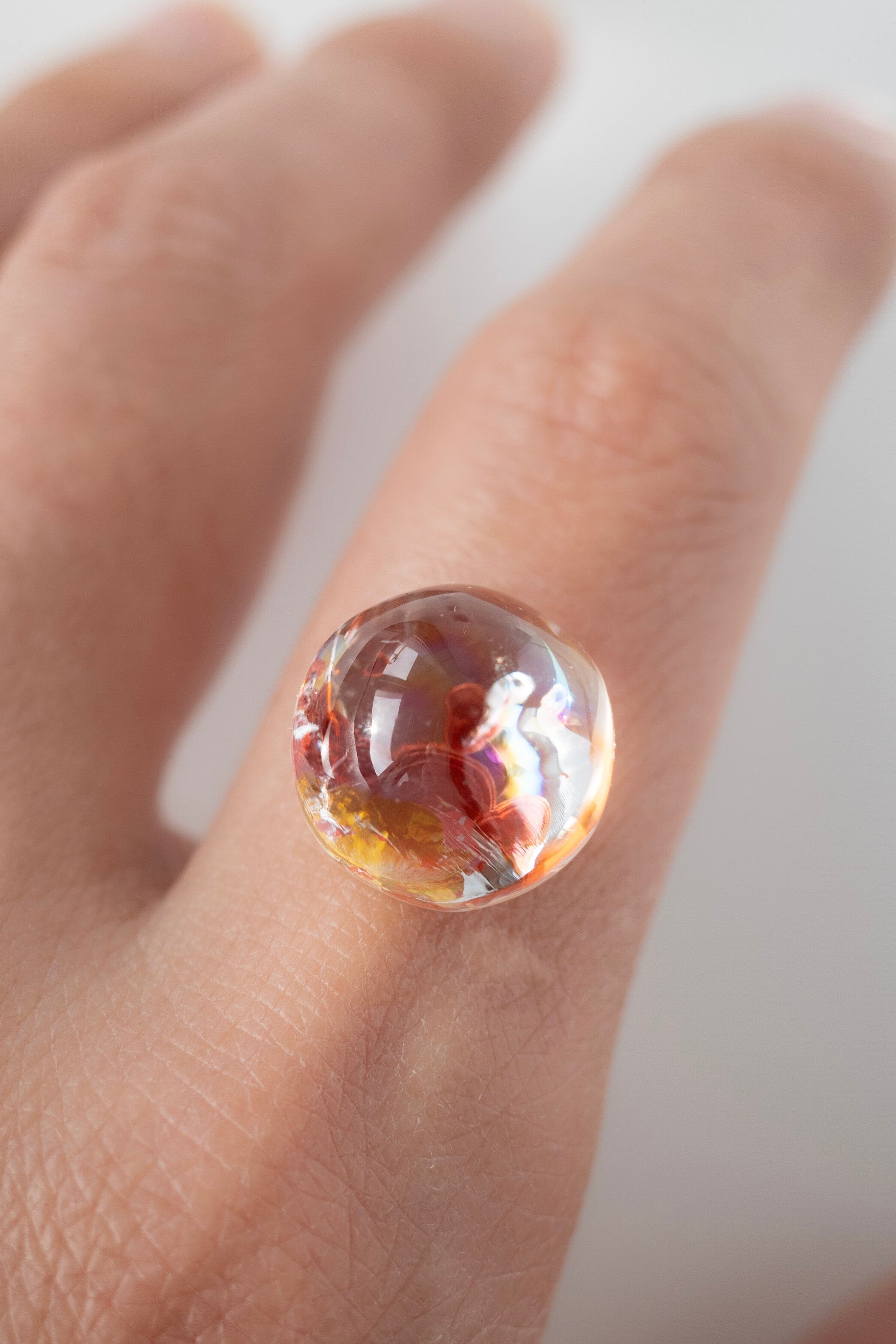 赤と黄色のコントラストが美しいオーロラクォーツ。波打つような模様も魅力です。写真にて写りませんが全体に虹が見られます。