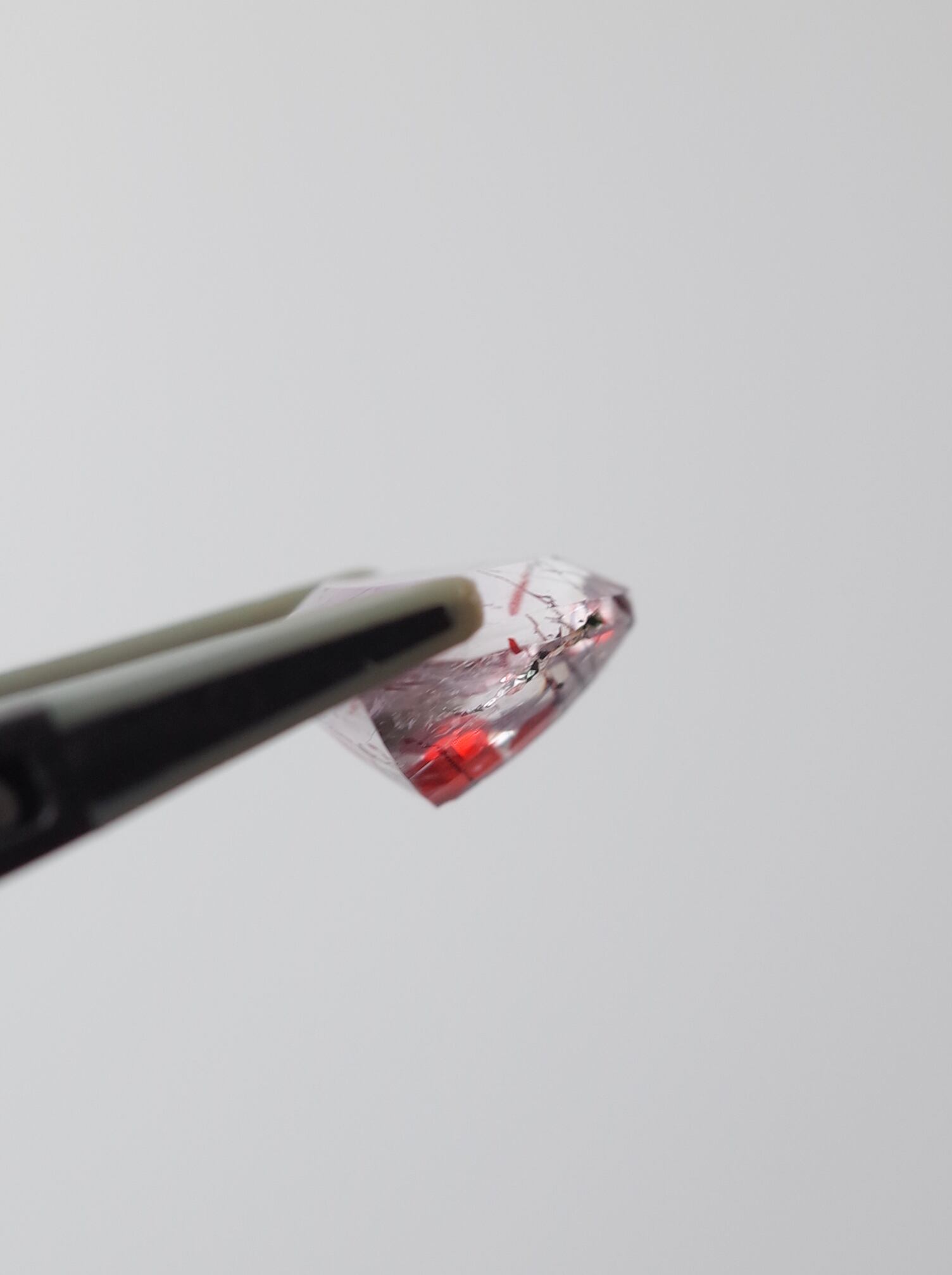 透明度が高く真っ赤なインクルージョンがキラキラと輝く魅惑のレピドクロサイトインクォーツ。その容姿から、流通名としては「ファイヤークォーツ」「ストロベリークォーツ」などとも呼ばれています。