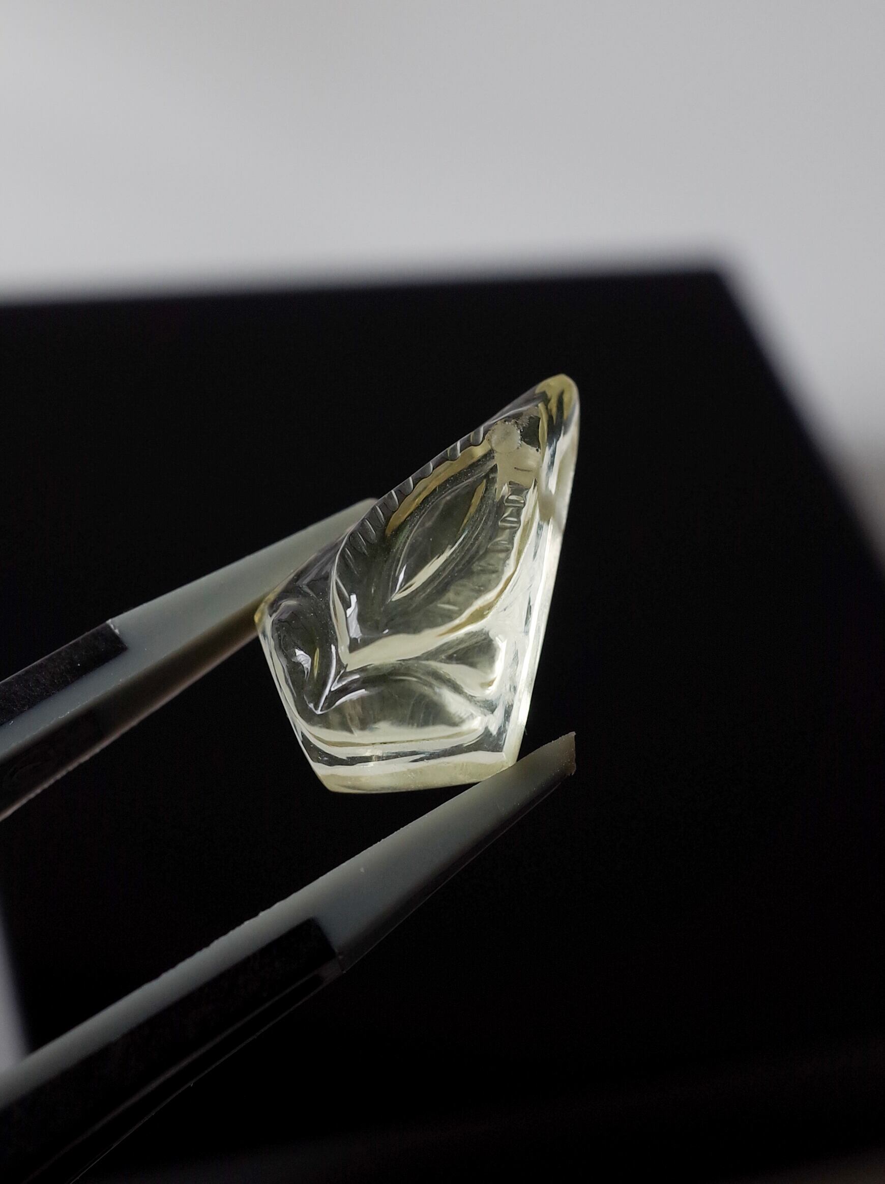 カービングのレモンクォーツ。前後の方向で貫通穴が空いています。模様や形、高さはそれぞれ異なります。アシンメトリー、または単体でお使いください。