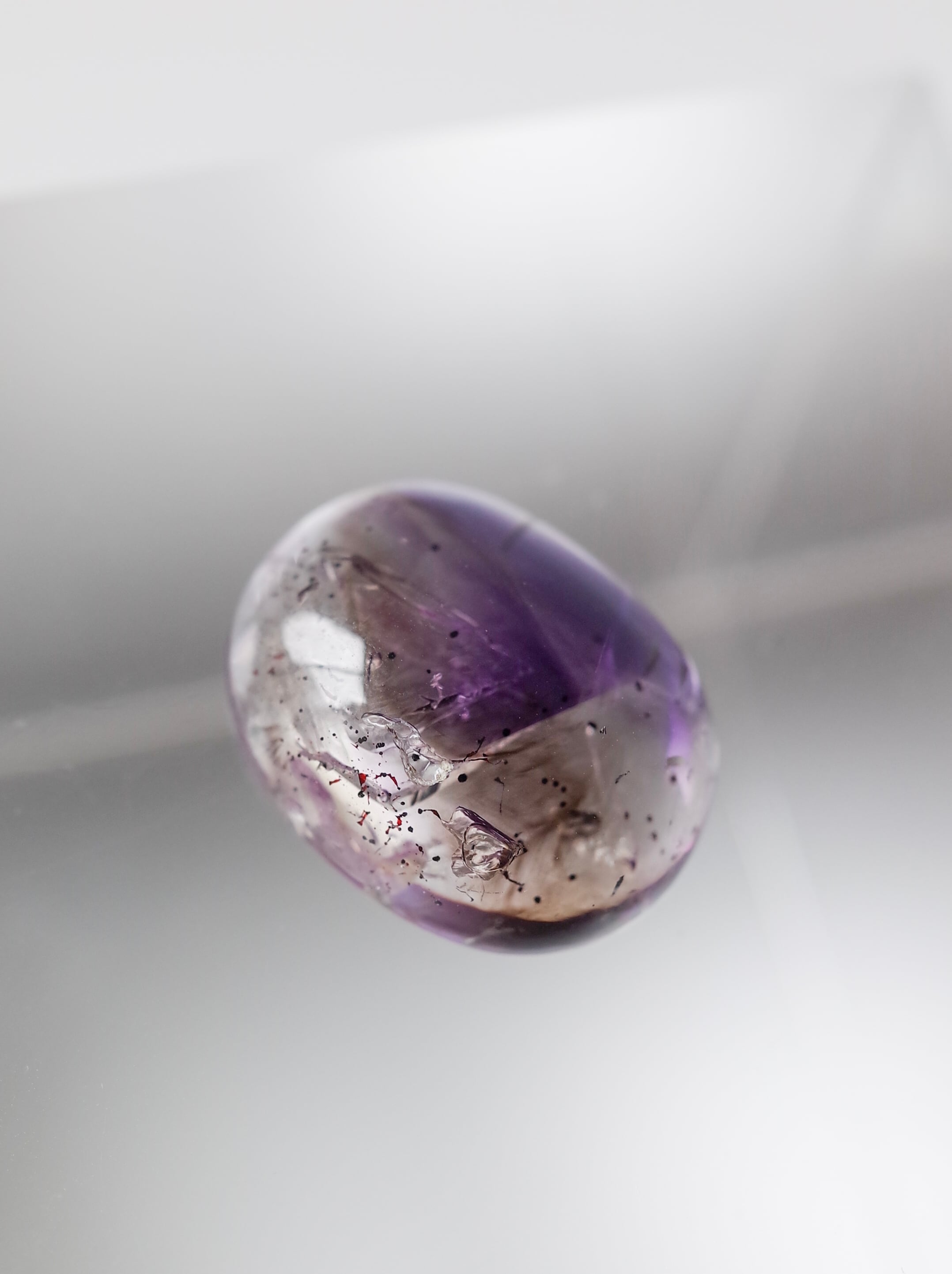 マダガスカル産の水入りアメシスト。美しい色のムラだけでなく、スモーキーになっていたりレピドクロサイトが入っていたりする珍しいタイプです。もちろんこの水は数万年〜数億年も前のものという事になるので、そんな地球の神秘にロマン感じる人が多いのも納得です。