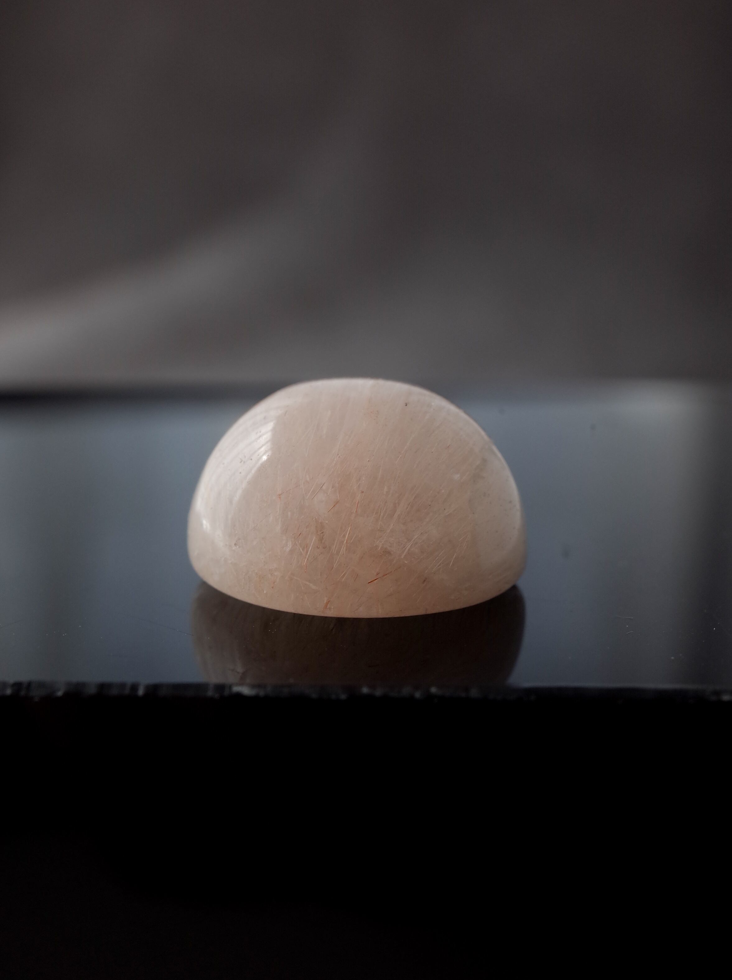 白い繊維状の結晶が毛並みのようで可愛らしいアンフィボールインクォーツのルースです。