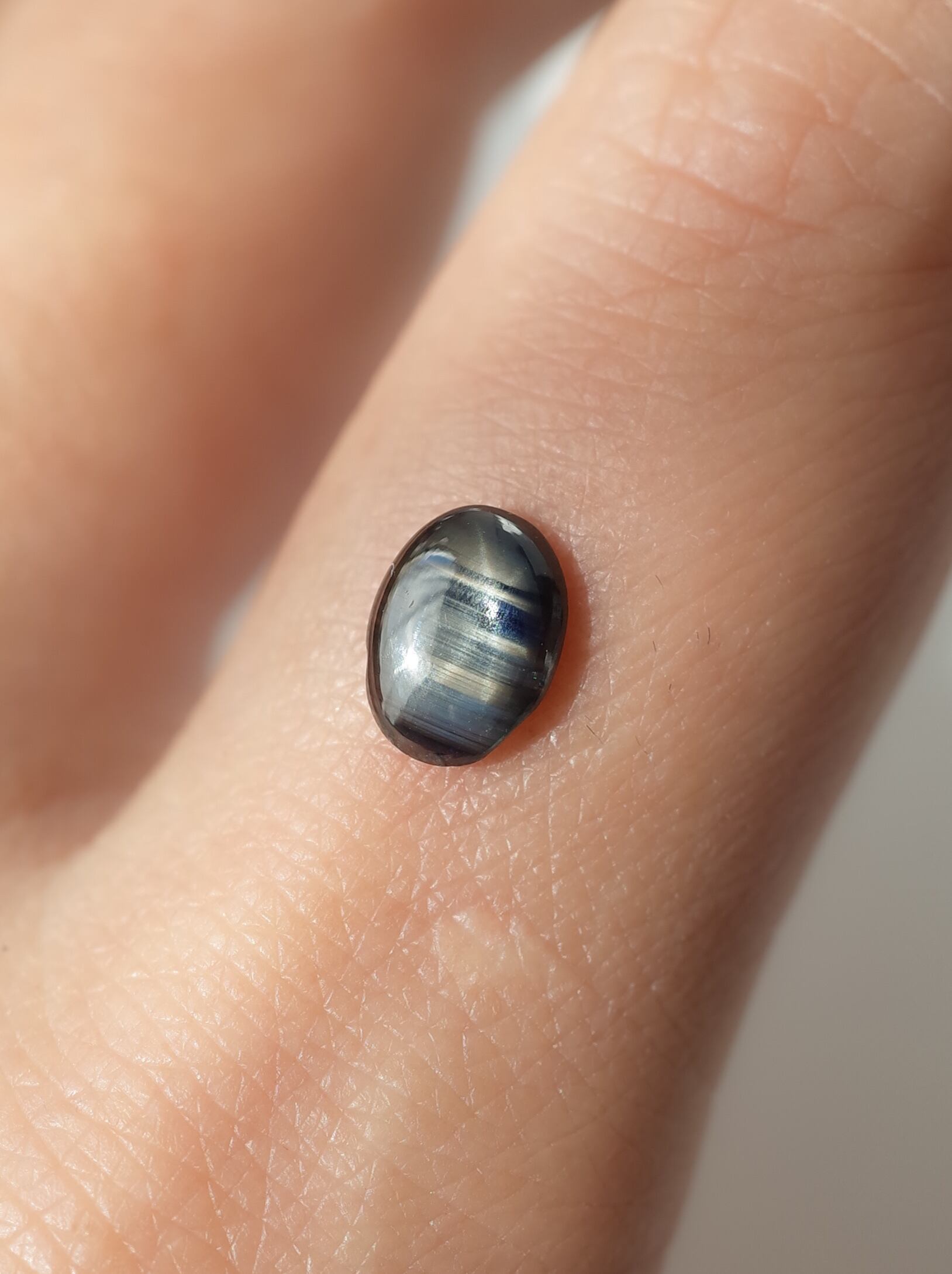 タイのサイファア産地の一つであるバンカチャ産のスターサファイアで、通称この産地のものは『バンカチャサファイア』と呼ばれています。現在は採掘量が非常に少なく、SELSHA でも買い付けの度に馴染みのディーラーから、オールドストックや新たに採掘されたものを含めて少しづつ譲ってもらっています。スター効果が見られるだけでなく、コランダムの成長線やブラウン ~ グリーンの色のコントラストが魅力的なものをセレクトしています。