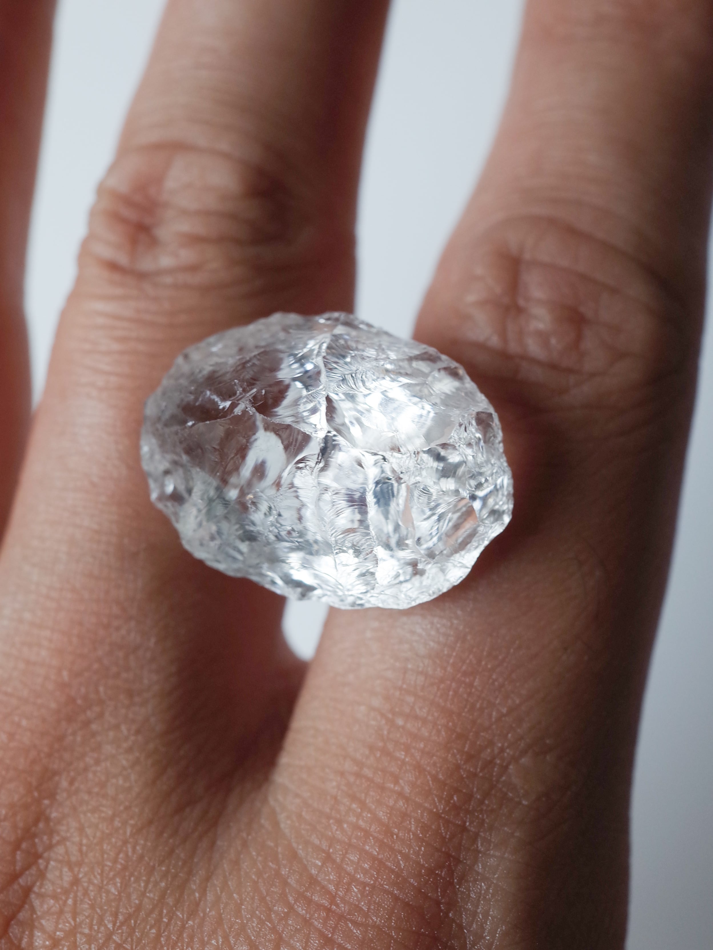 山梨県甲府市で伝統的に行われてきた「かっこみ」という技法。職人がタガネややっとこを使って原石を切り出していくことから『かっこみ水晶』と呼ばれています。こちらのルースは研磨まではせず、劈開が作り出す表面の凹凸をそのまま残しているのが独特の魅力です。