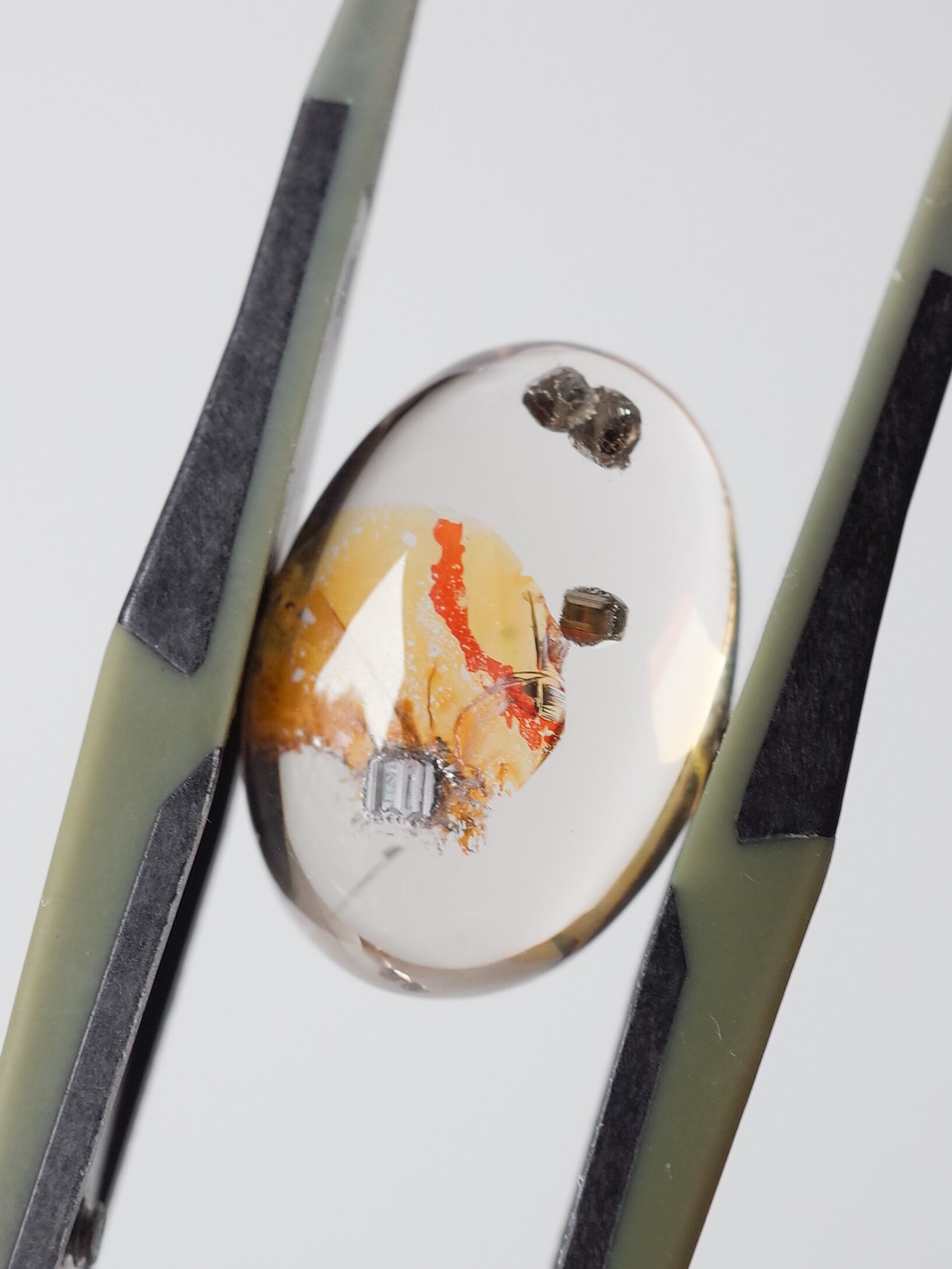 このルースの面白いところは、赤い部分のヘマタイトと黄色部分のリモナイトも一緒に入っていて、まるでパイライトから湧き出ているような不思議な空間を作っているところです。